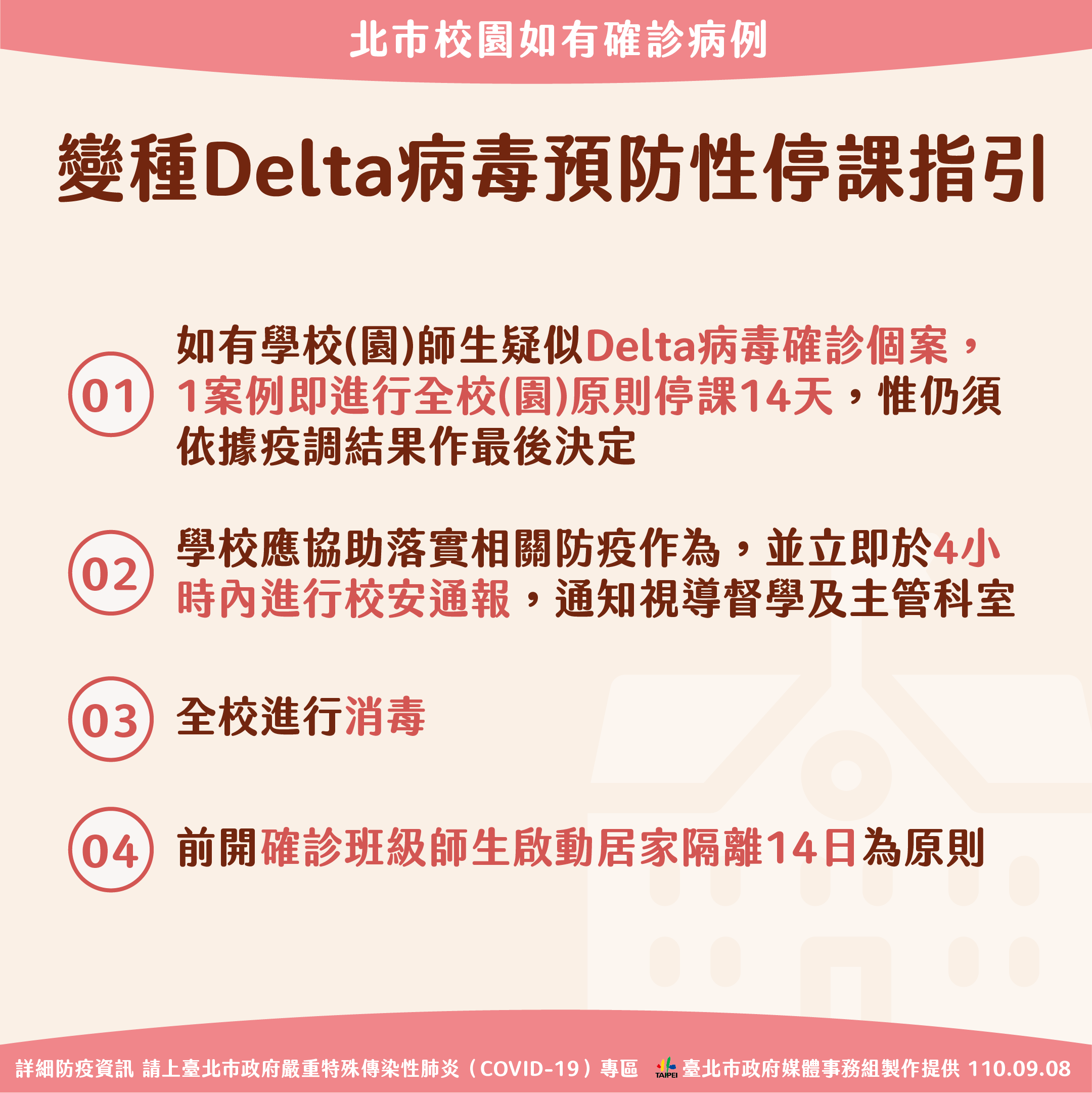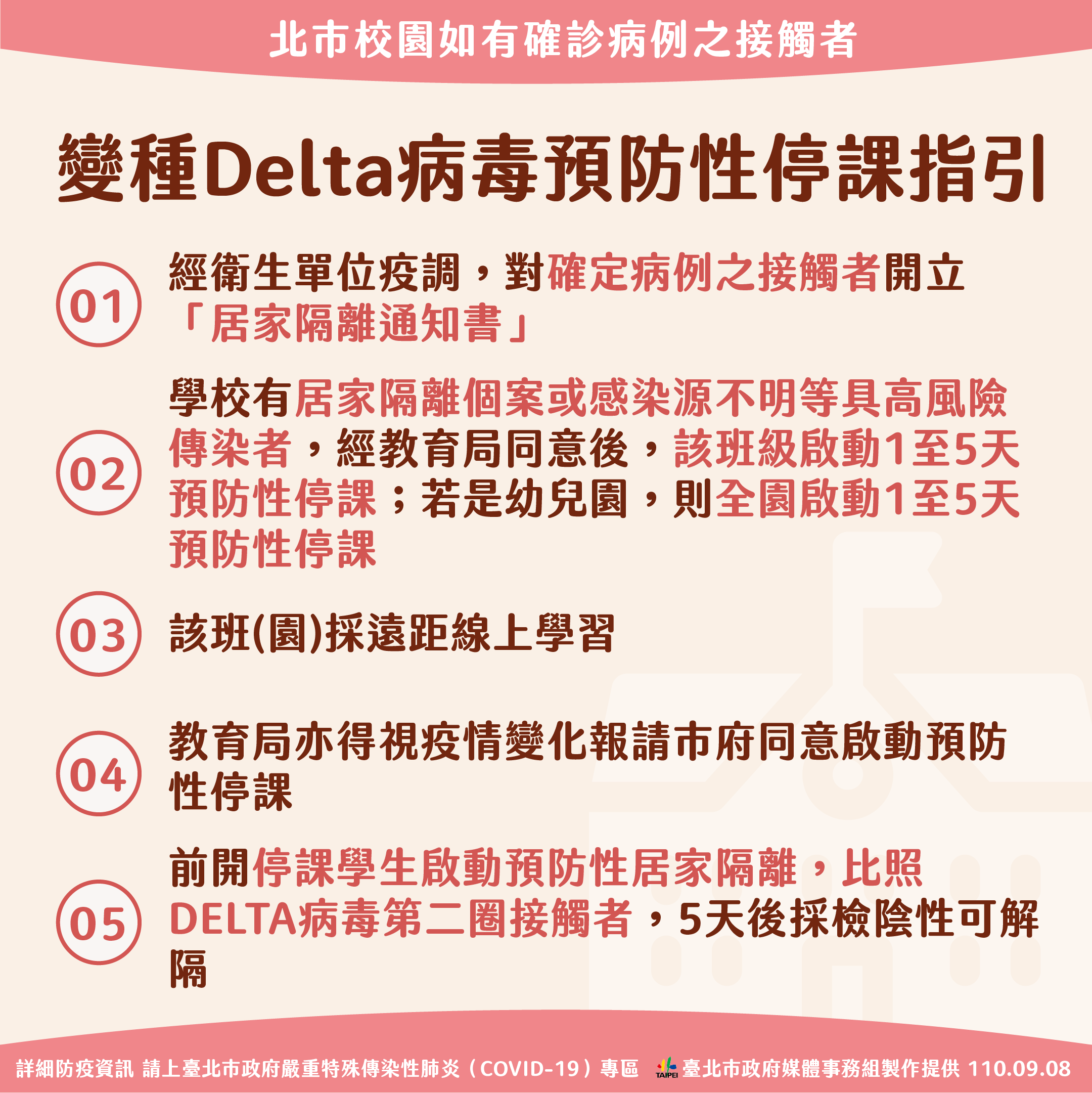 依據110年9月8日台北市政府公告「因應變種Delta病毒預防性停課指引」,若 貴子弟與同住家人為居家隔離者,請務必通知學校並依居家隔離通知書所載之隔離規定落實防護措施,謝謝您的配合。