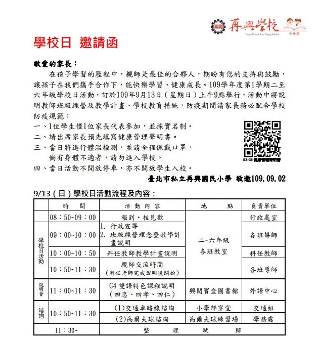 誠摯邀請家長參與109學年度第1學期二至六年級的學校日