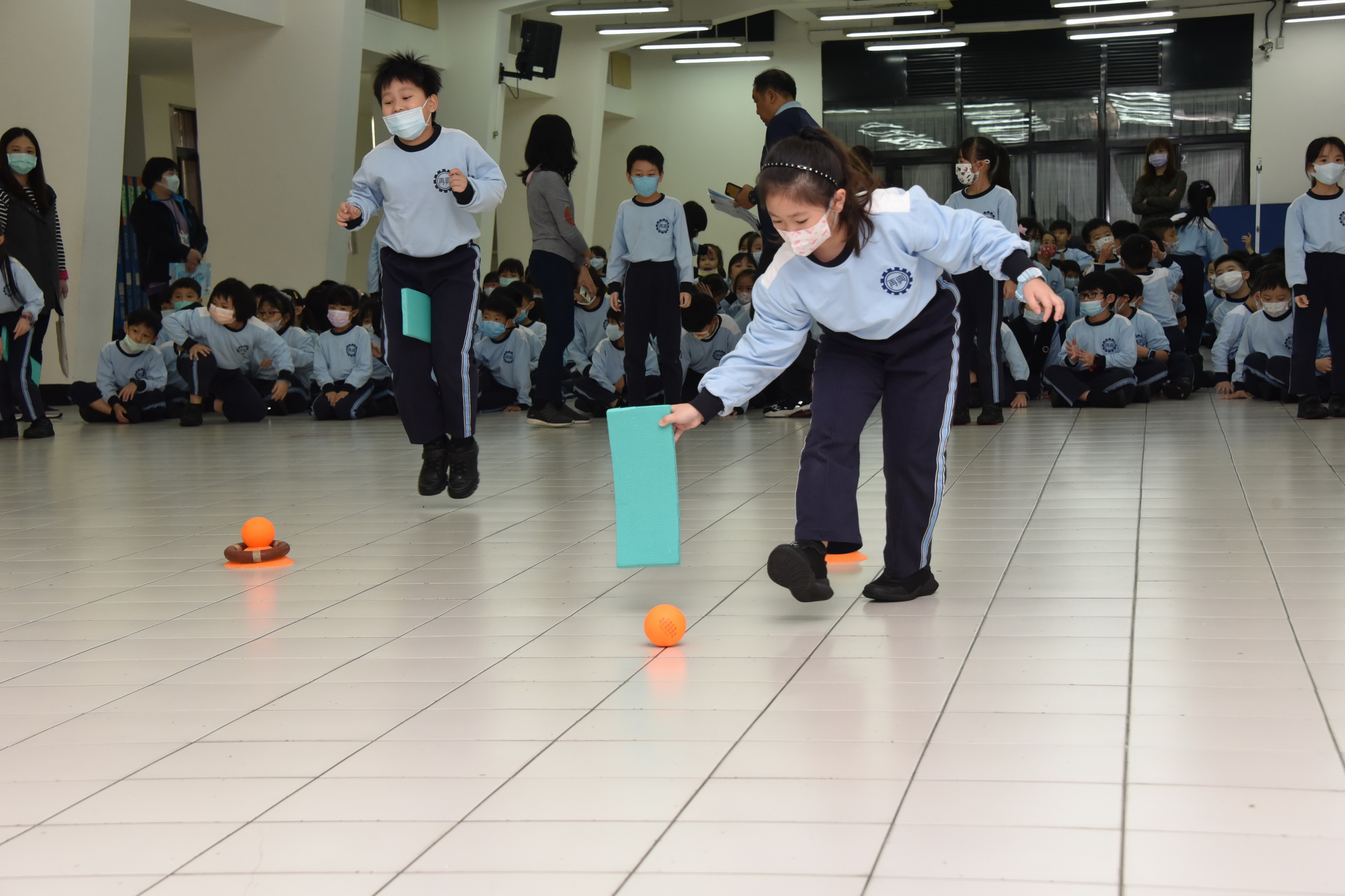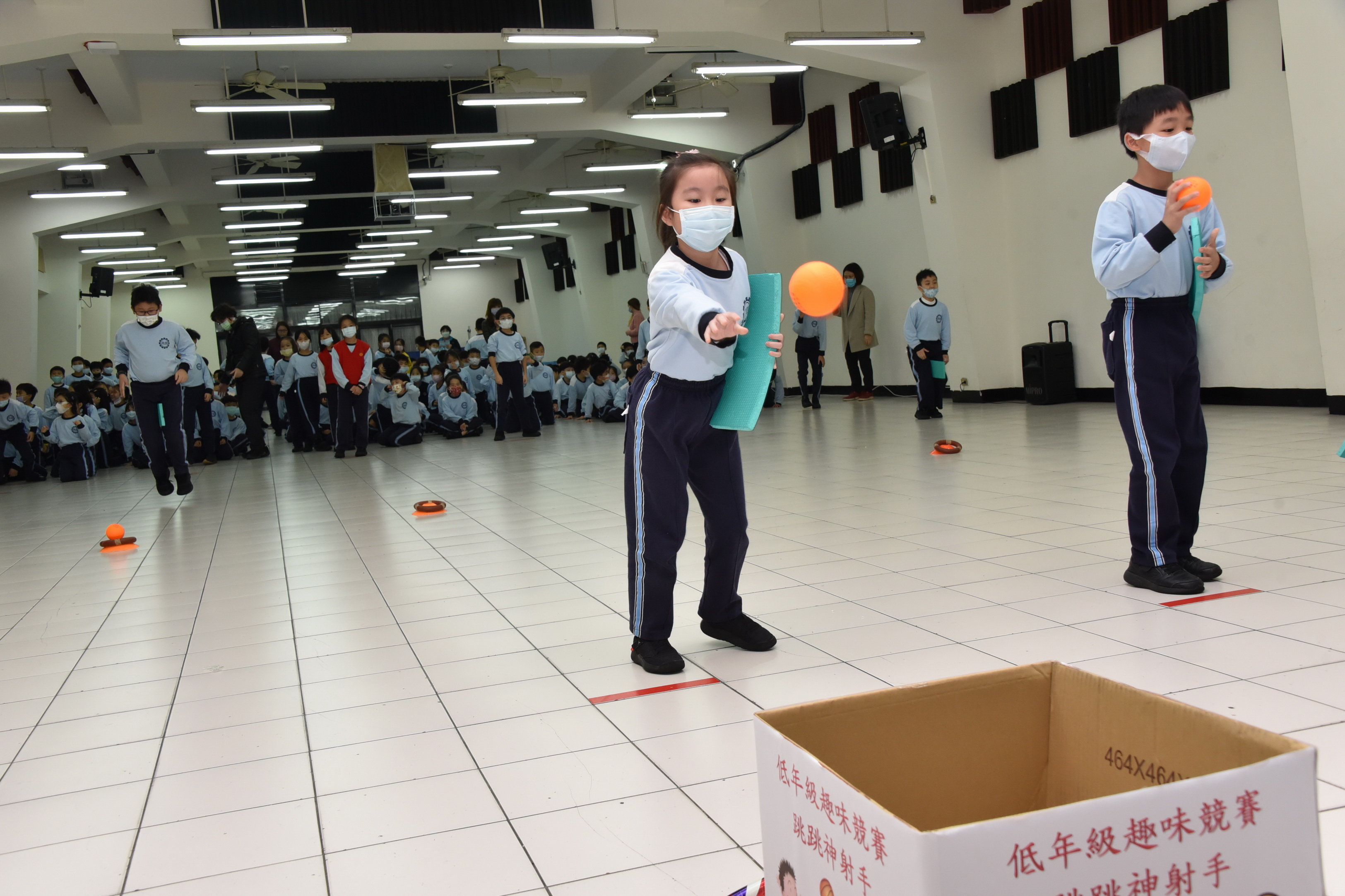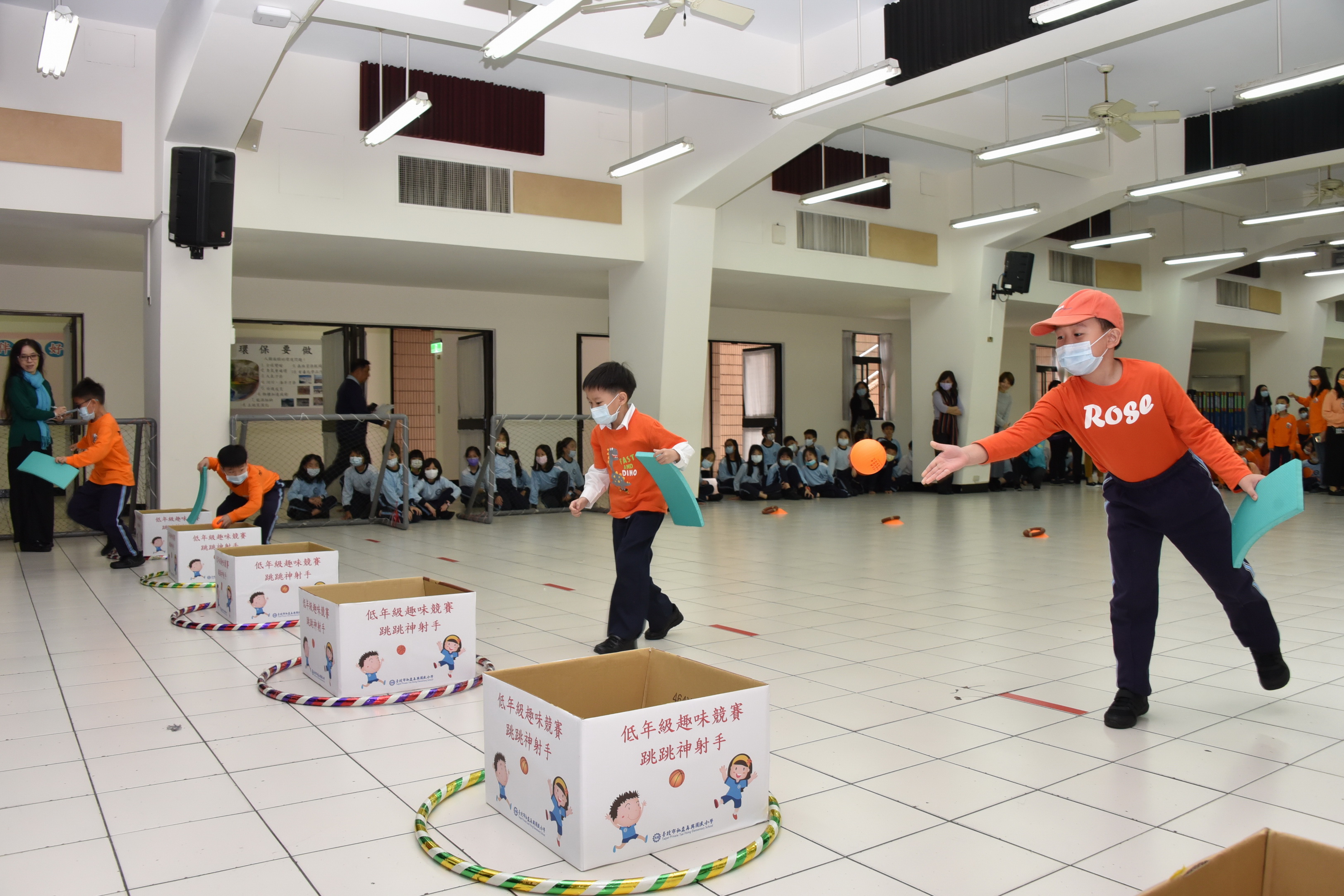 12月9日低年級舉辦跳跳神射手趣味競賽活動,其目的在培養學生身體跳躍及手眼協調的能力,活動內容為:透過三個關卡雙膝夾板子做跳躍的動作至下一個關卡再用板子將球往前撥至前方投擲線,將球投進箱子中,返回時,以跑步的方式讓學生享受奔跑的樂趣,各班展現棄而不捨的精神與合作的態度爭取班級的榮譽,活動中學生在開心歡愉的氛圍中圓滿落幕。