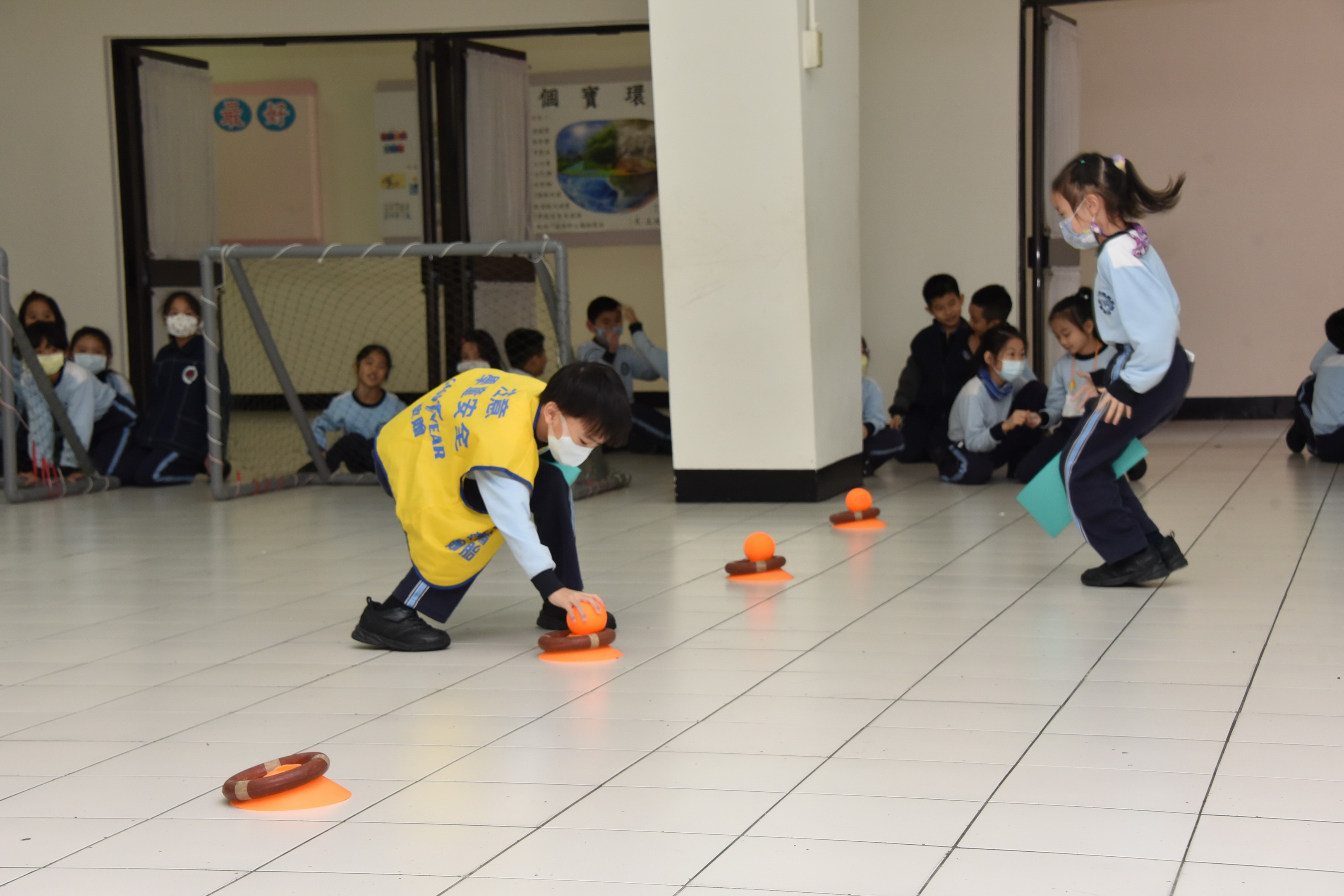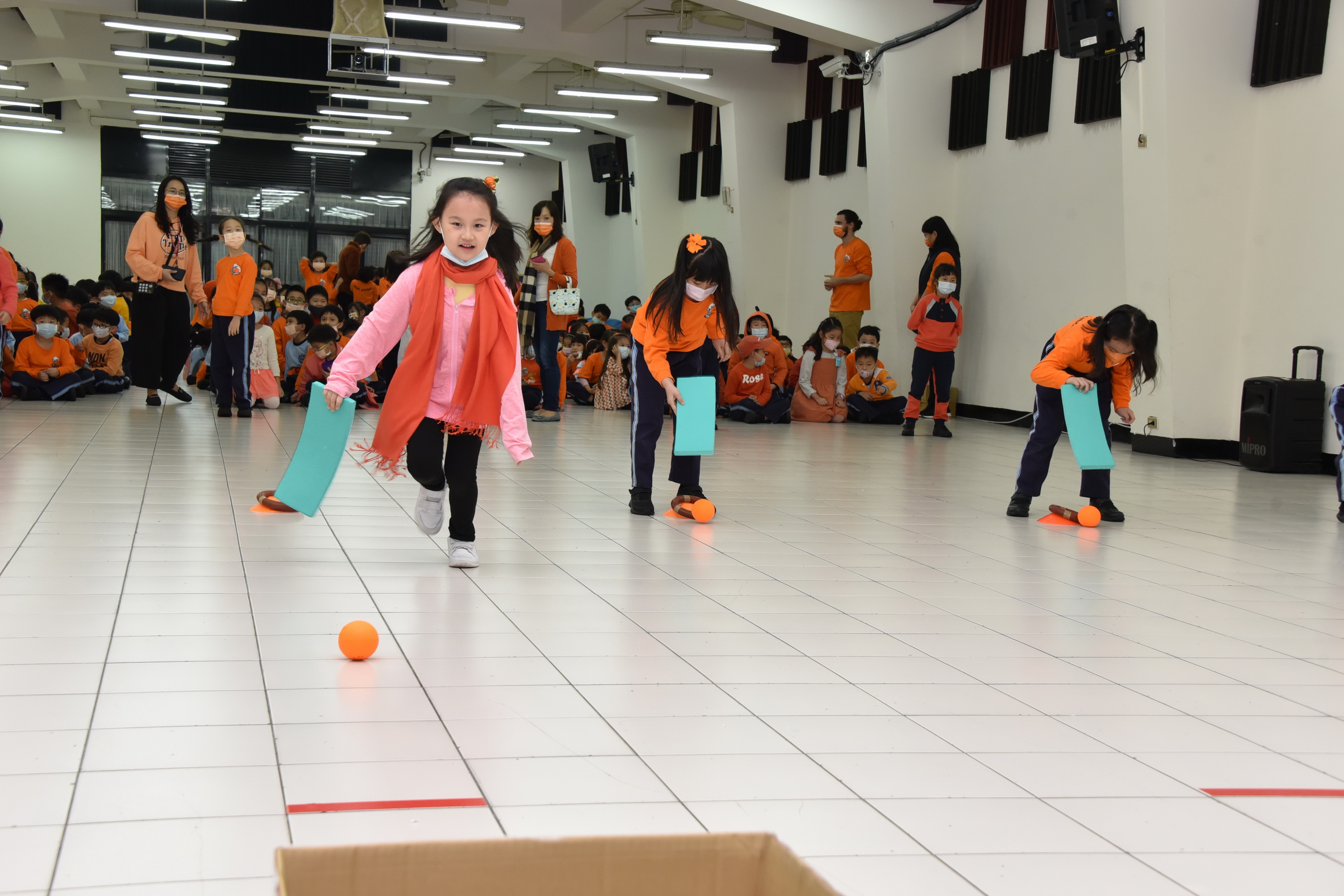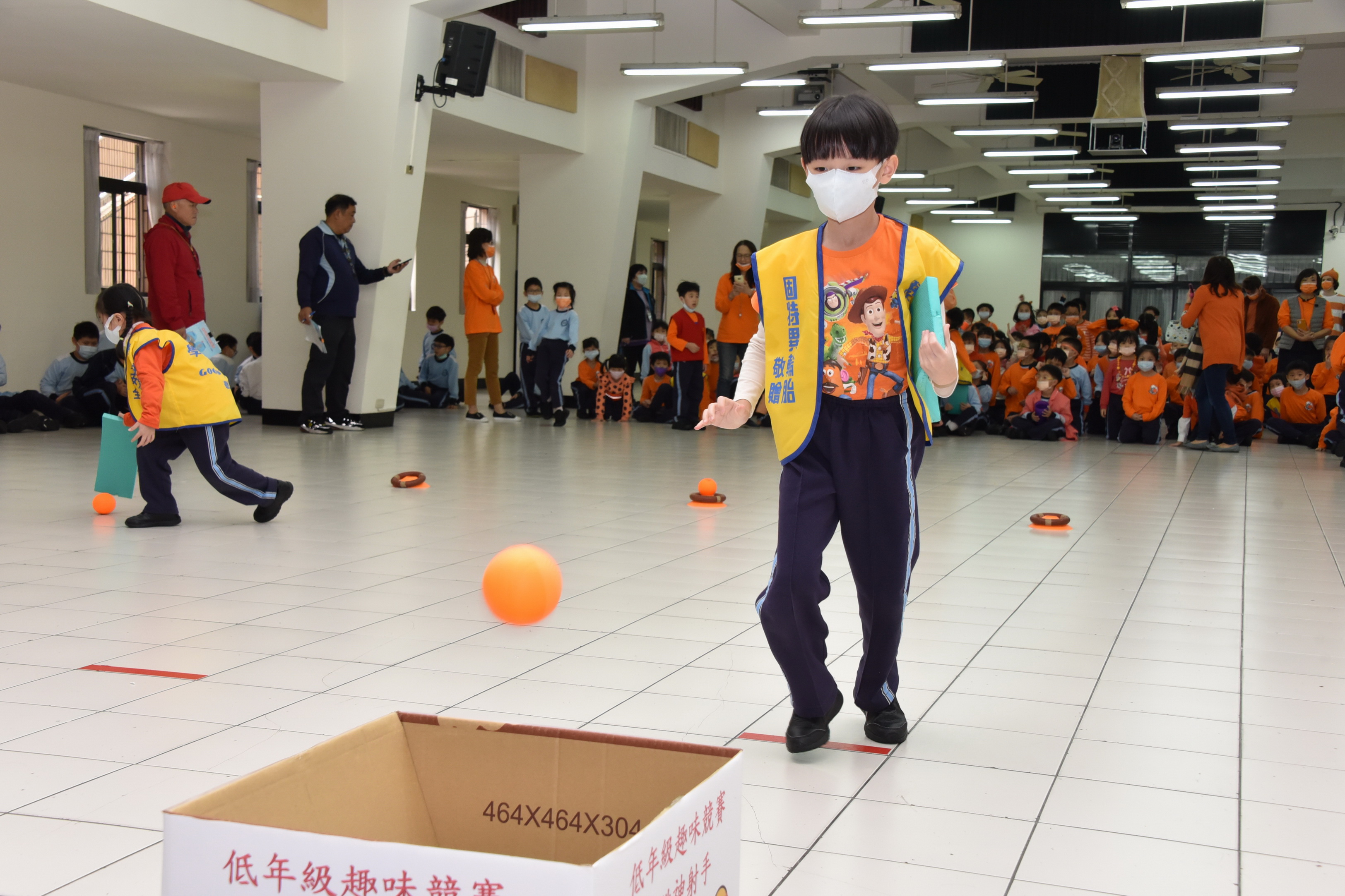 12月9日低年級舉辦跳跳神射手趣味競賽活動,其目的在培養學生身體跳躍及手眼協調的能力,活動內容為:透過三個關卡雙膝夾板子做跳躍的動作至下一個關卡再用板子將球往前撥至前方投擲線,將球投進箱子中,返回時,以跑步的方式讓學生享受奔跑的樂趣,各班展現棄而不捨的精神與合作的態度爭取班級的榮譽,活動中學生在開心歡愉的氛圍中圓滿落幕。