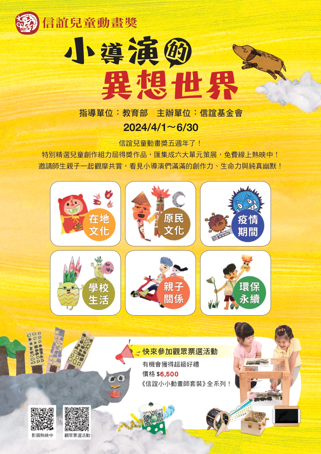 財團法人信誼基金會 「2024小導演的異想世界線上影展」免費線上影展活動 一、由信誼基金會主辦之「2024小導演的異想世界線上影展」自4月1日起至6月30日於線上免費放映,為期三個月的策展時間,打破空間、時間限制,讓更多大小朋友能欣賞來自台灣小學生的動畫創作。 二、「信誼兒童動畫獎」兒童創作組徵獎迄今滿五週年,本次「小導演的異想世界線上影展」特別匯集兒童創作組歷屆得獎作品,主題涵蓋在地文化、原民文化、疫情期間、校園生活、親子關係、環保永續等六大單元,歡迎各校老師及教育工作者運用豐富的影像資源,結合教案設計,與學生一起觀摩欣賞、進行深度討論,也歡迎親子共賞。 三、除提供免費觀賞,同步舉辦「觀眾票選活動」,活動分為個人組及學校組,學校組歡迎以班級為單位,邀請老師將學生觀影時的討論、想法和感受,透過文字、圖畫或照片等方式記錄下來,回傳到google表單 ,格式不拘,將有機會獲得《信誼小小動畫師套裝》教學資源一套。 四、「小導演的異想世界線上影展」,請至官方網站觀賞https://animationaward.hsin-yi.org.tw/ChildrenFilm/index.html 五、「票選活動」辦法詳見https://animationaward.hsin-yi.org.tw/ChildrenFilm/vote.html |
