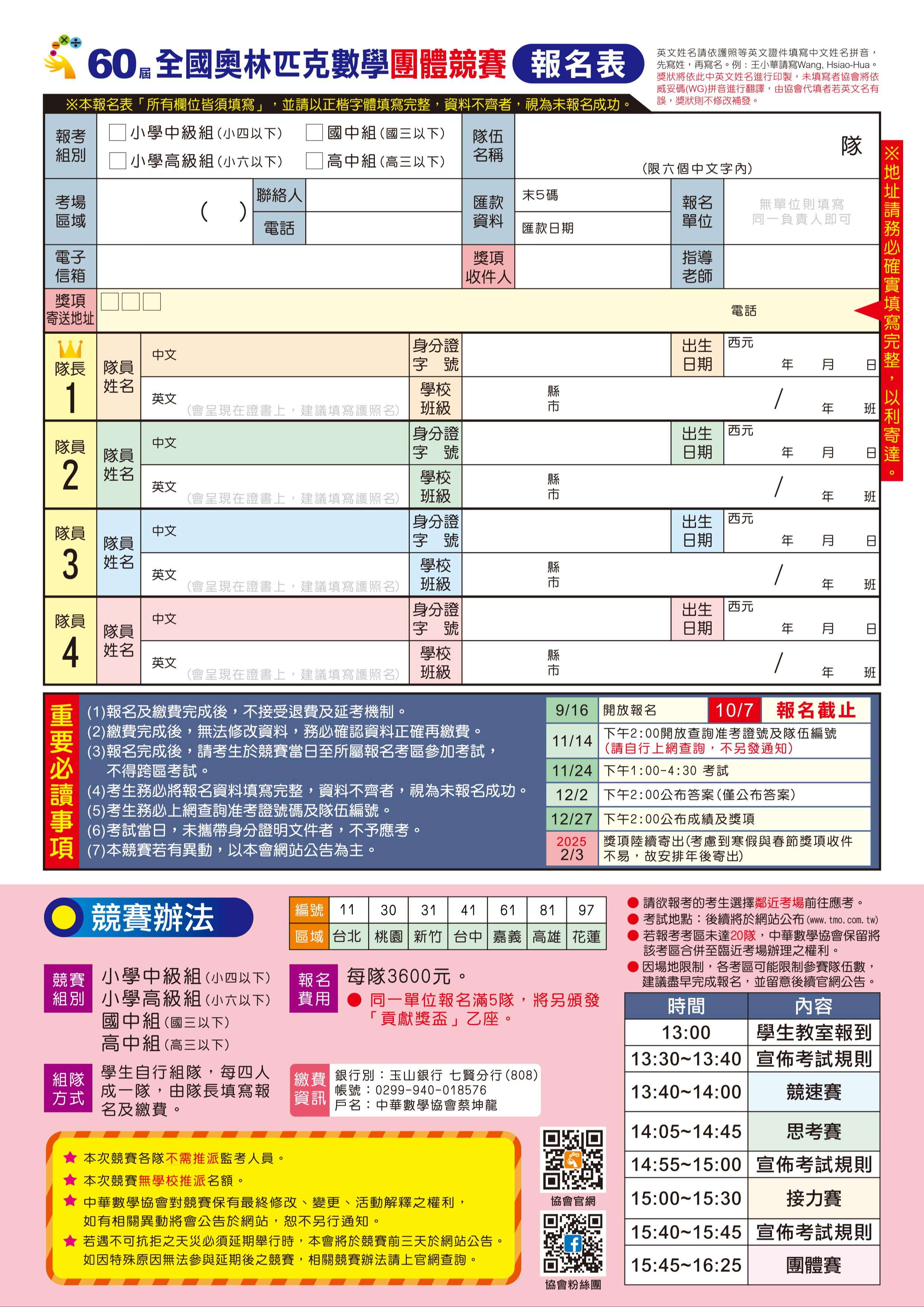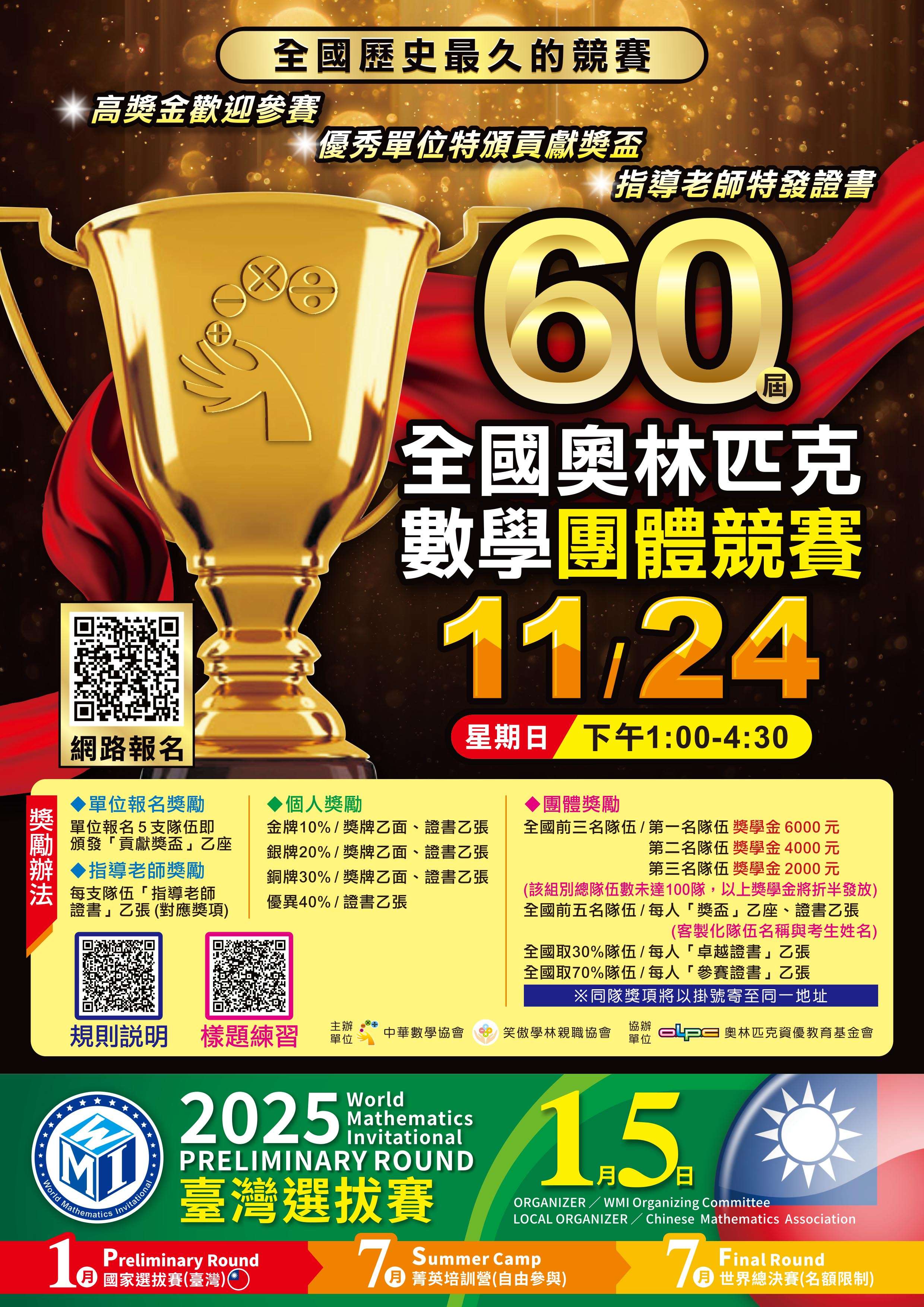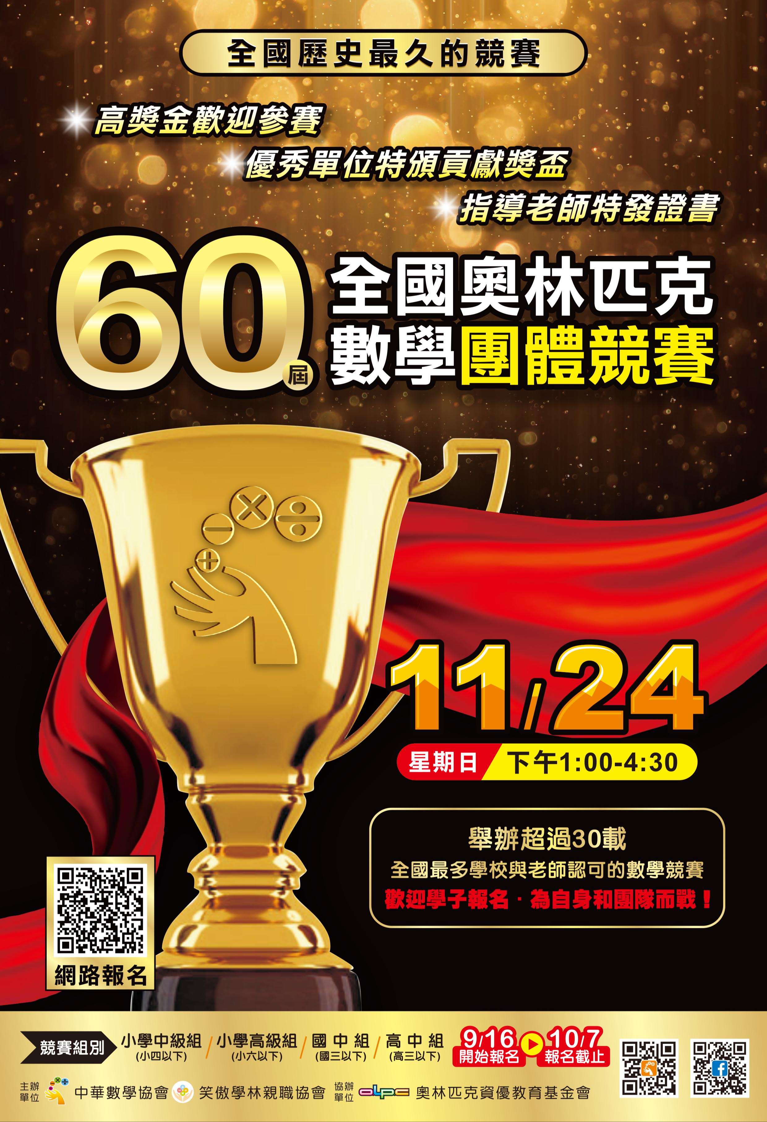中華數學協會 第60屆全國奧林匹克數學團體競賽 一、依內政部九十年三月台內社字第9009557號函暨本會一百一十三年度工作計畫案辦理。 二、檢附競賽活動相關簡章,供參閱。競賽報名的起訖時間為113年9月16日至113年10月7日止。 三、本競賽主要目的為:增進團隊合作與溝通技巧,並開發兒童及青少年之腦力,培養其獨立思考的能力,提升其創意思考,以培養學習數學的興趣。 |