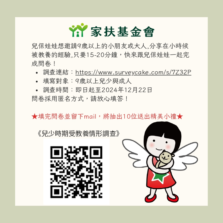 一、依據該法人113年11月18日台童社工字第1130002414號函辦理。 二、該基金會長期致力於關注兒童及少年權益之發展與落實情形,為瞭解我國兒少受教養的情形,辦理本次調查,114年預計以探究兒少受教養的經驗為倡議主題,希冀從每個人的經驗分享中,瞭解兒童保護議題對於每個人之影響。 三、本次調查採用電子線上問卷,邀請9歲以上各年齡階段之各級學校學生填寫(問卷適用於9歲以上各年齡層之兒少與成人),並惠請協助公告此訊息。 四、調查時間為:113年11月8日(五)至12月21日(六);問卷網址:https://www.surveycake.com/s/7Z32P;問卷QR code,請參見圖示。 五、案內如有未盡事宜,請洽家扶基金會社會工作處研發組陳威宇資深專員,連絡電話:04-22061234分機1718,電子郵件信箱:openm3@ccf.org.tw。 |