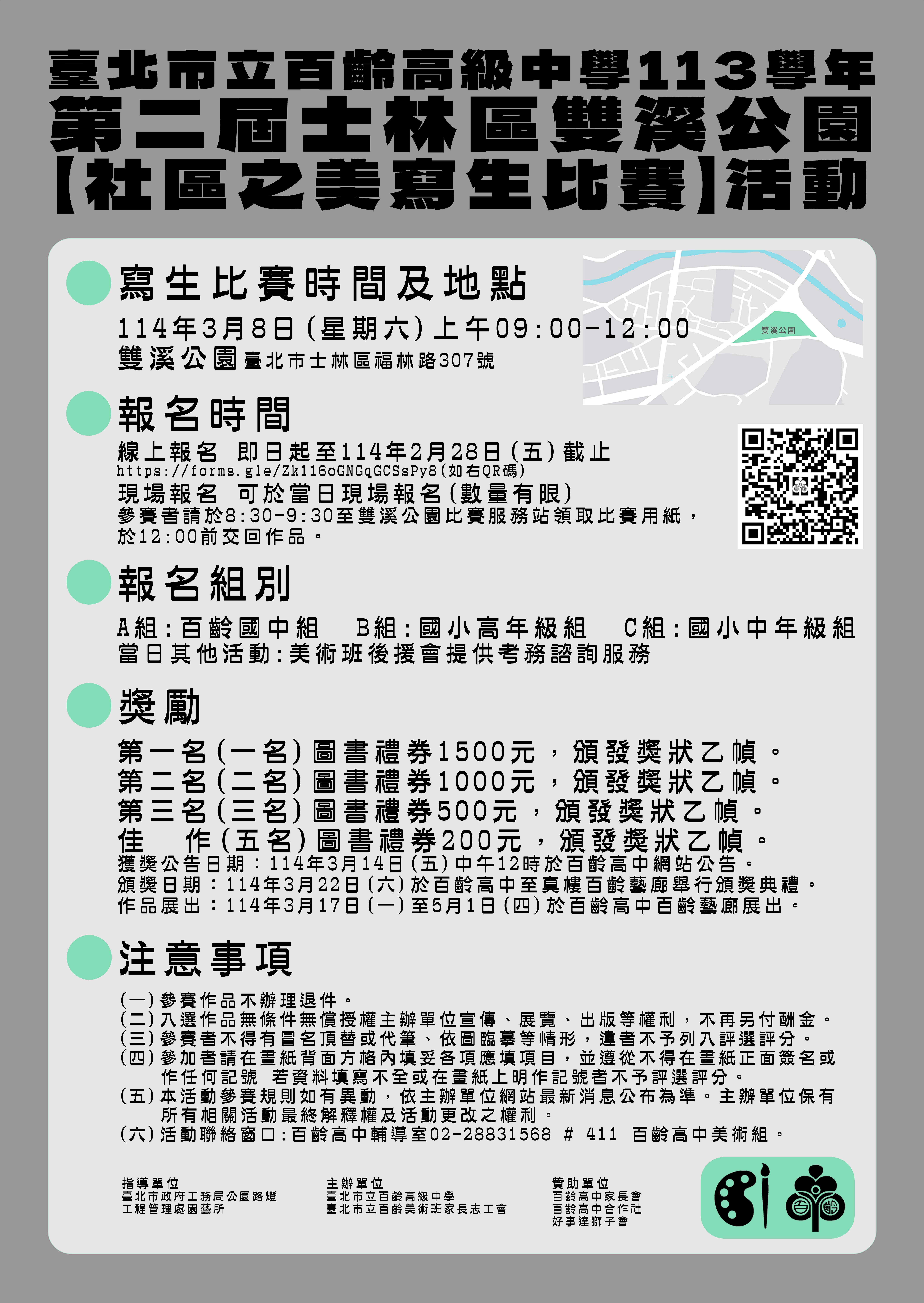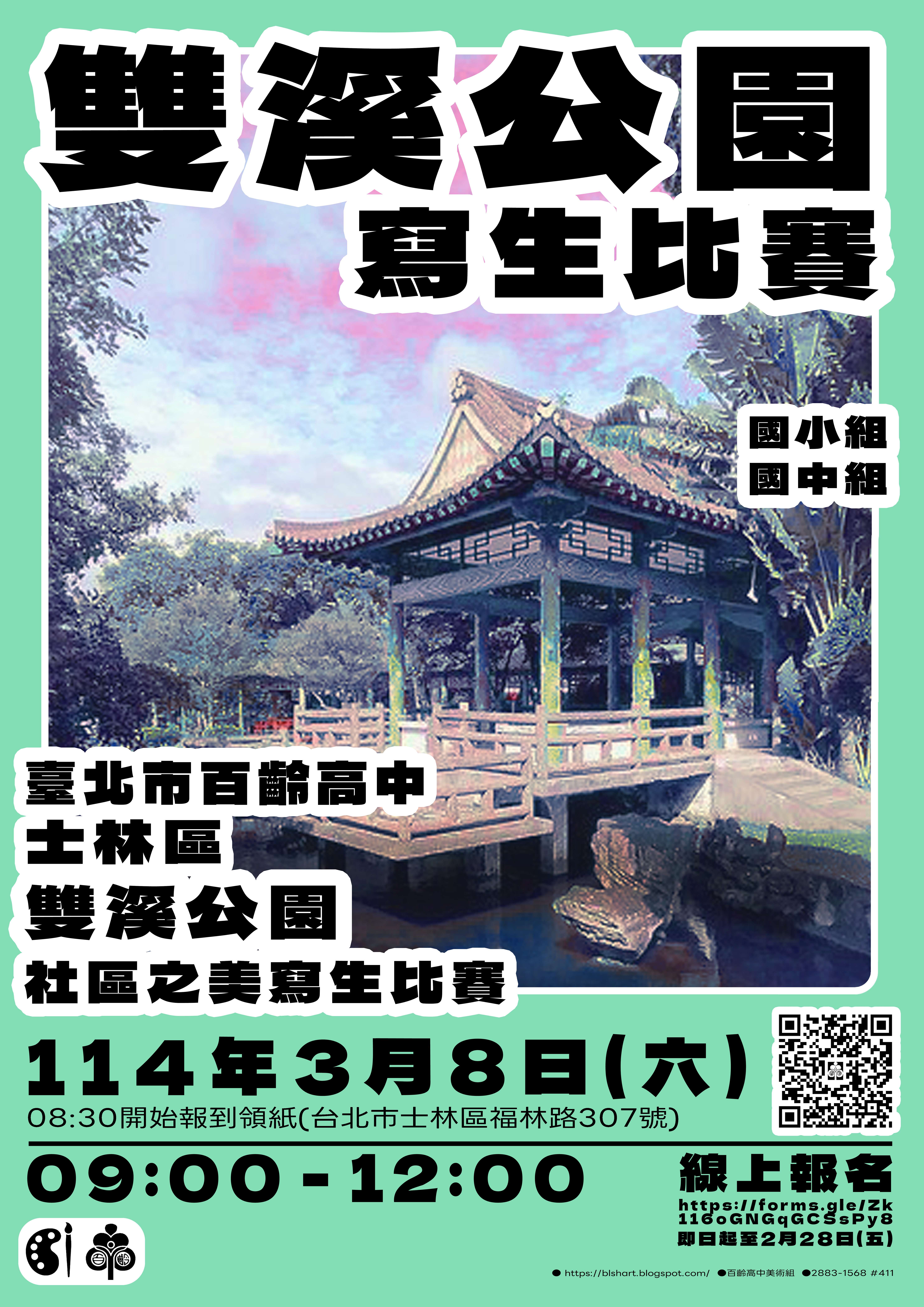 113學年度百齡高中雙溪公園社區之美寫生比賽 一、比賽時間:114年3月8日(星期六)早上9時至12時整。 二、比賽地點:臺北市雙溪公園內(臺北市士林區福林路 307 號),若遇雨天照常舉行。 三、參加對象:國中、國小學生;比賽分為國中組、國小高年級組、國小中年級組。 四、線上報名:https://forms.gle/Zk116oGNGqGCSsPy8。 五、比賽相關內容詳如附件,敬請協助公告並鼓勵貴校學生報名參加。
