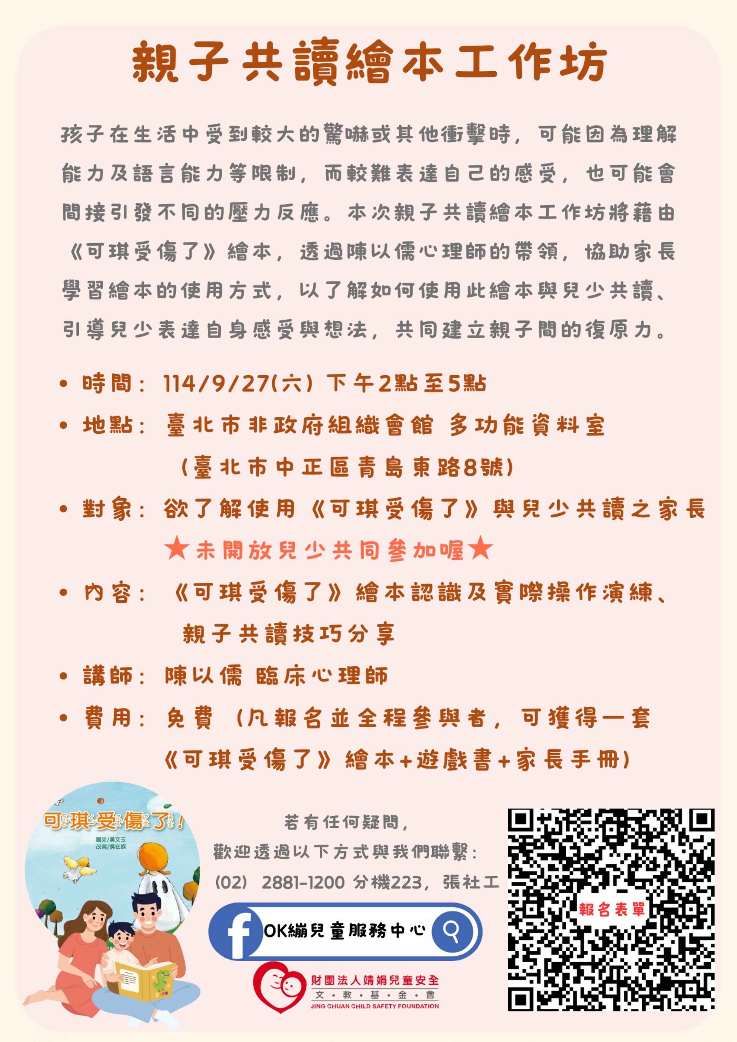OK繃兒童服務中心辦理114年度「親子共讀繪本工作坊」 一、依據財團法人靖娟兒童安全文教基金會114年8月14日114靖娟北總字第1140000330號函辦理。 二、該會辦理親子共讀繪本工作坊,期待透過協助家長學習使用繪本的方式,以了解如何使用《可琪受傷了》此繪本與兒少共讀,共同建立親子間的復原力。 三、工作坊資訊: (一)時間:114年9月27日(星期六)下午2時至5時。 (二)地點:臺北市非政府組織會館多功能資料室。 (三)對象:欲了解使用《可琪受傷了》與兒少共讀之家長。 (四)內容:《可琪受傷了》繪本認識及實際操作演練、親子共讀技巧分享。 (五)講師:陳以儒臨床心理師。 (六)費用:免費。 |