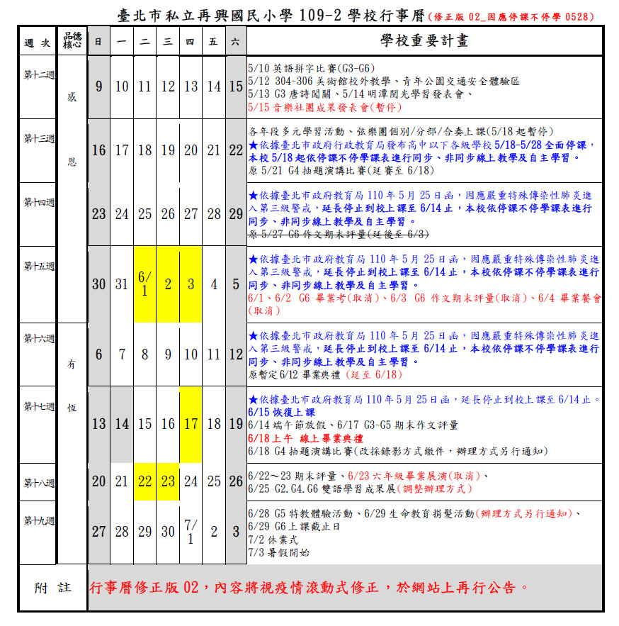 依據110年5月25日臺北市政府教育局函,雙北進入第三級警戒,延長停止到校上課至110年6月14日止,行事曆修正公告如下圖。