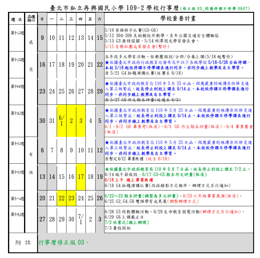 依據110年06月07日臺北市政府教育局函,雙北進入第三級警戒,延長停止到校上課至110年7月2日止,行事曆修正公告如下圖。
