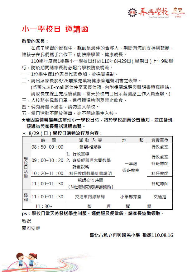誠摯邀請小一家長參與110學年度第1學期學校日