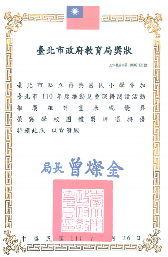 本校連續4年榮獲臺北市推動深耕閱讀計畫學校團體獎特優,除了課程與教學的精進與創新,更提供學生多元展能的機會,不論是小小說書人、改編故事與劇本、閱讀推手皆獲得肯定,這份榮耀屬於再興小學全體親師生。