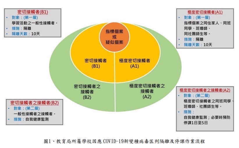 各位家長好: 近期各地確診案例陸續增加,請家長協助留意自身及孩子健康狀況,若有下列三種狀況,請務必立即通知學校,謝謝您的配合。 1.若孩子為確診個案。 2.若孩子為A1或B1層級(即確診者的同住家人、社團同學、同校車者等),請務必通知學校,並確認居隔時間。 3.若孩子為A2或B2層級(以上A1.B1層級的同住家人、社團同學、同校車者等),建議孩子在家自主管理7天。 疫情期間保護自己以及身邊的人,讓我們以團結之心,掌握正確訊息,共同度過這段防疫期。