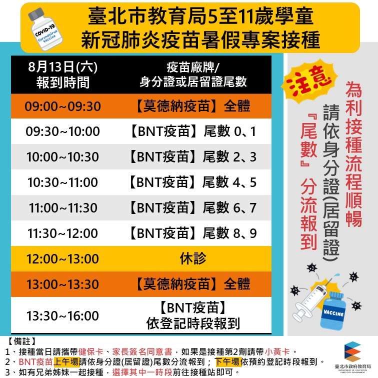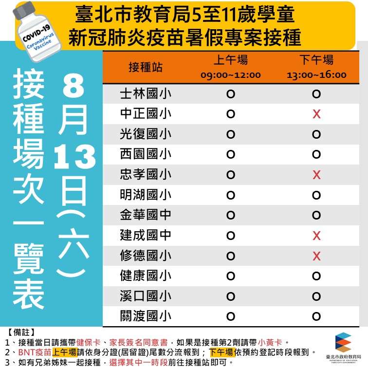 親愛的家長您好: 為提供家長多元疫苗接種管道,臺北市政府教育局與衛生局協調合約醫療院所,訂 於 111 年 8 月 13 日(星期六),於本市 12 所學校辦理 5 至 11 歲學童新冠肺炎疫苗暑假 集中接種作業。
