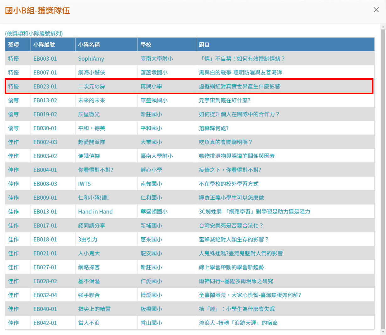 主辦單位得獎公告