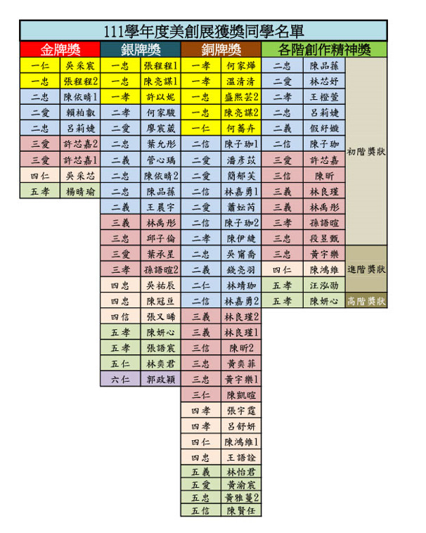 111學年度再興小學兒童美術創作展校內複審獲獎名單