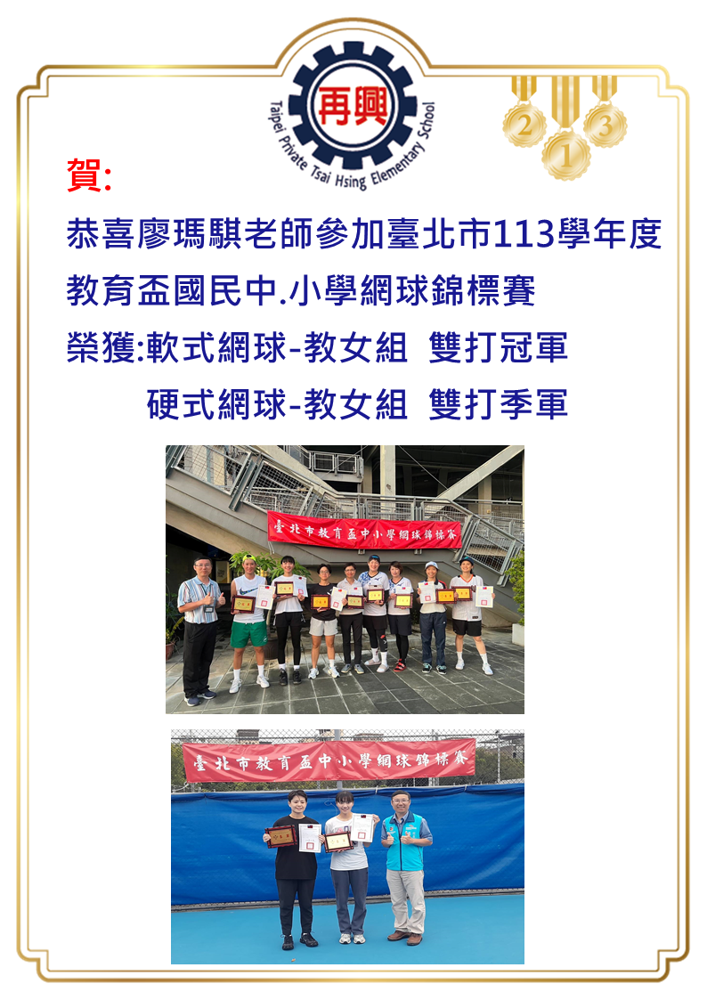 恭喜廖瑪騏老師參加臺北市113學年度教育盃國民中.小學網球錦標賽 榮獲: 軟式網球-教女組 雙打冠軍 硬式網球-教女組 雙打季軍