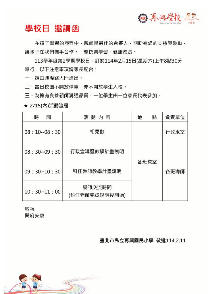 誠摯邀請一~五年級家長參加113學年度第二學期學校日活動,