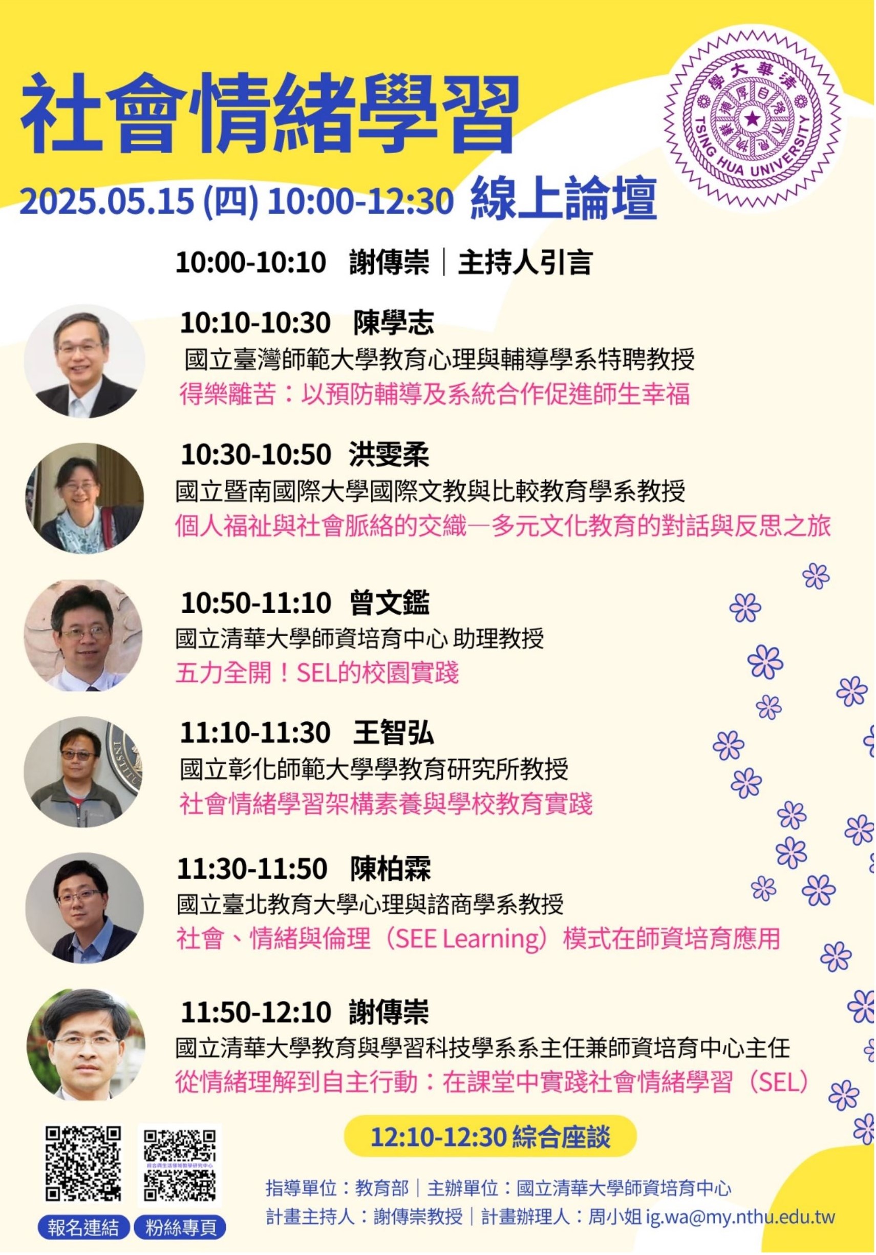 國立清華大學「社會情緒學習」線上論壇 一、依據國立清華大學114年5月1日清師培字第1149003233號函辦理。 二、該校師資培育中心預計於114年5月15日上午10時至12時30分,舉辦以「社會情緒學習」為主題之線上論壇,旨在探討如何透過系統性教學,培養學生的自我覺察、情緒管理、人際互動與責任決策能力。透過專家講座與實務交流,期能協助教師深化SEL理念與教學策略,進而促進學生全人發展,強化學校教育支持系統。 三、論壇主持人為謝傳崇教授,邀請與談人包括陳學志特聘教授、洪雯柔教授、王智弘教授、陳柏霖教授與曾文鑑助理教授,針對主題進行專題演講與分享。 四、報名方式:請於114年5月13日前完成線上報名,報名先後順序為準,報名連結:https://forms.gle/xfB8cjKZCXjt64a37。 五、論壇全程採用線上方式(Google Meet)進行,完成報名之與會者將於114年5月14日中午前收到論壇連線代碼。 |