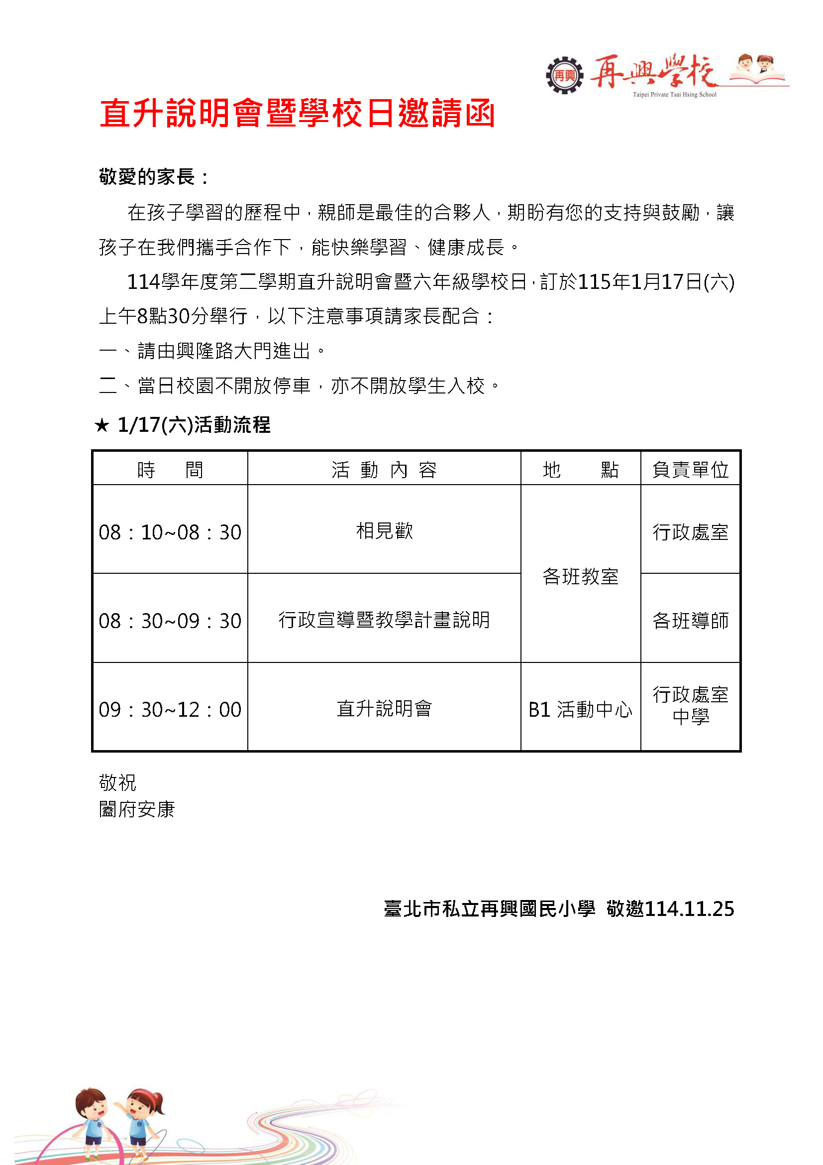 誠摯邀請六年級家長參加114學年度第二學期直升說明會暨學校日,