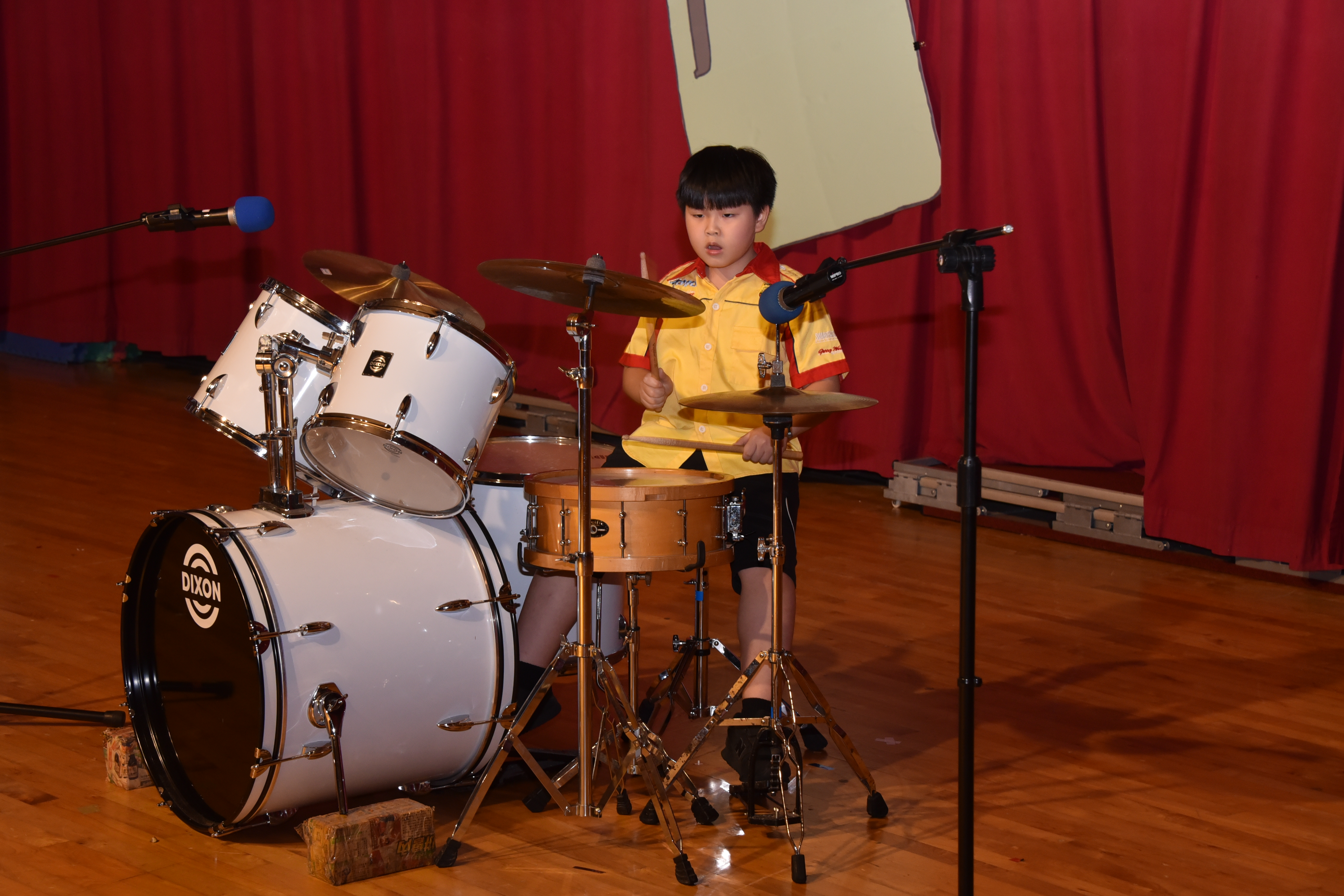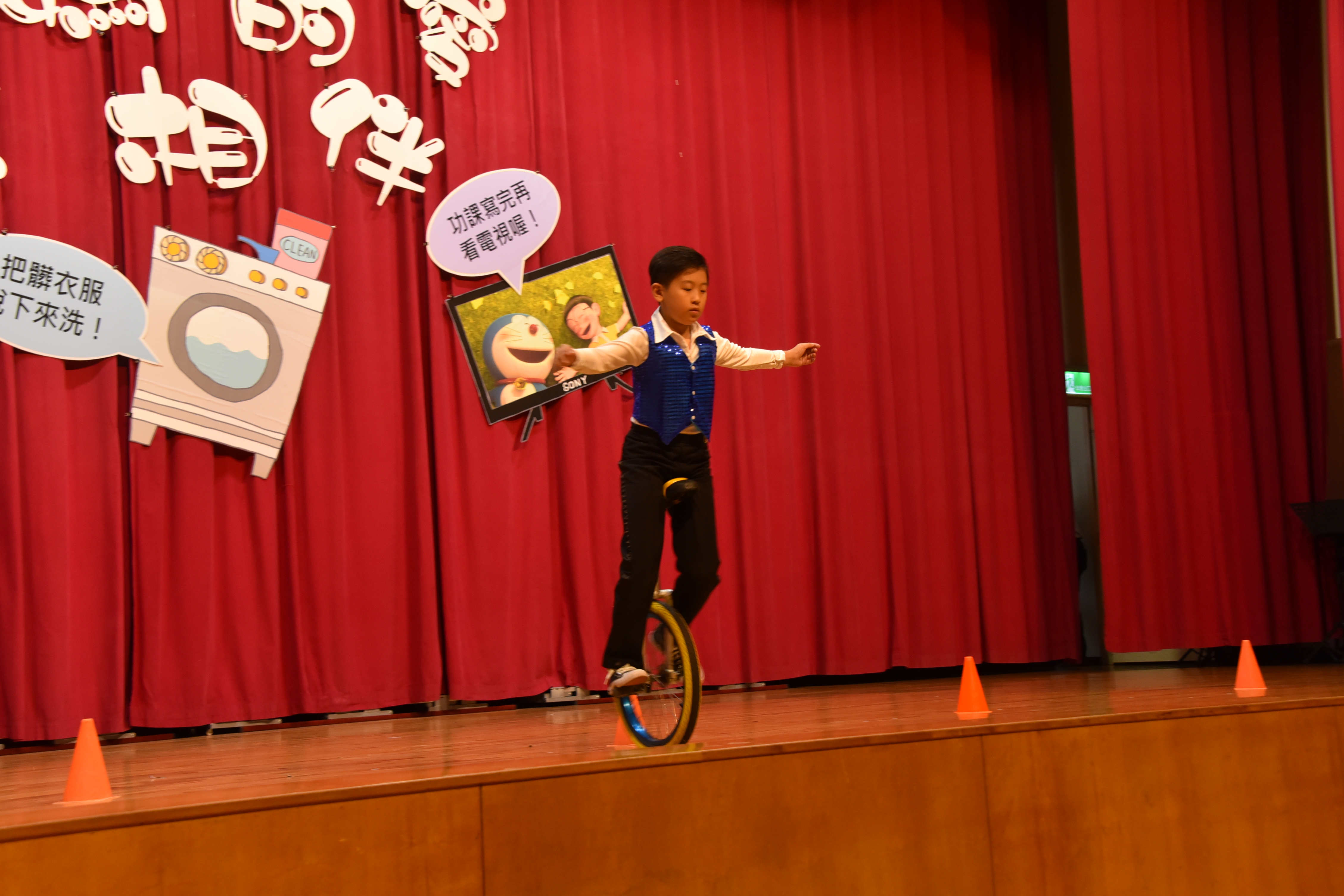 接著是由一孝的莊勳哲以熱情奔放的爵士鼓帶來五月天的「洗衣機」,謝謝媽媽就像洗衣機般無怨無尤的照顧著家人;五忠張翼中、陳采良及五孝章可頤這三位小小說書人帶來生動有趣的「差不多先生」;五忠林恩序的獨輪車特技表演也為活動帶來高潮。 |