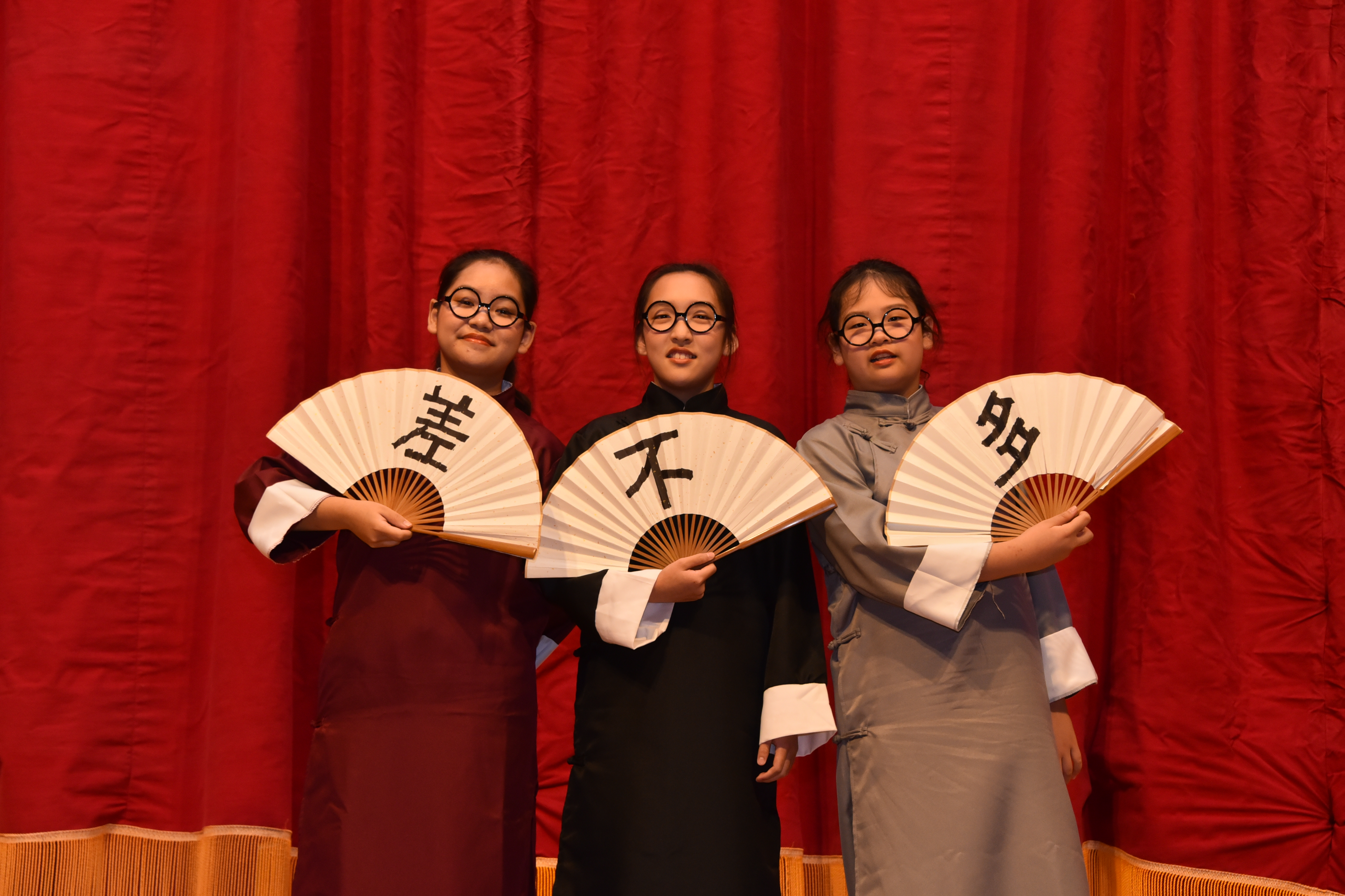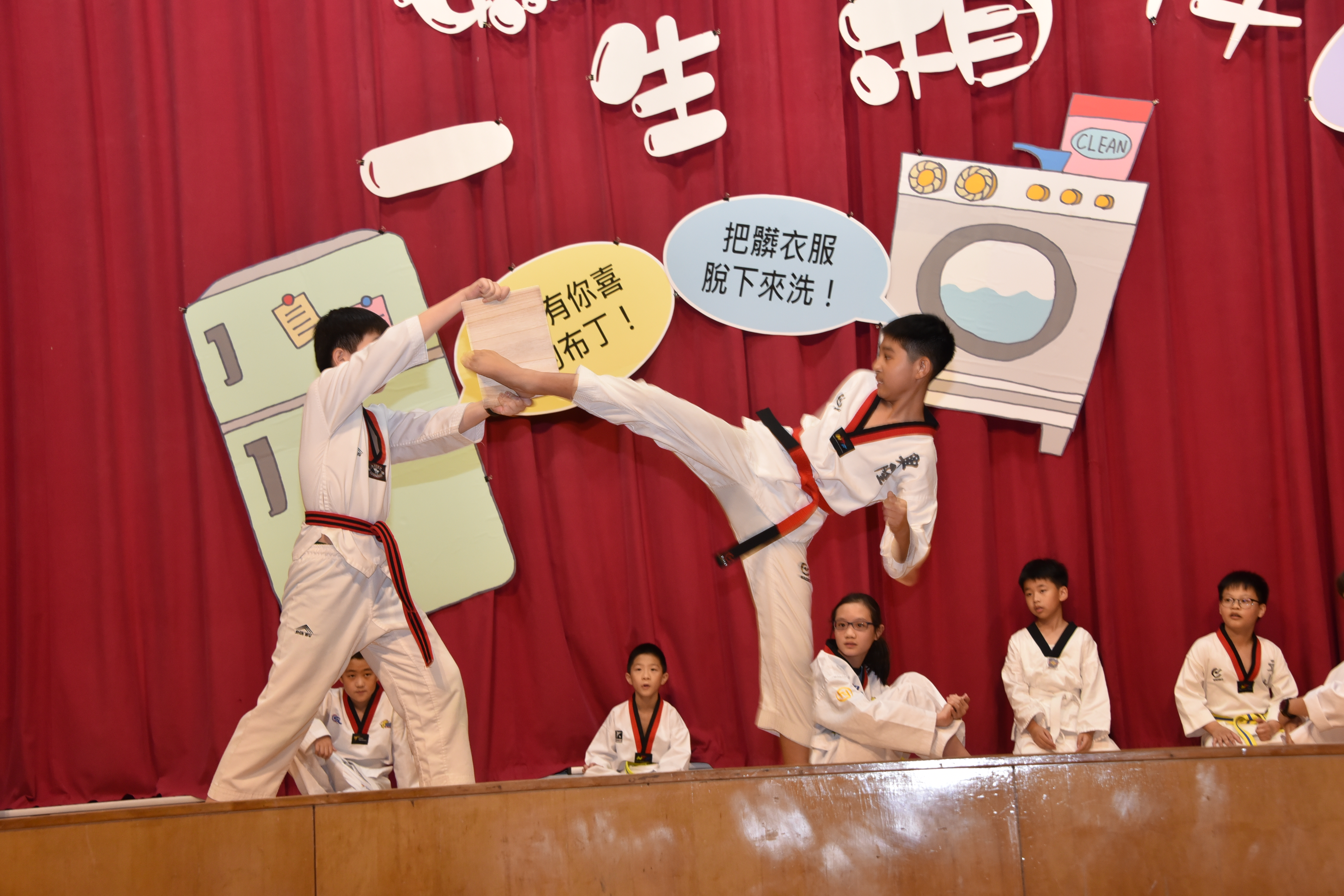 緊接著登場的是社團表演:再興Talk秀四位成員,以各式「度量衡」單位顛覆一般人的思維模式,幽默的內容將觀眾逗得哈哈大笑;直笛團以曲風清新的經典校園民歌「聽泉」帶給觀賞者如同徜徉於山林,諦聽泉聲般悠然的自在感受;樂音清亮的口琴,為大家帶來活潑輕快的「卜派」及「櫻桃小丸子」舞曲;兒童舞蹈社則以俏麗甜美的舞步表演「動感熱舞」,讓現場來賓目不轉睛;扯鈴社同學技巧純熟的舞動扯鈴,躍動的扯鈴在臺上「活『鈴』活『線』」,變化倏忽的招式讓人目不暇給;魄力十足的跆拳道在整齊化一的動作中,展現出力與美的結合,精準的擊破技術更是讓臺下掌聲不斷。 |