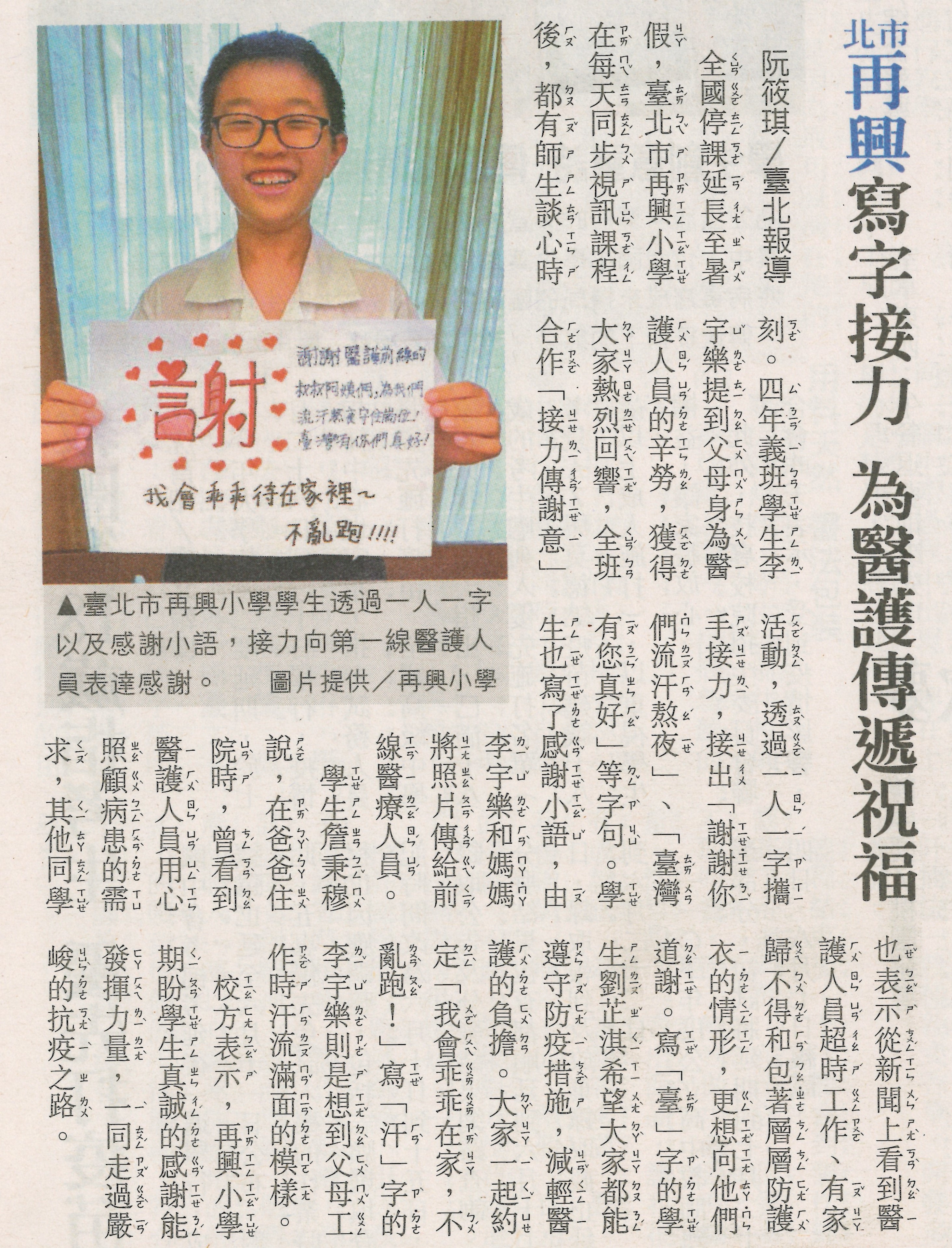 防疫不停學期間,每天同步視訊結束後的談心時刻,是再興導師與孩子交流心情點滴的溫暖時光。四年級的李宇樂提到父母身為醫護人員的辛勞,獲得老師同學的熱烈迴響,全班合作「接力傳謝意」活動,向第一線守護大眾健康的醫護人員表達感謝。