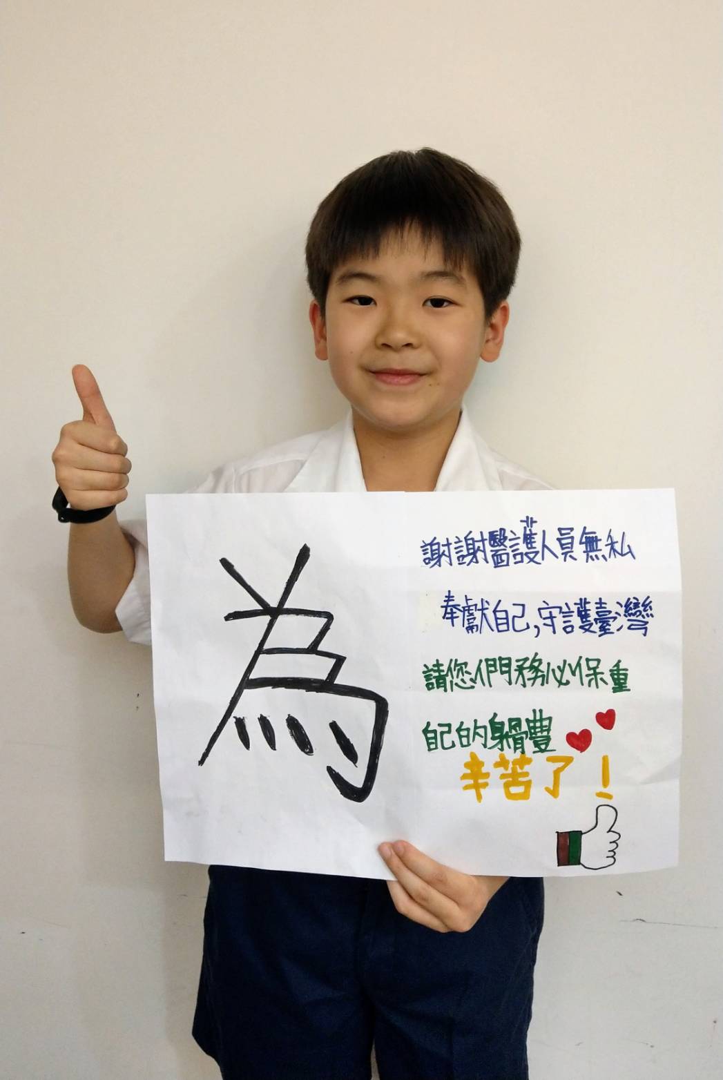 感到心疼之餘,孩子們更想對醫護人員道謝,林老師播放《遠距離的愛》MV和介紹余燦同老師引導做法,和孩子們一人一字攜手接力完成感謝小語。寫「汗」字的宇樂想到父母工作時汗流滿面的模樣;寫「臺」字的劉芷淇希望大家都能遵守防疫措施,就能減輕醫護人員的負擔。大家還一起約定「我會乖乖在家,不亂跑!」