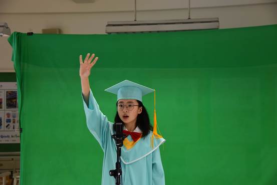 典禮開始,依往例本該是由各班導師帶領走紅地毯進場,今年改由“線上進場,楊校長於主席台前揮手歡迎各班畢業生。