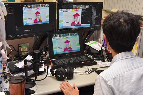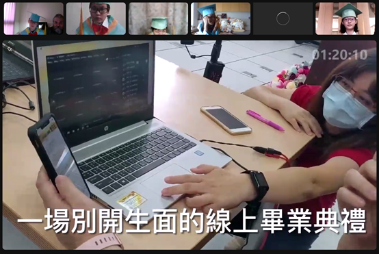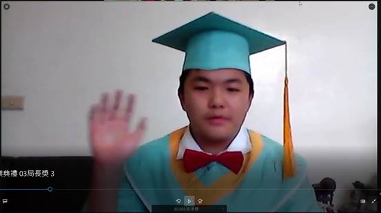 在播放老師們輪流祝福的影片同時,在Webex會議線上的畢業生們也突然如被鎂光燈cue到的出現在畫面上,看到許多家長和同學們一起參加典禮,家中儀式感十足,畢業汽球、祝福話語、手板、還有家中毛小孩一起觀禮……長達10分鐘的祝福影片中,我們看到許多同學已經著好裝準備朝下一個階段出發囉!