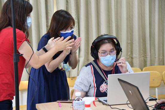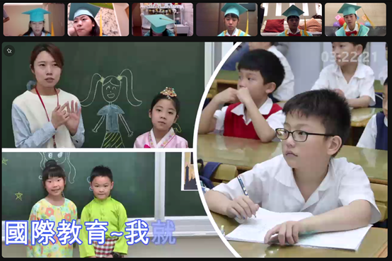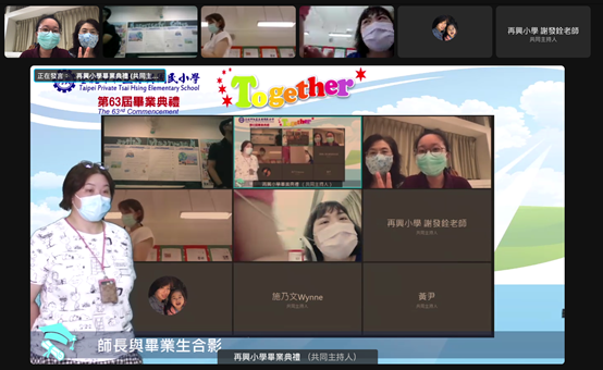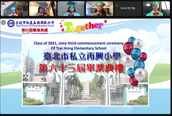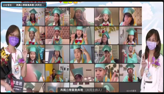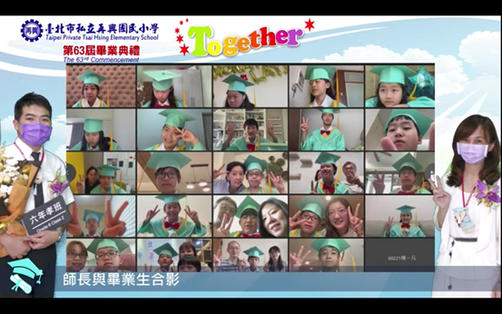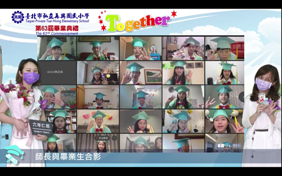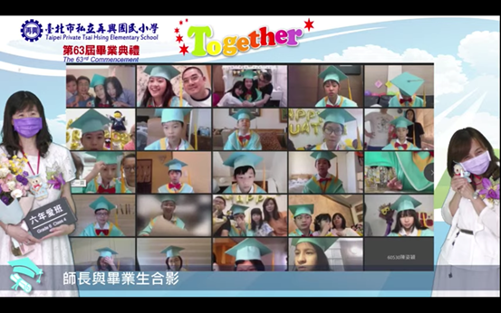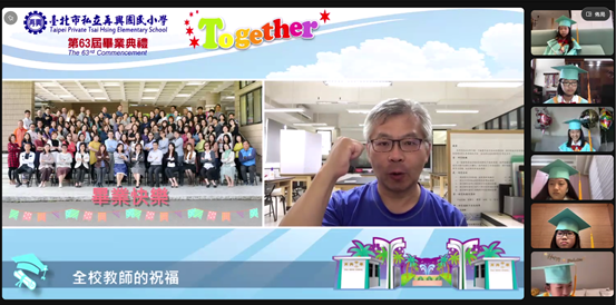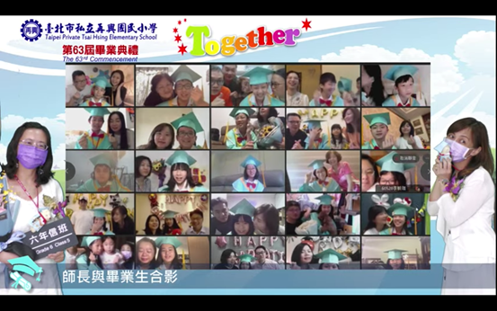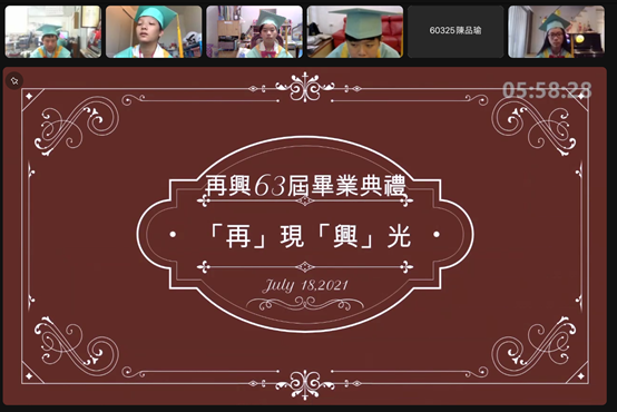 緊接著播放校歌與畢業歌,最後是各班師生線上大合影,只見同學開心比起各種手勢、線上陪同的家長們也踴躍入境分享喜悅的一刻……在大家共同見證下,長達1小時40分的線上畢業典禮圓滿完成。禮成後,楊校長特別逐一介紹每一位在現場參與的行政老師們並予以致謝。祝福所有的同學們:展翅『再』高飛,鵬程『興』萬里!