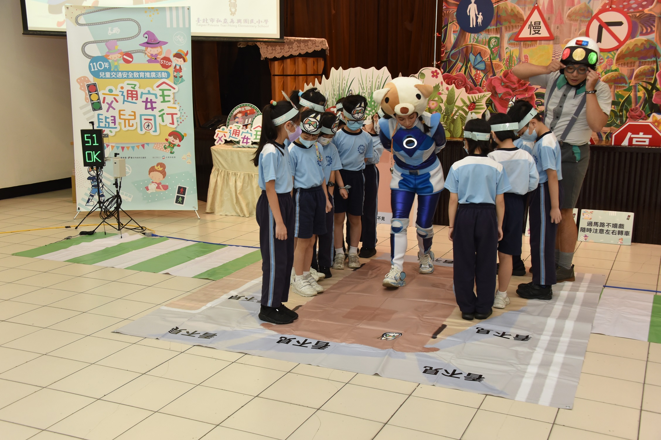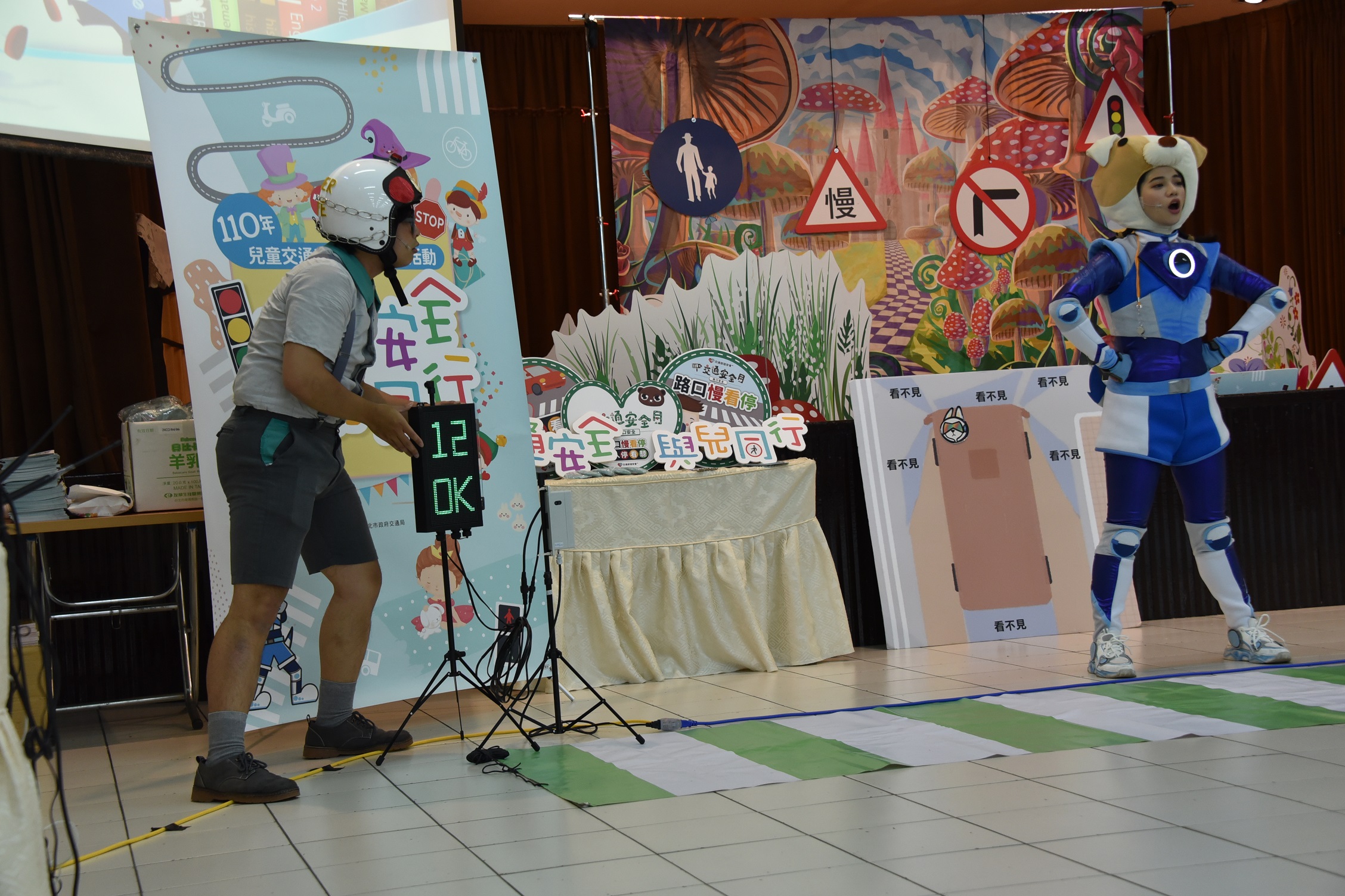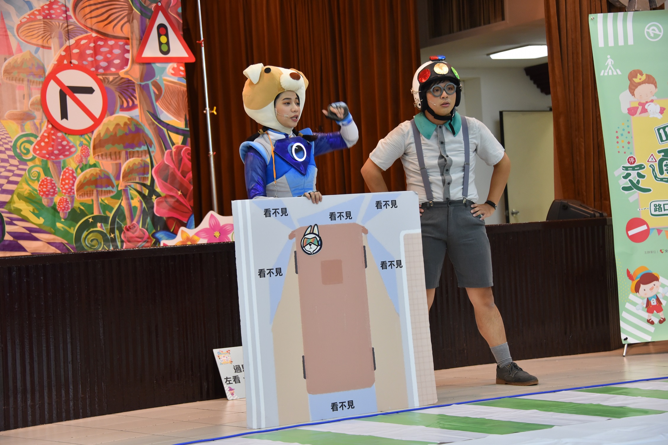 過馬路前先後退三步才安全、過馬路時舉起來增加能見度、避開大型車的視野死角、道路上常見的交通號誌,以及生活經驗中經常碰到的交通狀況等,在「美美狗」警察與「郝酉氏」一搭一唱的巧妙帶領下,讓學生在歡樂的氣氛中也充分的再次加深交安知識。