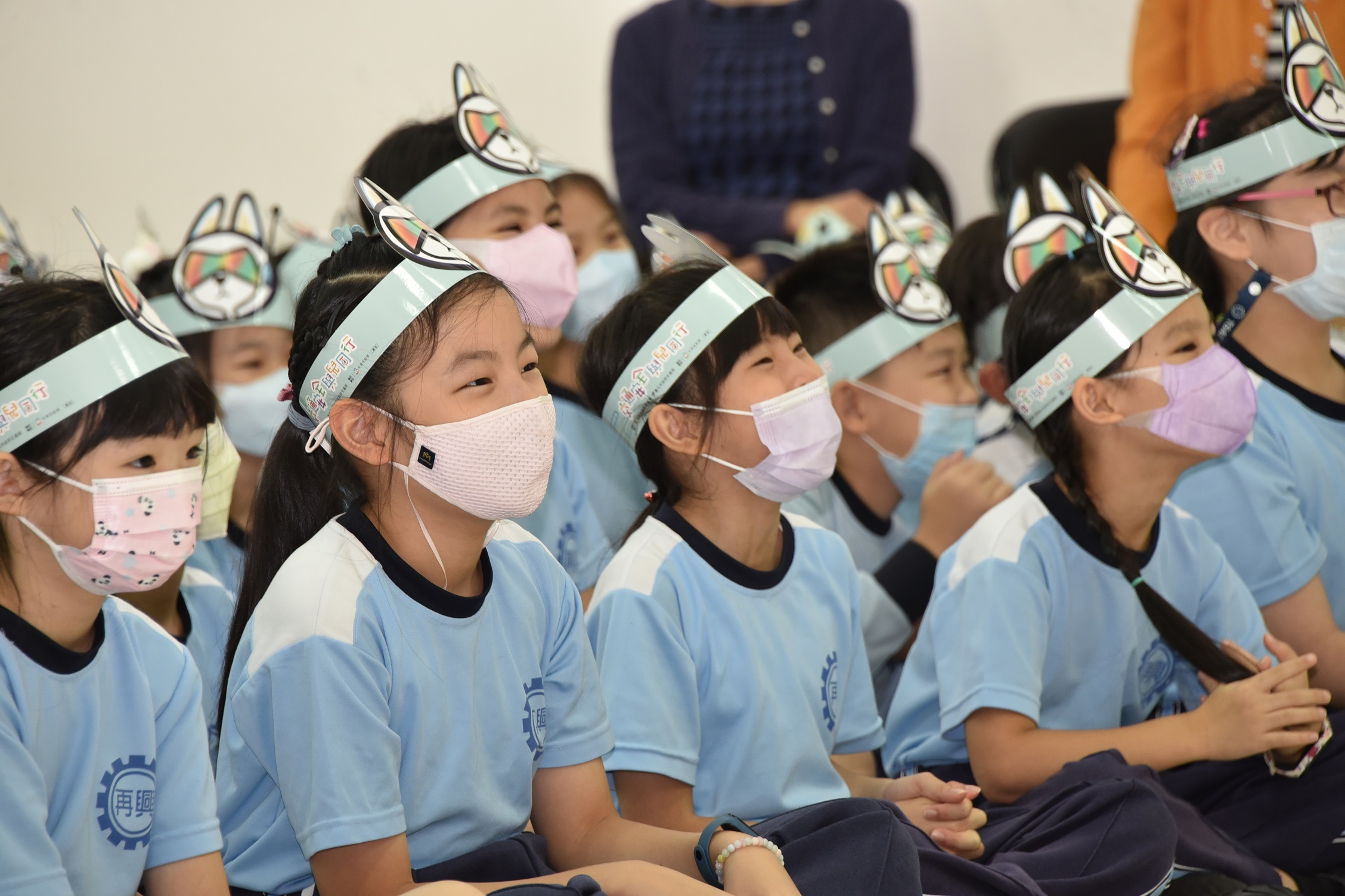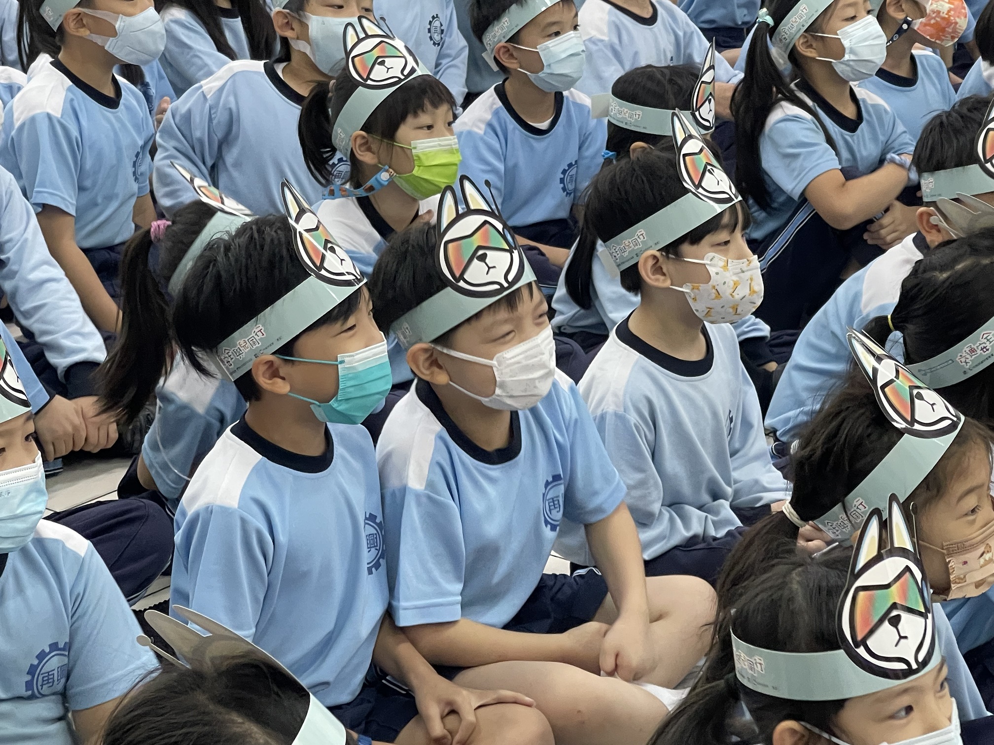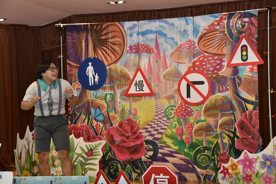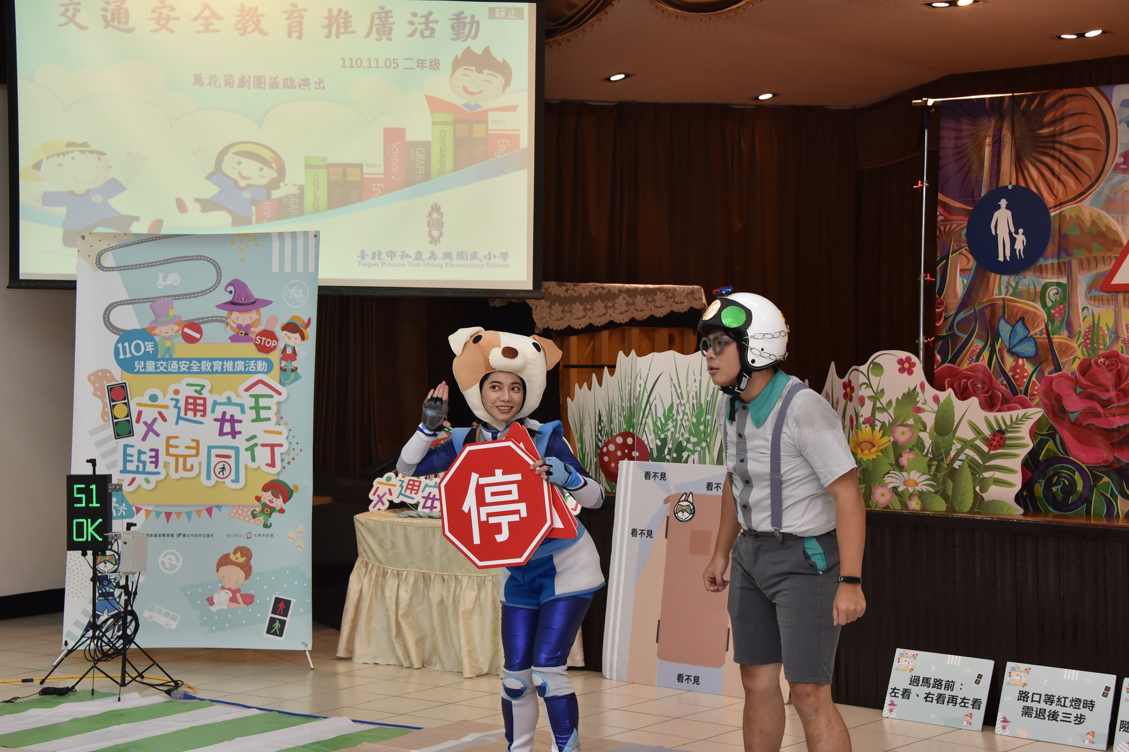 過馬路前先後退三步才安全、過馬路時舉起來增加能見度、避開大型車的視野死角、道路上常見的交通號誌,以及生活經驗中經常碰到的交通狀況等,在「美美狗」警察與「郝酉氏」一搭一唱的巧妙帶領下,讓學生在歡樂的氣氛中也充分的再次加深交安知識。
