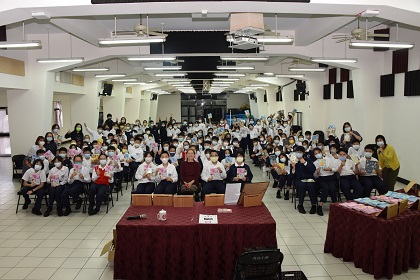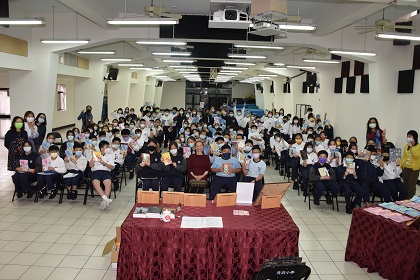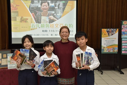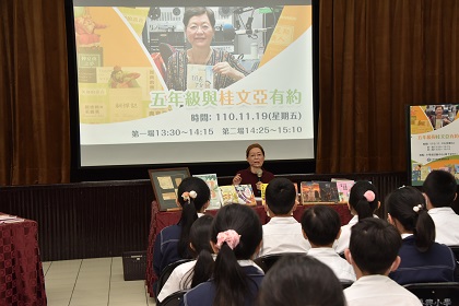 小書迷和大學姐一同追劇 桂文亞老師蒞臨再興分享讀寫人生 11月19日再興小學五年級學生與作家桂文亞有約活動,在小書迷和大學姐相見歡中愉快的展開。桂文亞老師帶著知性的笑容向再興五年級師生問好,親切的告訴大家自己曾經就讀再興幼兒園,是大家的大學姐,也曾來過再興作家有約活動,今日進到禮堂,黑白配色展顯沉穩的氣氛喚起她當年回憶而備感親切。