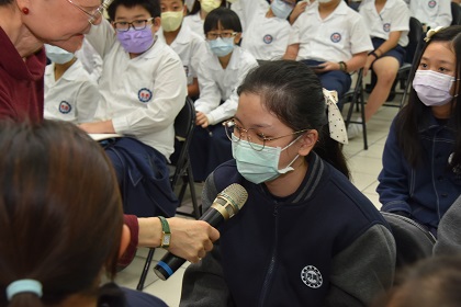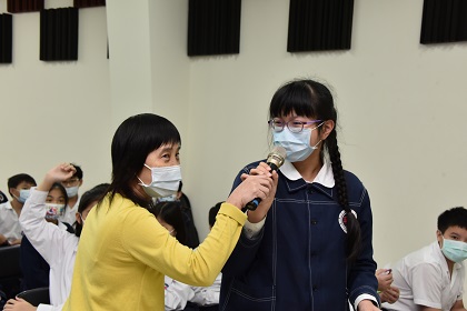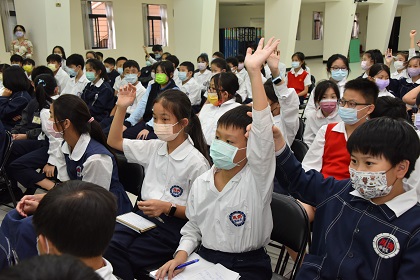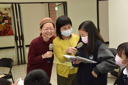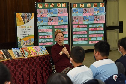 小朋友最煩惱的就是作文不知道要寫什麼,桂文亞老師鼓勵大家養成「手不離筆、筆不離紙」的習慣,因為話語就像風一般瞬間即過,但是記錄卻能從中淬字鍊句;提到自己在從事記者工作期間要採訪人物養成了「迅速聽寫」的能力,要聽出重點,手寫速度也要跟得上思考節奏,培養反應和記性很有幫助,持之以恆的記錄累積,便能「下筆如飛」。老師讚美再興學生能攜帶筆記記錄,並詢問內容給予即時指導。