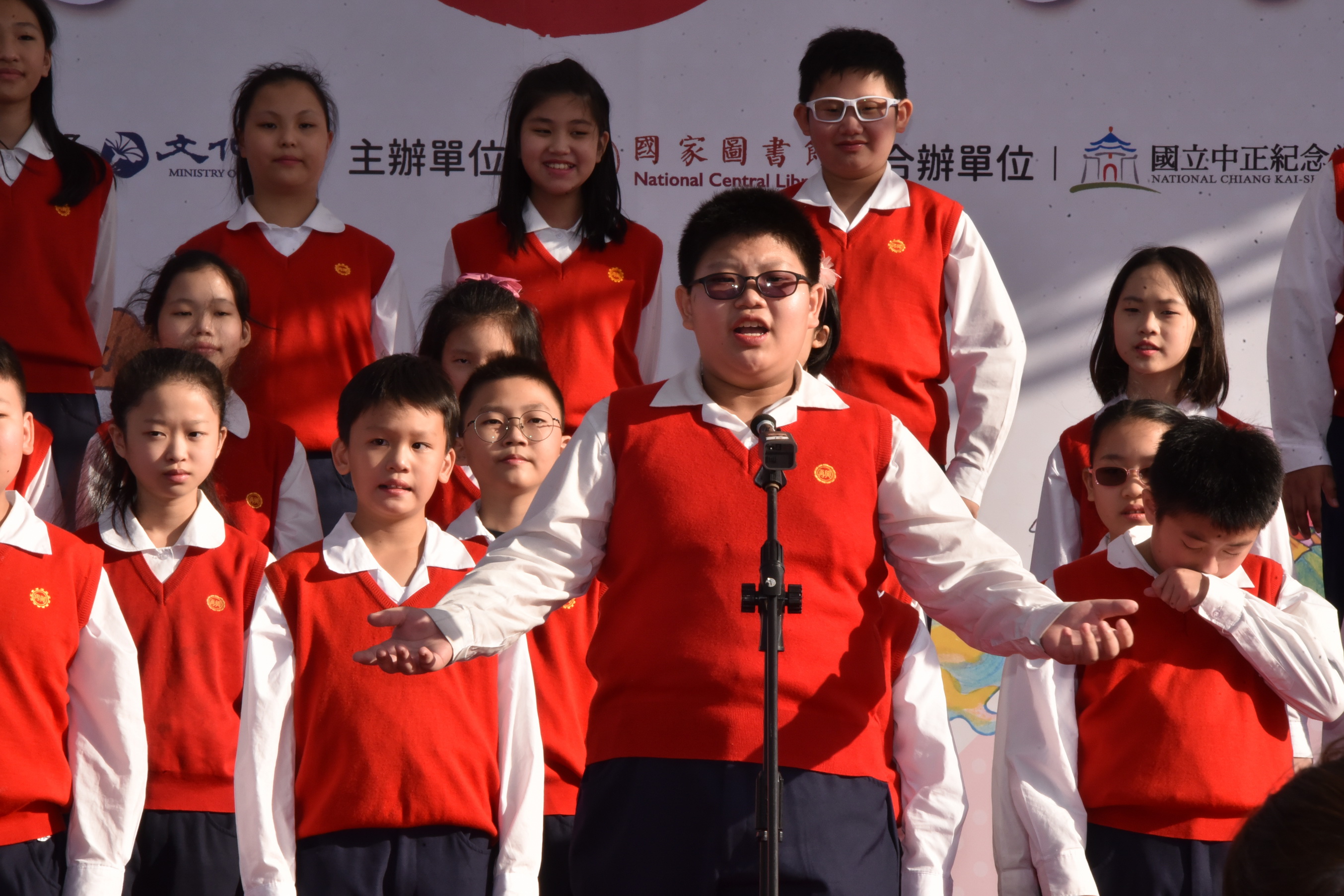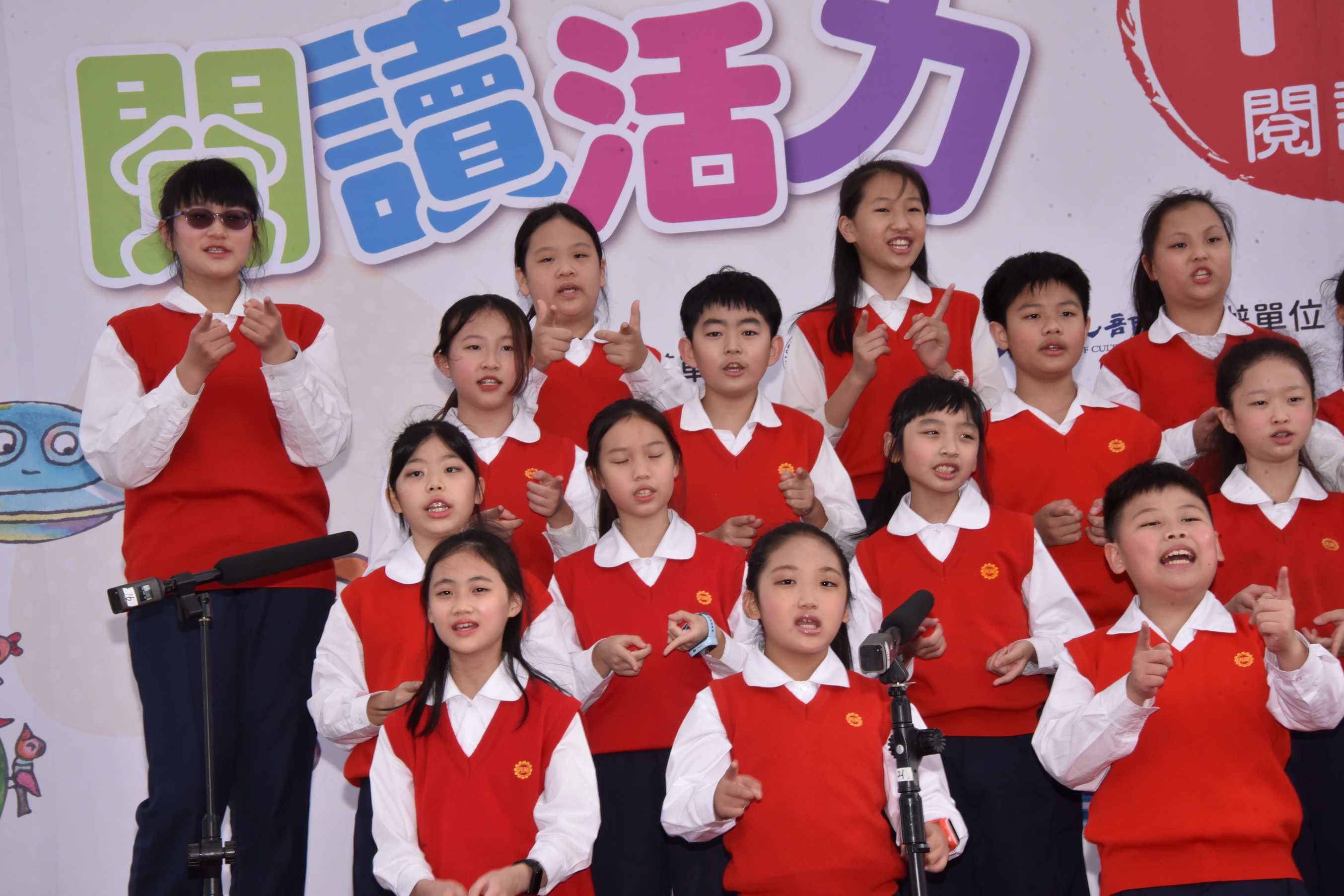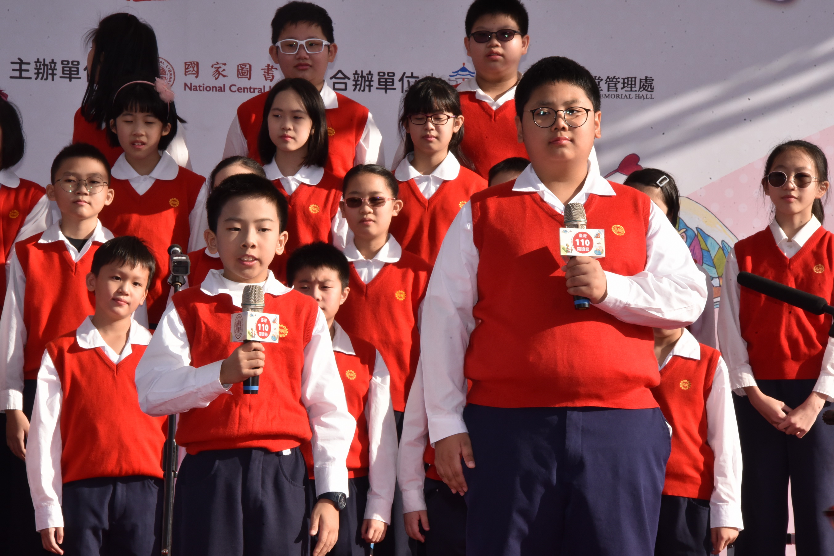 這次的臺灣閱讀節,本校除了設置闖關攤位,在主舞台亦有合唱團與英語讀者劇場的演出。讀者劇場團員由五年級9位學生組成,今年度代表再興小學參加台北市英語文學藝競賽,榮獲南區讀者劇場優勝,以流暢的英語與生動的肢體語言演繹<Rumors Running Wild>的故事。由一群愛唱歌的小天使所組成的合唱團,為呼應台灣閱讀節創新、多元的精神,在演唱曲目的組合上,除了選擇雅俗共賞的「Come to the music」,歡樂活潑的Disney Dazzle迪士尼組曲,更納入溫馨的台語歌曲「戇囝仔」,除展現多語文的樂曲,更呈現再興合唱團駕馭各種曲風的實力。美妙的歌聲與情節詼諧有趣的讀者劇場內容,都吸引了不少的目光,更贏得肯定的讚賞。