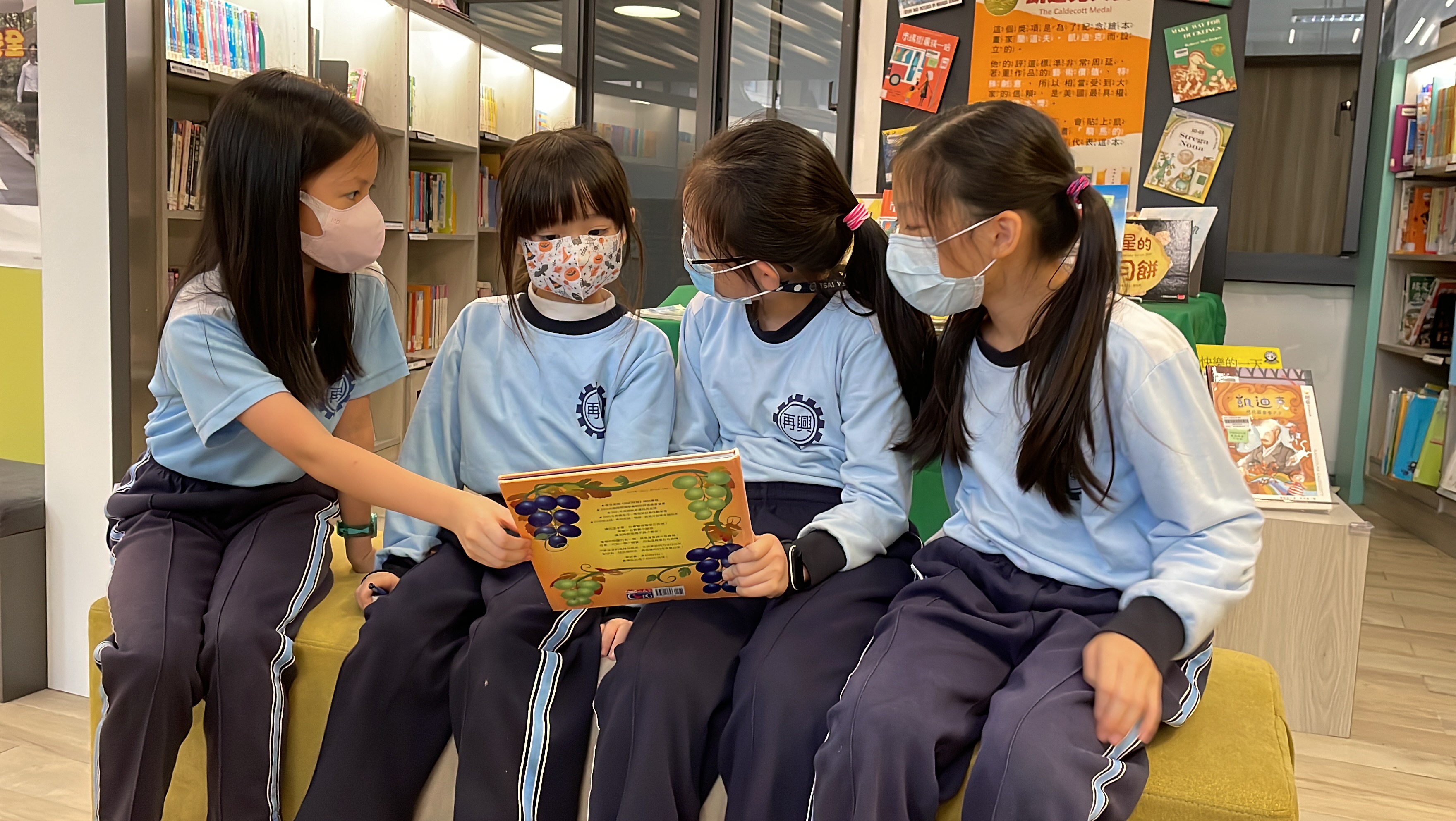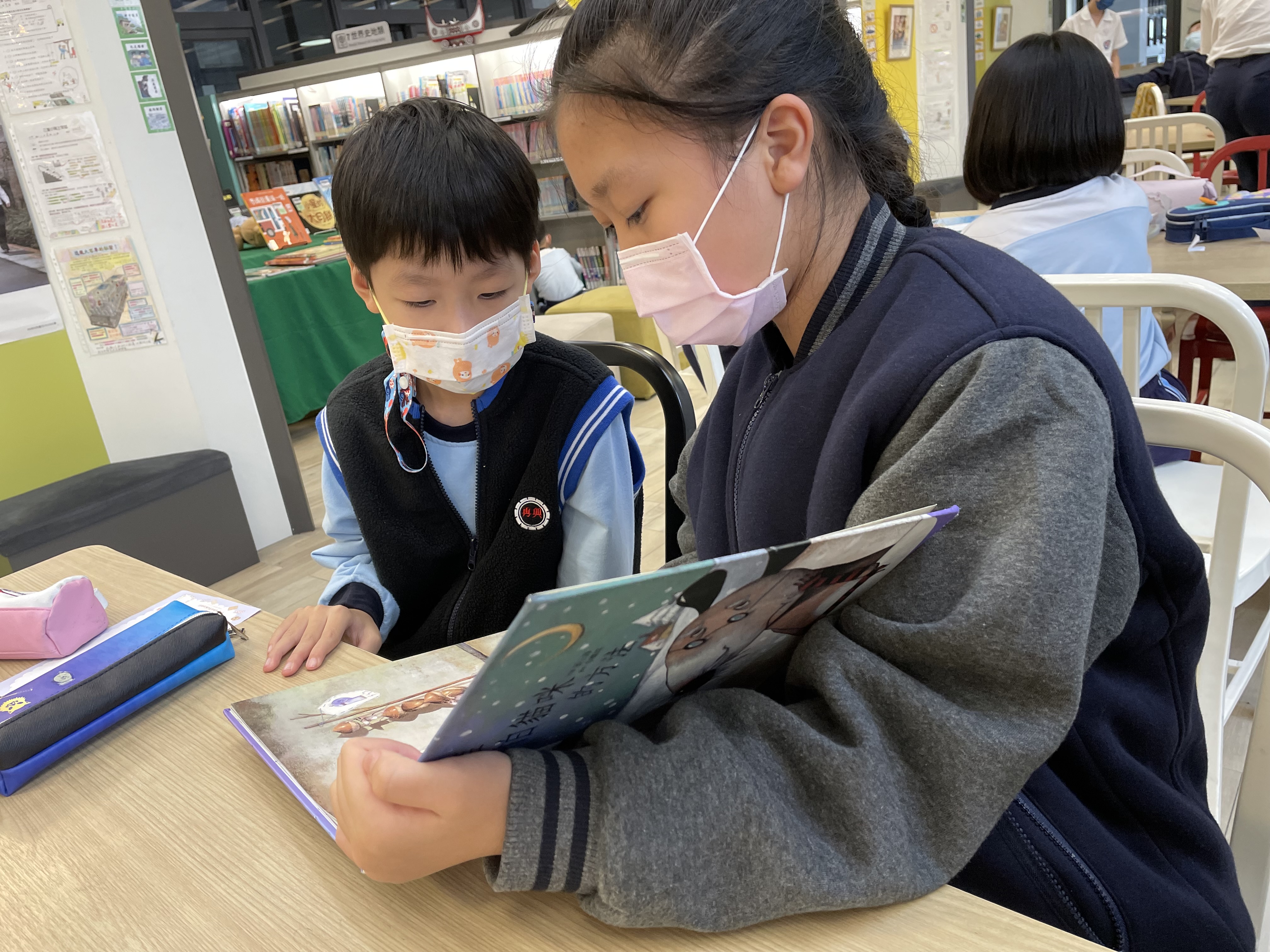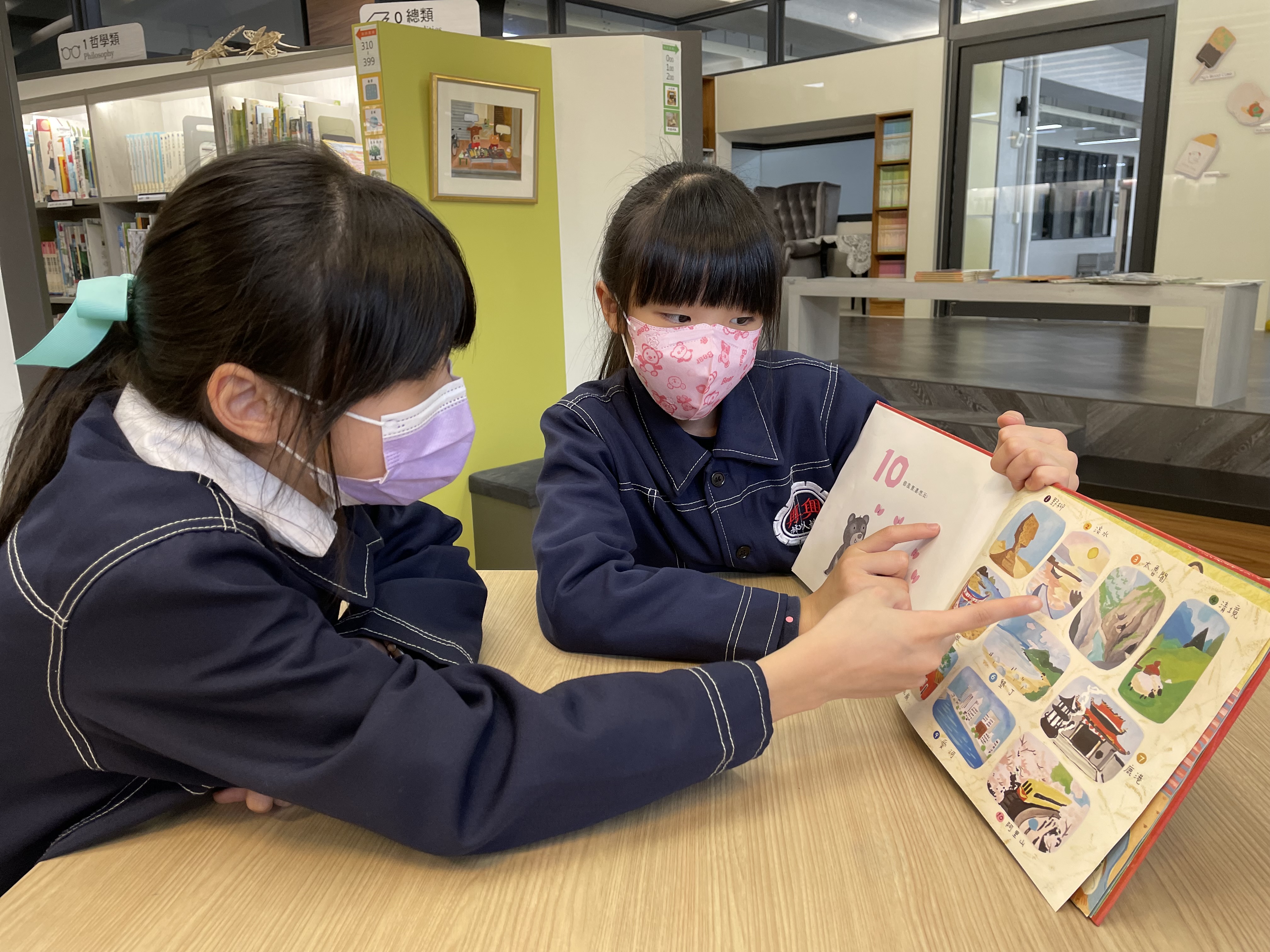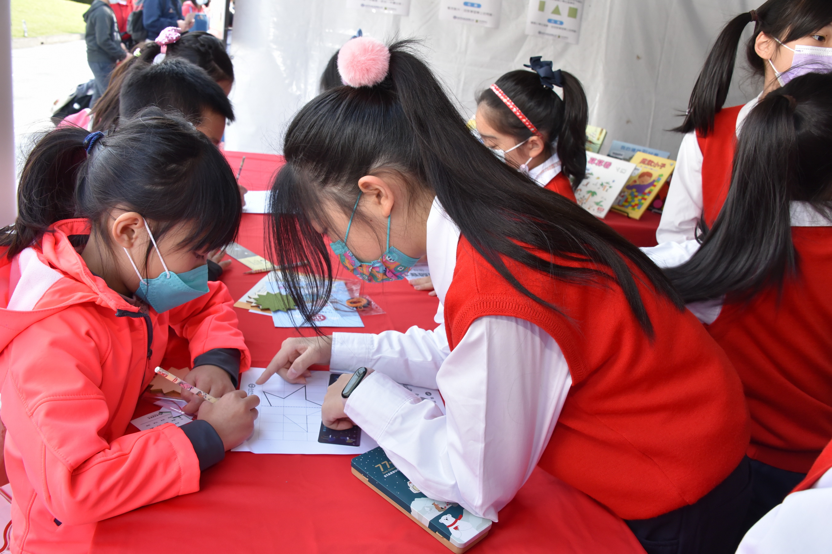 除了闖關活動外,攤位一隅也布置了與「興閱樂園玩數學」相關的共讀書籍,小關主們各個信手捻來都能為與會的闖關者敘說數學繪本故事內容,讓參與活動的親子驚艷,無不讚許小志工們的口條流暢,且能依據闖關者的年紀調整敘說的方式與互動模式。