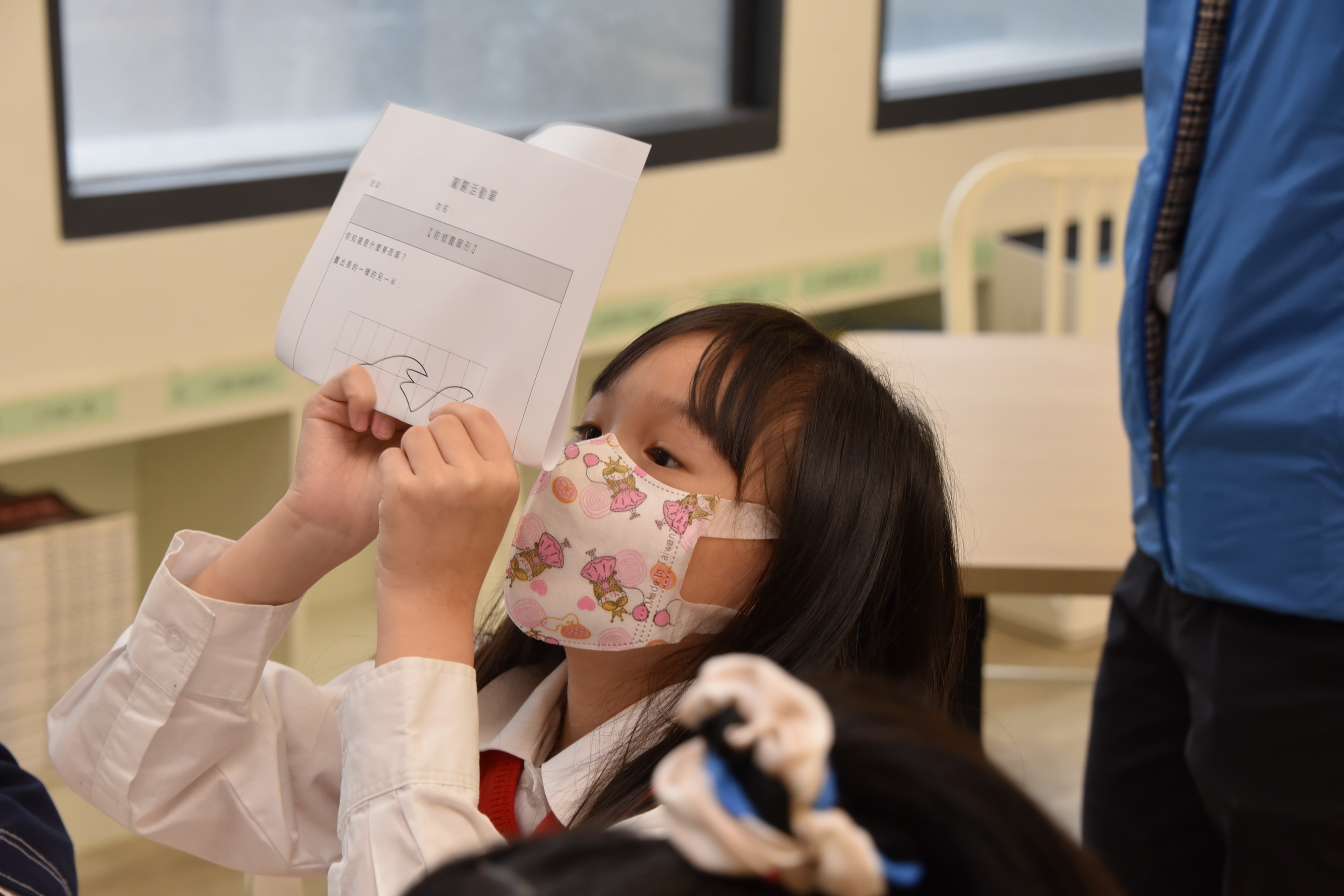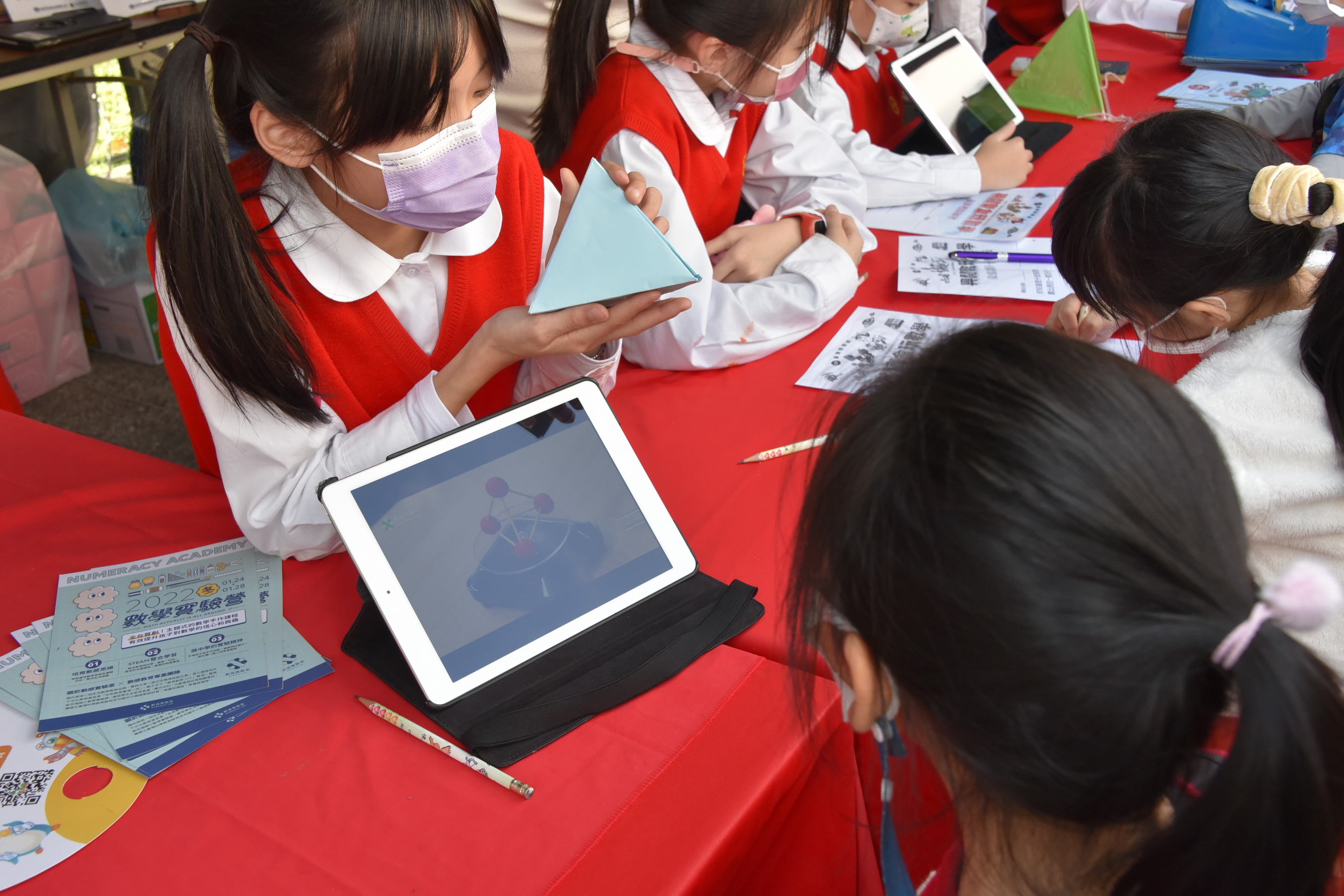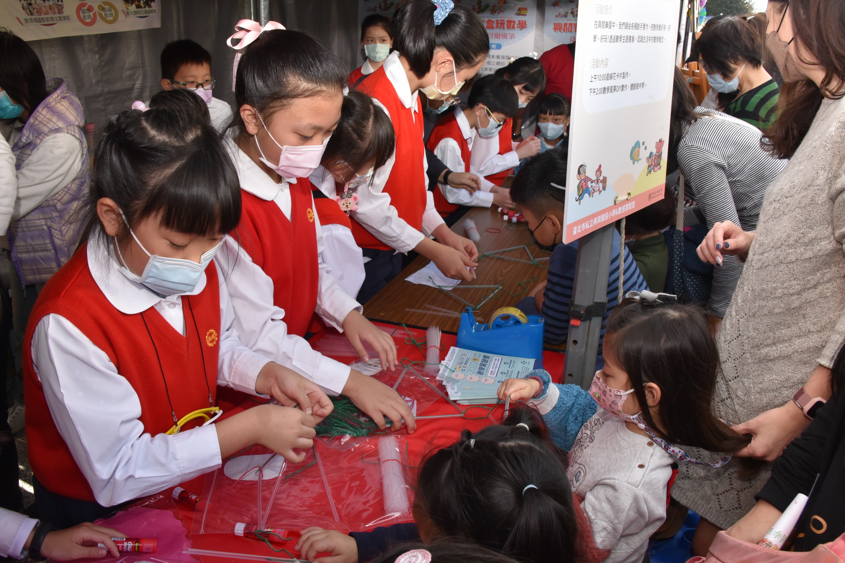 今年我們和數感實驗室合作設計了「動手玩數學」的主題展,與愛閱讀的親子們,一同歡度在閱讀活動中歡樂相聚。我們以「興閱樂園玩數學」為主題,設計了「依樣畫圖形」、「動手DIY」、「Read數學繪本故事」三個闖關活動。為了當日在會場中展現再興優質的閱讀內涵,動員了多位教師支援,並利用中午時間培訓了20多位書香小志工,擔任當天闖關活動的小關主,協助闖關者能順利過關。不論是「依樣畫圖形」、「動手DIY」,都讓與會的親子們,從體驗中感受對稱圖形的平衡,三角形是最穩固的圖形等數學原理。