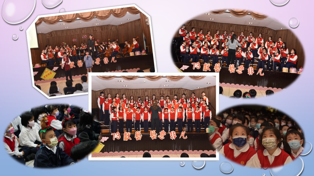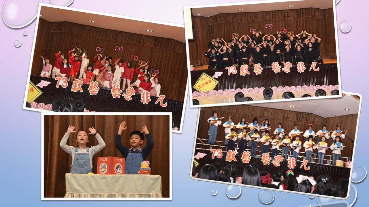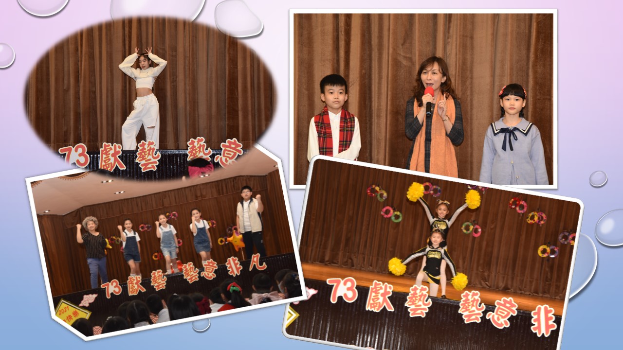 藝文表演會~「73獻藝 藝意非凡」,由葉叡朋和吳家榛搭檔主持,二人以詼諧俏皮的對話串起一系列精采的表演節目。六年愛班黃許元熹為大家帶來充滿活力的嘻哈音樂「LALISA」;榮獲110年度台北市英語學藝競賽優勝的英語戲劇,透過演出讓大家瞭解保護海洋不只是淨灘、避免塑膠進入海洋,還必須用適當的方式,如「控制過度捕撈」(overfishing)和「兼補」(bycatch)來捕魚;三孝張芷瑜、三仁林渝淵以活力彩球啦啦舞展現出舞蹈的力與美;兒童舞蹈社在林青軒老師的帶領下,帶來街舞「Somi what you got ,itzy不easy!」;三年愛班劉咏璇、三年信班童語安帶來榮獲110年度兒童深耕閱讀小小說書人特優的作品「百變小紅帽」;容易彈唱的小清新樂器烏克麗麗,在劉翠華老師的帶領下,帶來耳熟能詳的「貓吹笛」;王鶯玲老師指導的直笛團,表演曲目是雄壯威武、陽剛味十足的「西班牙鬥牛舞曲」,以及充滿童趣、歡樂的「小小世界真奇妙」;榮獲今年臺北市音樂比賽優等第二名的合唱團,在蔡文瑜老師指揮之下,為大家帶來「Let there be song」、「Come to the Music」;藝文表演會的壓軸,則由歷史悠久的弦樂團帶來「Danza Final」、「The lord of the dance」及「Joy to the world普天同慶」,以充滿歡慶氣氛的樂曲為校慶帶來滿滿的祝福。最後,在全校師生一起祝賀再興生日快樂、校運昌隆聲中,圓滿的結束。