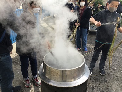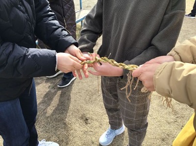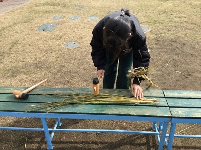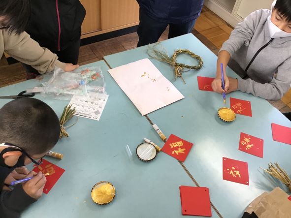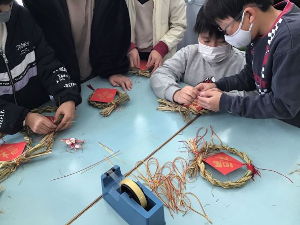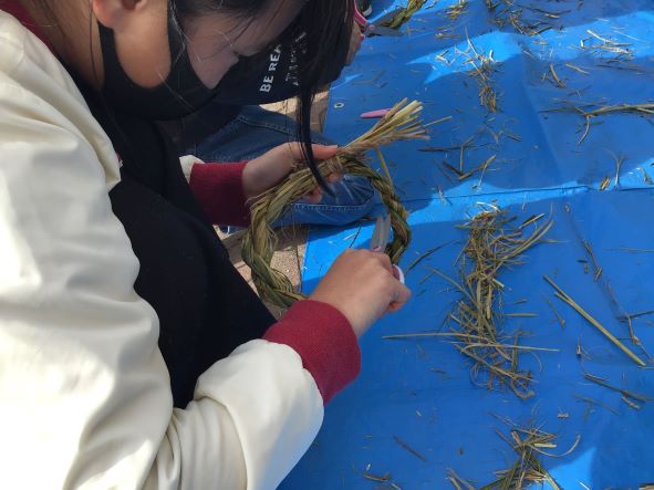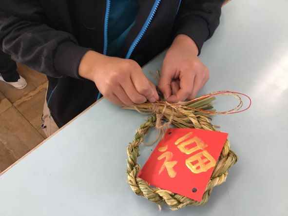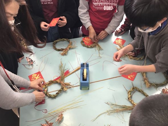注連繩製作手工繁複,這次使用的稻草是武藏村山市第三小學校五年級學生在食農教育中親自耕種的稻米收割下來的,要先用熱水燙過,再用木槌仔細敲打軟化纖維,老師、家長與孩子合力編織扭轉,用草繩用力綁牢固定後才完成84個。老師也拍下了製作經過的照片和影片,讓再興師生能更深入認識日本文化。祖嫻同學說注連繩一定要花很多時間才能完成,很謝謝學伴送了這麼棒的禮物讓我們在新年裝飾家裡;沛澐同學想要親自對他們說「辛苦了」;承佑同學說看到學伴一步一步的合力完成很感動,也很謝謝還特地用書法寫春聯送給我們;荷凌說回家會布置在門上迎接新年,也想跟家人介紹注連繩是怎麼做的,還有代表的意義。