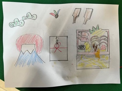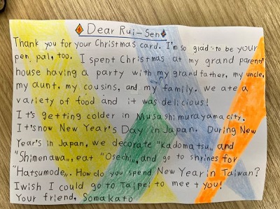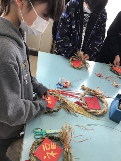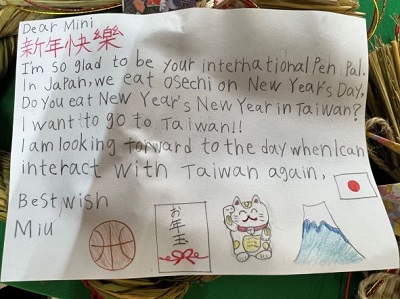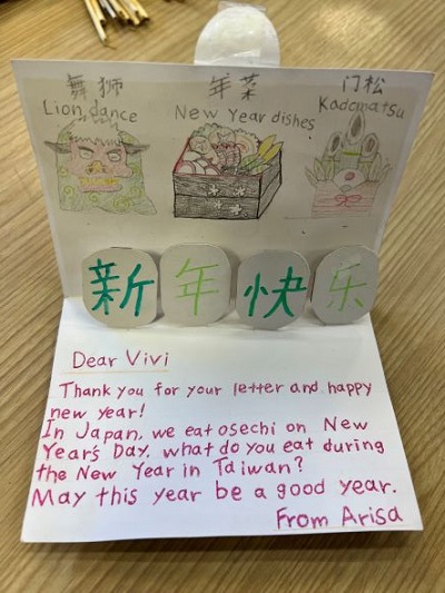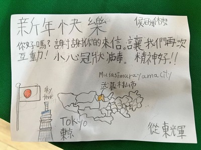 除了注連繩外,小朋友也畫了祝福卡片介紹日本新年習俗,例如裝飾的門松、糯米搗製的鏡餅、新年遊戲板羽球等。武藏村山市第三小學校石河老師說注連繩在神道信仰中,代表了凡人和天神的結界,過年期間掛在門上,象徵將厄運和晦氣阻擋於家門外,近日世界各國疫情又轉趨嚴峻,希望能夠透過致贈注連繩表達關懷,同心協力度過這段,也祈願疫情早日退散。宇萱同學說這樣的機會很難得,很感謝學伴這麼用心;婕忻同學可以從裝飾滿滿的注連繩和卡片感覺到日本學伴的用心和誠意,非常希望疫情能夠早日好轉;炫晰同學說很希望能透過視訊親自跟學伴道謝,祝福他們新的一年平平安安、健健康康。