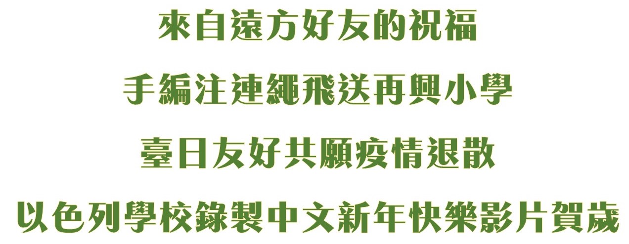 雙方小朋友透過交換祝福禮物認識了彼此的新年習俗,原本紅白水引的注連繩,加入臺灣農曆新年元素,經過文化符號表徵轉換產生新的文化意義,也使既有的內涵更加多元豐富,在這次交流中,連結的不僅是臺日二校間的情誼,更是文化的激盪與共融共好。 在此同時,以色列交流學校G.E.T. School也特別錄製了中文新年快樂祝福影片送給再興師生,也分享了希伯來文新年快樂的說法。願在新的一年,再興小學和交流學校全體親師生都能美好豐收。 |