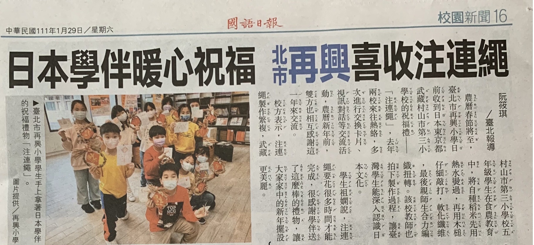 國語日報媒體報導 中央通訊社 Focus Taiwan日文報導 在農曆新年來臨前夕,臺北市私立再興小學收到了來自日本東京都武藏村山市第三小學校的祝福禮物—注連繩(しめ縄)。注連繩是日本新年傳統飾品,也是神道教信仰中使用的道具,具備趨吉避凶的意涵。去年二校來往熱絡,辦理了交換卡片、視訊對話等多次交流活動。聖誕節前再興孩子結合校慶、手做聖誕卡片祝福日本學伴,第三小學校親師生親手製作注連繩回禮,雙方相互感謝這一年來的協作與收穫。 傳統的日本注連繩是用稻草編製,再使用紅白雙色的水引(みずひき)繩結裝飾;考量到白色在臺灣多用於喪儀,第三小學校特別改用紅金雙色繩子綁製,並串上紅底金字的「福」字春聯和紅穗流蘇,再以手折和紙圖樣的紙鶴裝飾,承頡同學說收到的注連繩同時使用象徵日本和臺灣的東西來裝飾,好像用稻草繩結串起了二國的友誼一樣;翊丞和炫晰同學說是第一次看到注連繩,都覺得稻草聞起來很香,有粽子也有塌塌米的味道。