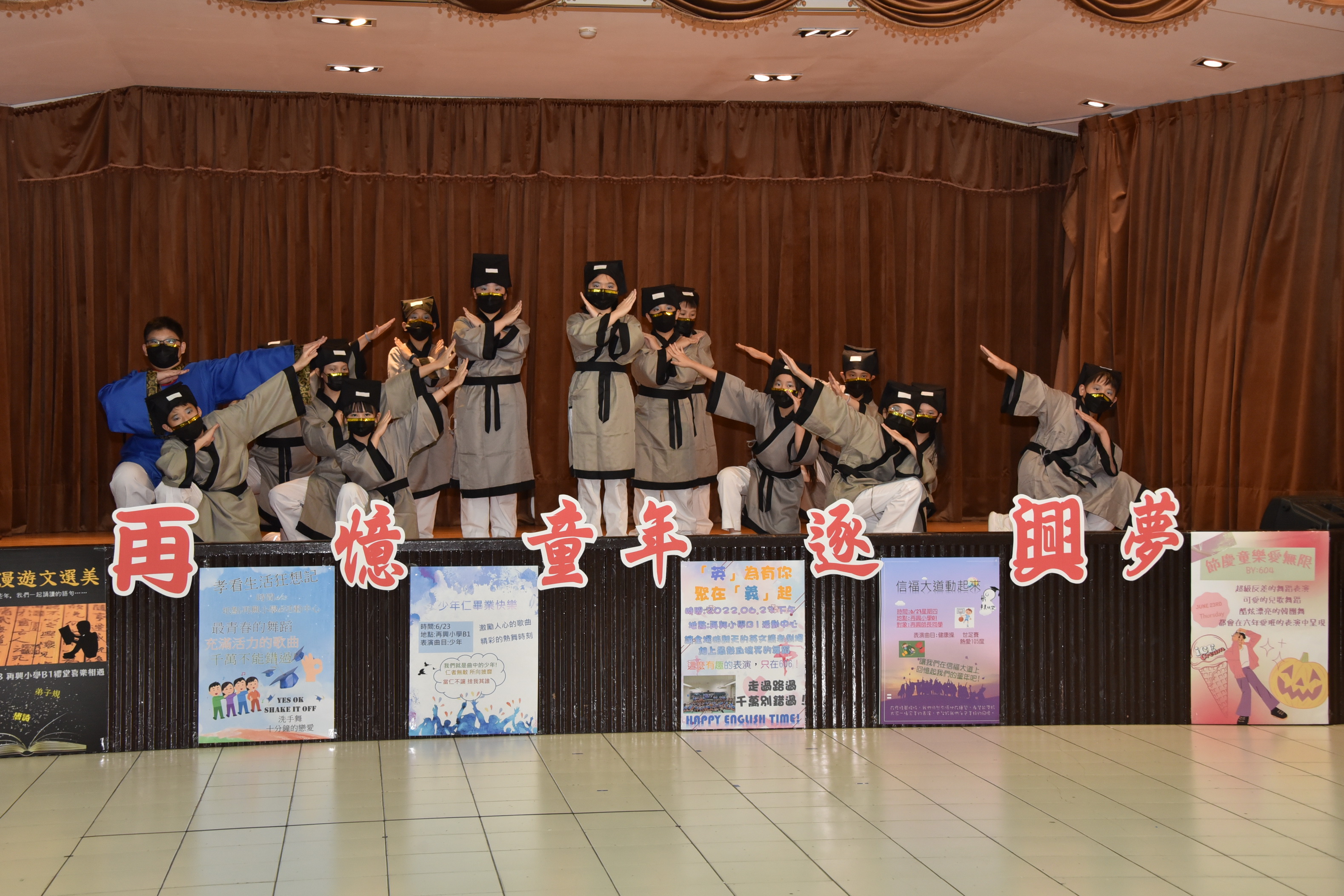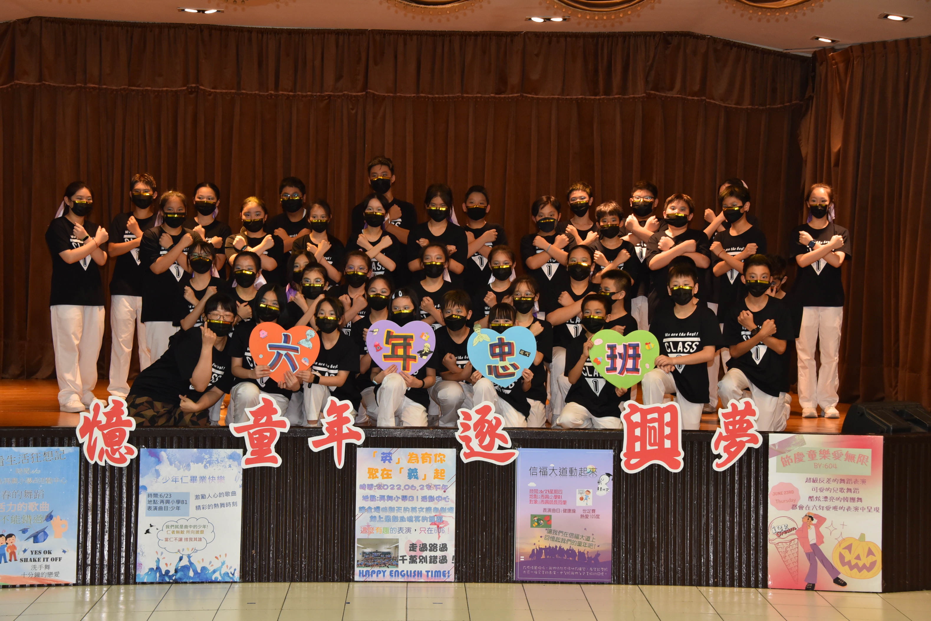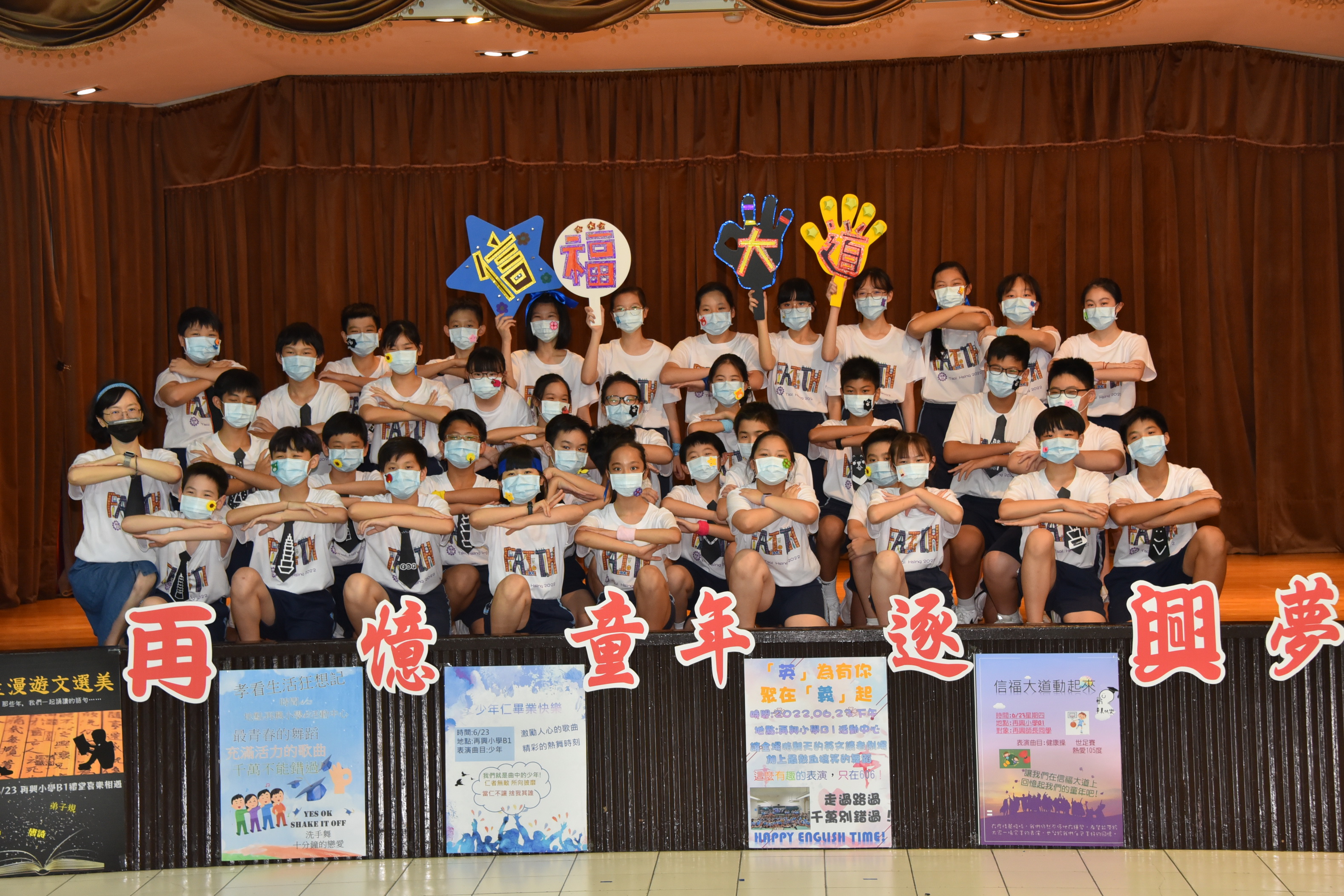 再憶童年逐興夢—2022畢業展演活動 今年因新冠肺炎疫情畢業展演改為錄影方式進行,學校於111年6月23日下午於學校B1活動中心進行六年級畢業展演錄影。今年的主題為「再憶童年逐興夢」,此次的展演內容展現出64屆畢業生在美術創作、音樂、舞蹈、戲劇、說唱藝術等藝文領域的多元學習成果。六年忠班「忠生漫遊文選美」,介紹學生六年學習文選弟子規、唐詩、論語並以舞蹈方式呈現;六年孝班的「孝看生活狂想記」,呈現學生六年學校生活洗手防疫、安全教育—等,並用下課鐘聲串起演出;六年仁班「少年仁畢業快樂」,表現學生六年學校生活快樂的一面;六年愛班「歡樂節慶愛無限」,以學生經歷春夏秋冬四季學校所舉辦的活動:萬聖節、兒童節健行、校慶、社團成發—等;六年信班「信福大道動起來」,參與學校體育活動:扯鈴、跳繩、籃球、體操、舞蹈—等並結合學生專長展現;六年義班「英為有你在義起」,藉由英語讀者劇場展現學生上課所學並以舞蹈、劇場方式表演。今年的畢業展演雖然是錄影但學生的表演依然精采,謝謝幕後所有的老師們所給予畢業生的指導,期許你們創造出屬於64屆畢業生的燦爛光芒。 |