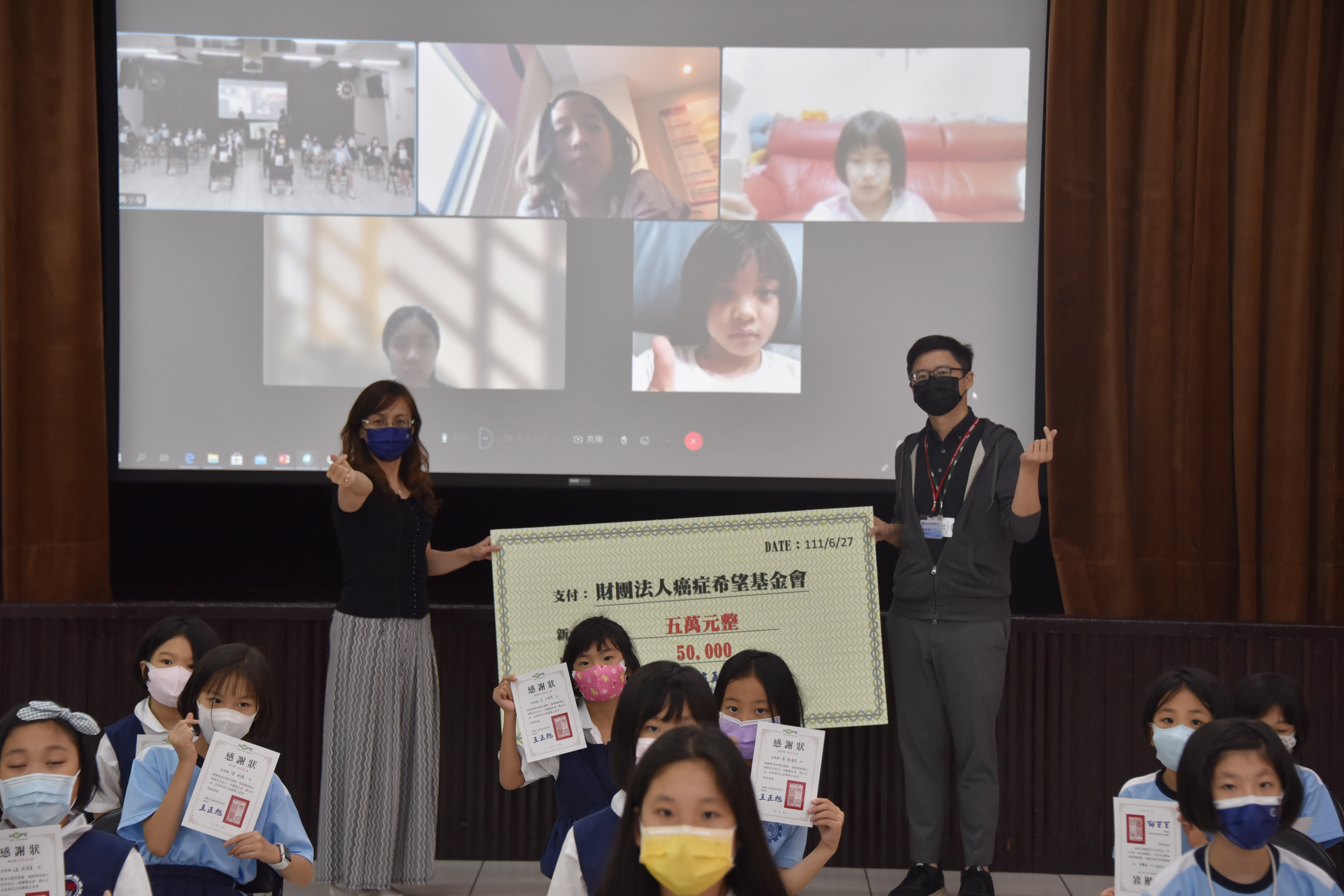 捐髮活動中亦播放了孩子剪髮的照片、剪髮過程所彙整成的影片,大家都聚精會神的觀看這令人感動的畫面。接著進行捐贈儀式,再興小學從兒童節仁愛捐款中撥出5萬元,捐贈癌症希望基金會專款製作假髮,楊珩校長表示:希望再興學子延續創校以來行善分享愛的理念,將這份愛傳遞下去。最後大家合影留念,記錄下這場特別的實體、線上混成捐髮活動。 |