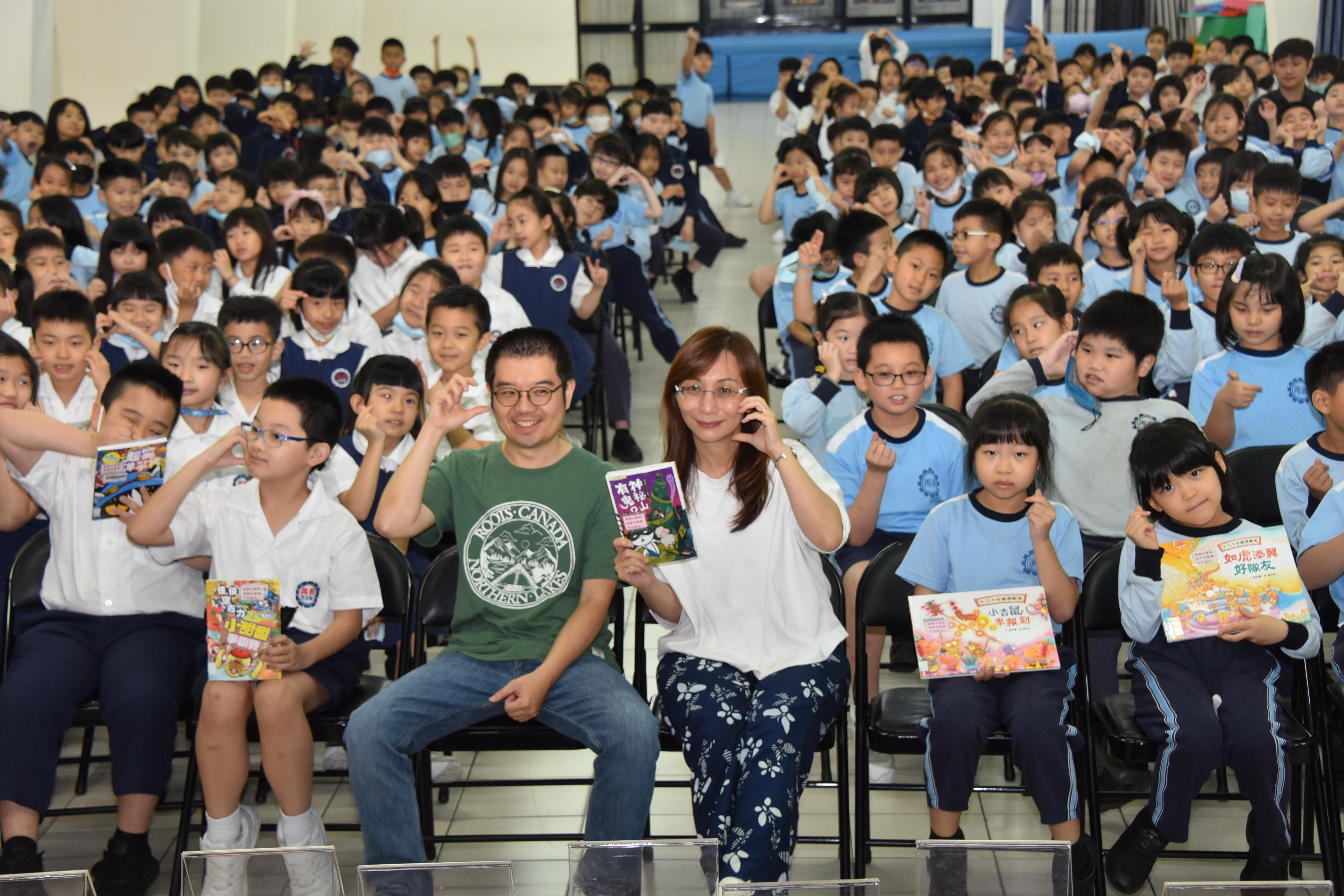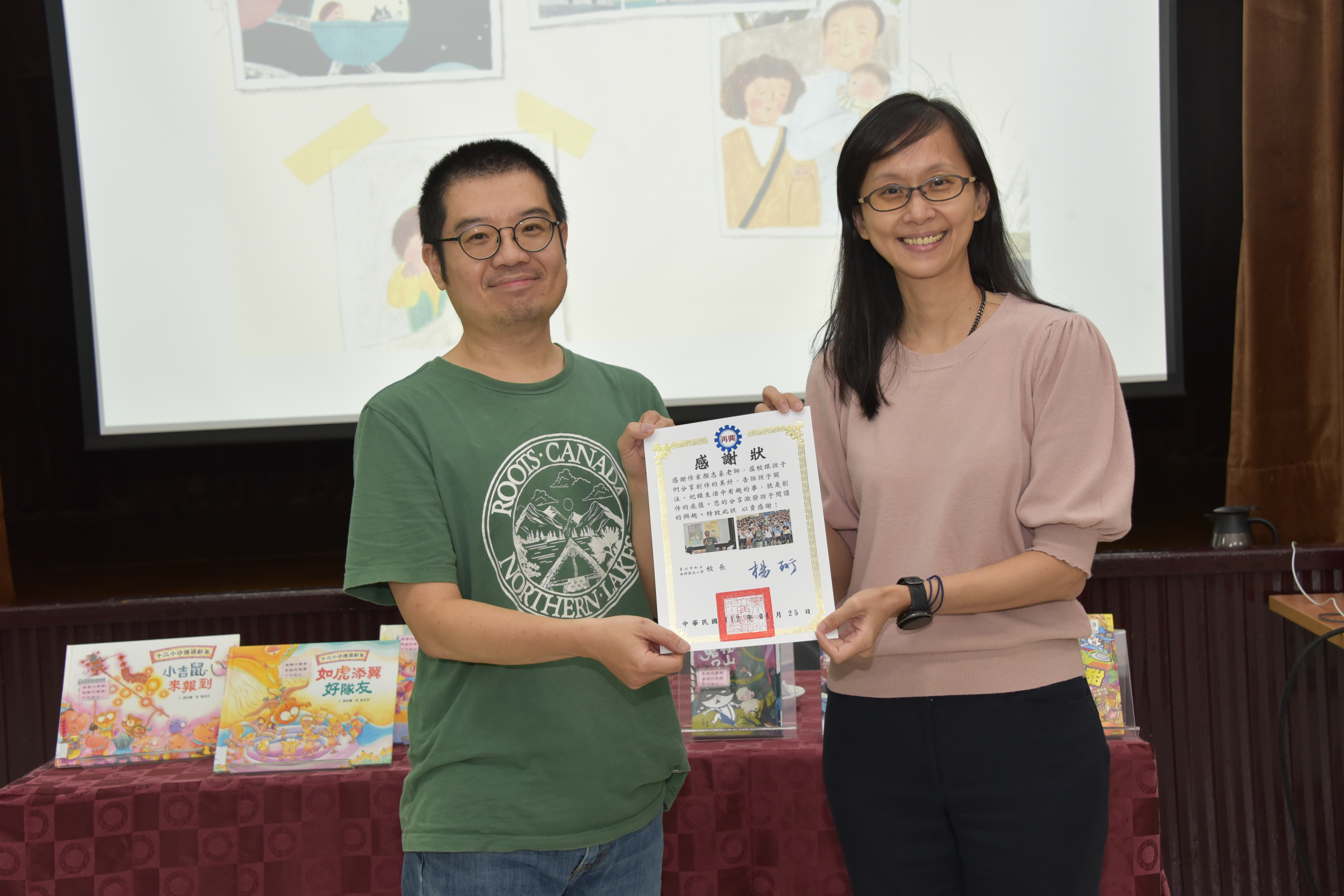 獻給爸爸的書──《夢遊》 顏志豪老師小時候會夢遊,一開始爸爸還帶他去收驚,後來去看醫生後才知道是夢遊症,醫生說不能把夢遊的人叫醒,只能慢慢引導他回到床上,所以每次夢遊,爸爸就會跟著顏志豪老師,守護著他的安全,再帶他回家。書中的小男孩夢遊症發作,從窗戶走出去,沿路摘了花、搭了火車,最後到山上看爺爺奶奶,才心滿意足地被爸爸帶回家。故事溫馨,同時也訴說著顏志豪老師對爺爺奶奶的想念,以及對爸爸的感謝。 低年級的作家有約初體驗有歡笑、有機智挑戰、有高聲歡唱,還有滿滿的感動,師生們共營氣氛在三連拍的大合影中圓滿落幕,也衷心感謝顏志豪老師遠道而來。 |