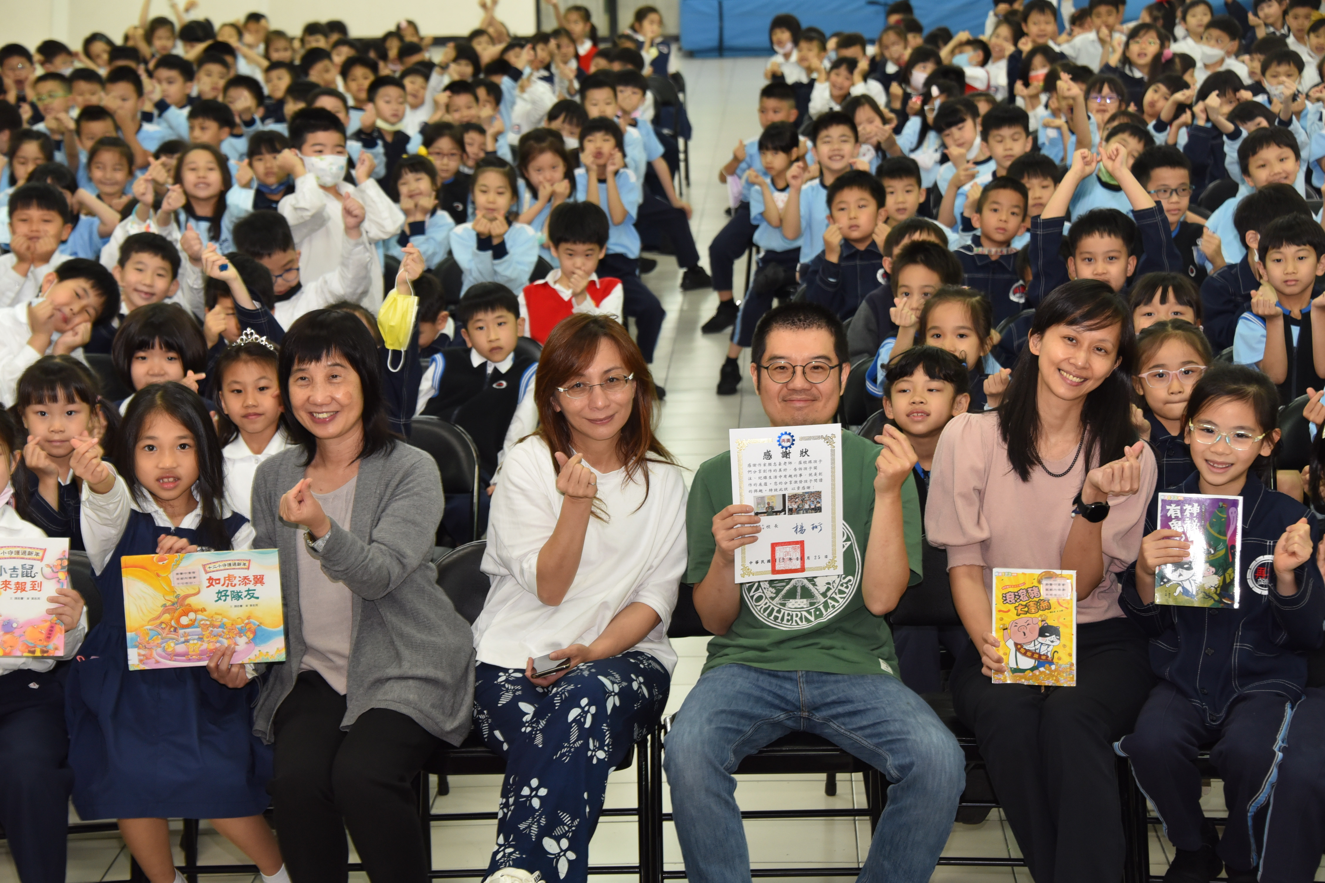 低年級的作家有約初體驗有歡笑、有機智挑戰、有高聲歡唱,還有滿滿的感動,師生們同享歡樂氣氛在三連拍的大合影中圓滿落幕,也衷心感謝顏志豪老師遠道而來。