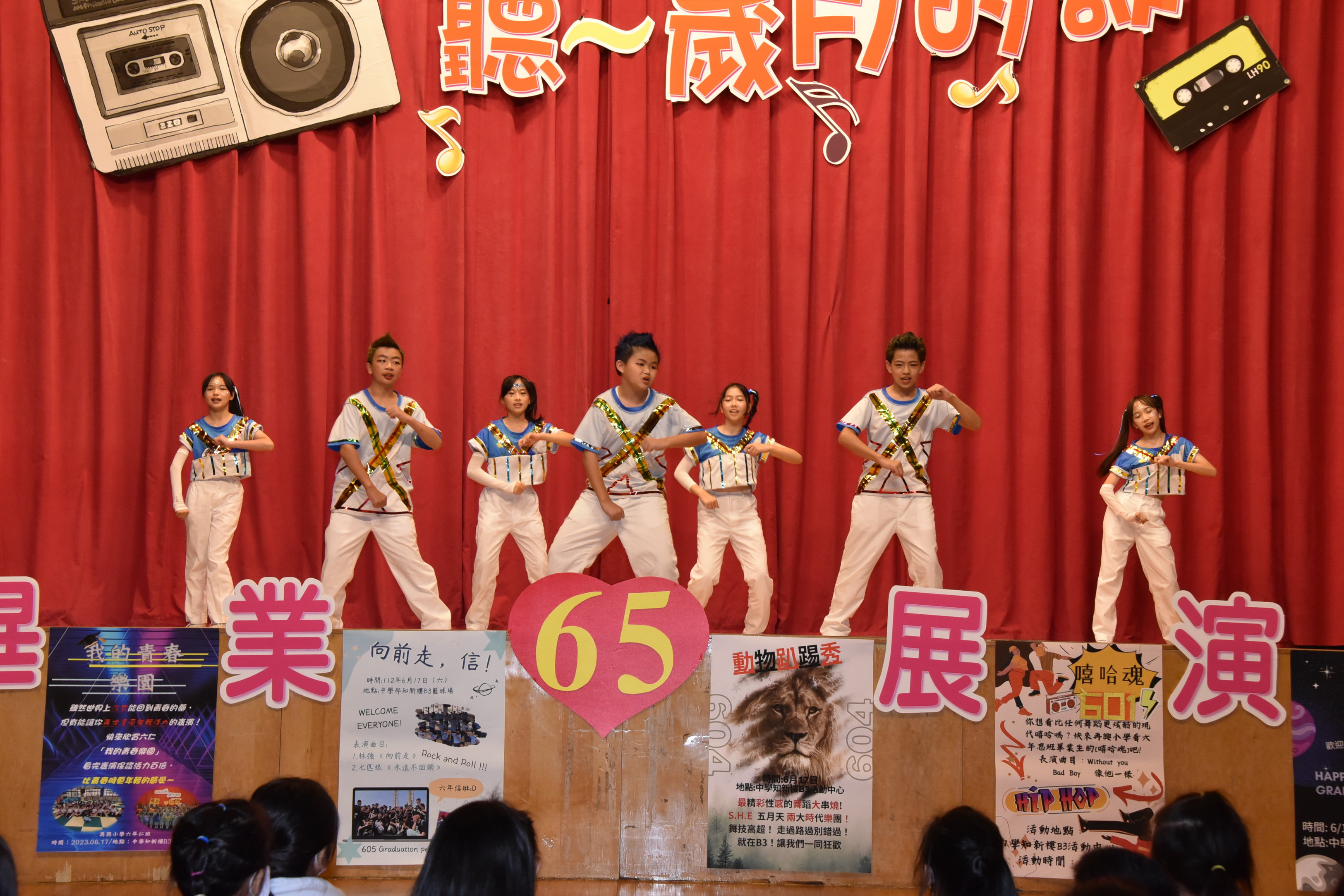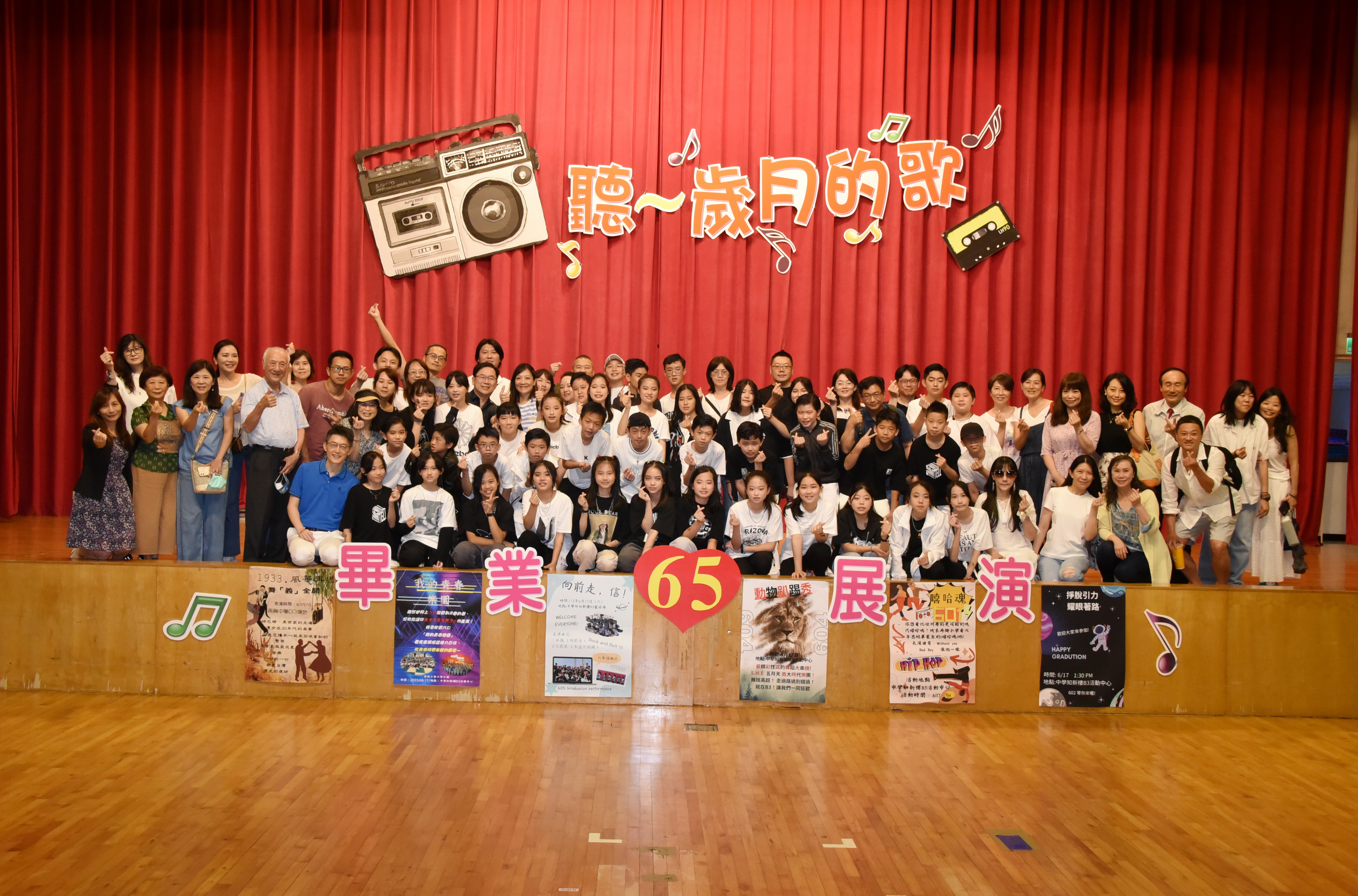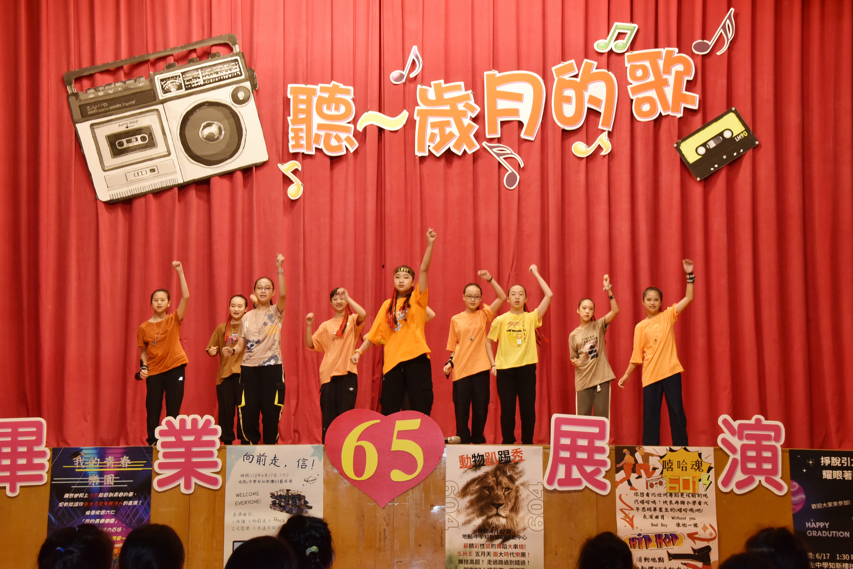 聽,歲月的歌—2023畢業展演活動 學校於112年6月17日下午於中學知新樓B3活動中心進行六年級畢業生學習成果動態展活動。今年的主題為「聽,歲月的歌」,此次的展演內容展現出65屆畢業生在美術創作、音樂、舞蹈、戲劇、說唱藝術等藝文領域的多元學習成果。 六年義班「1933風華再現」:介紹台灣歌謠之父雨賢的作品,並把歌曲融入創作舞蹈最後以舞蹈時代劇方式呈現;六年仁班的「我的青春樂園」:介紹青春偶像及團體—小虎隊、城市少女、張雨生等,透過改編歌曲配合舞蹈呈現出當年青春活力四射的團體及偶像;六年信班「台式搖滾」:介紹台灣搖滾的代表人物及團體—伍佰、林強、七匹狼,透過歌區及服裝呈現出台式搖滾的精華;六年愛班「動物趴踢秀」:介紹紅遍亞洲的男女天團—S.H.E、五月天,透過歌曲、舞蹈呈現出天團的特色;六年忠班「嘻哈魂」:現代的嘻哈帶給學生不同的活力,介紹嘻哈代表人物—高爾宣、張惠妹、黃明志,透過曲風及服裝、舞蹈表現嘻哈世界的精髓;六年孝班「掙脫引力 耀眼著陸」:介紹現代青春團體偶像—告五人 五堅情、原子少年,學生透過歌曲、舞蹈展現出時下年輕人Z 世代的活力。