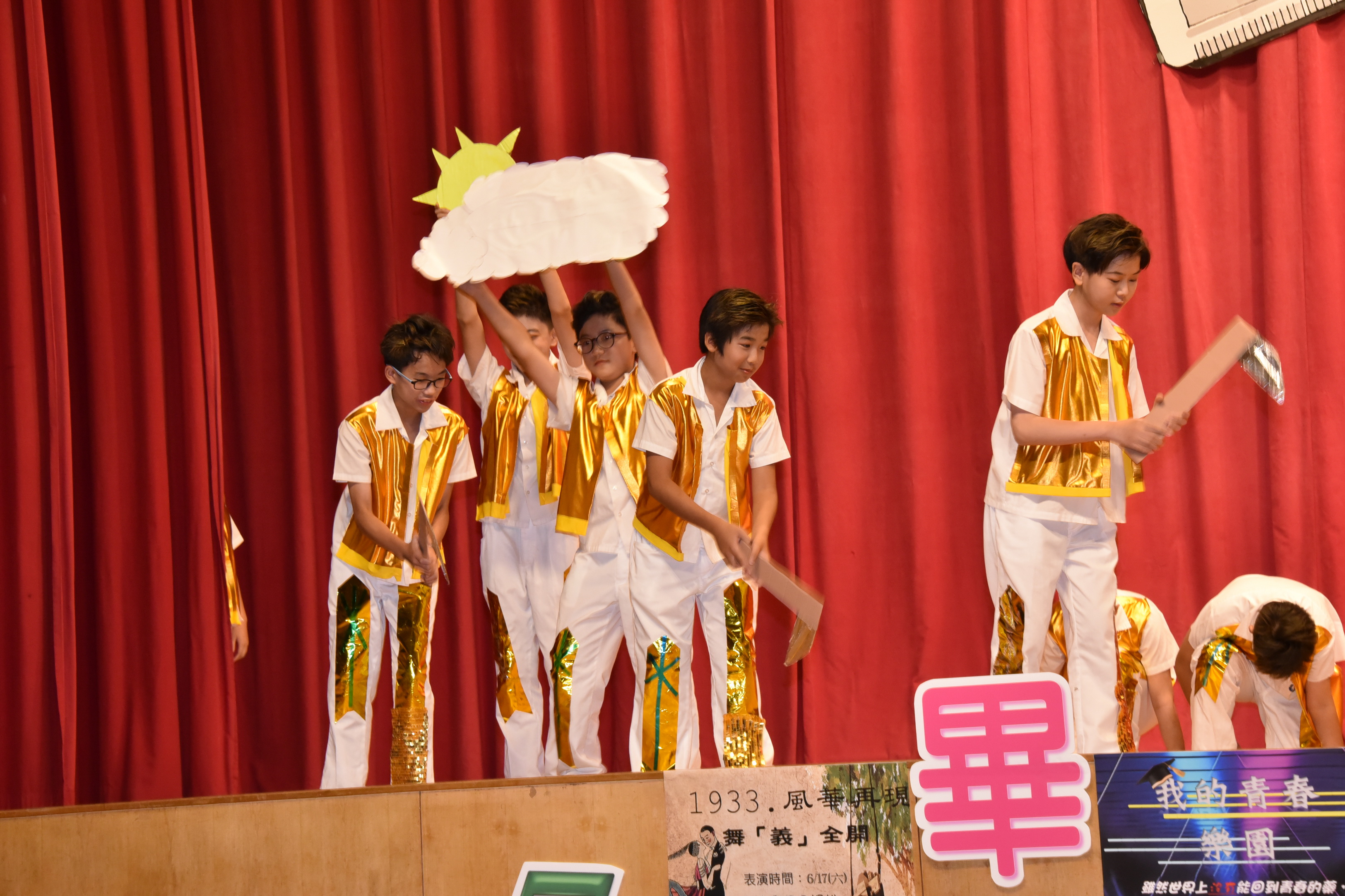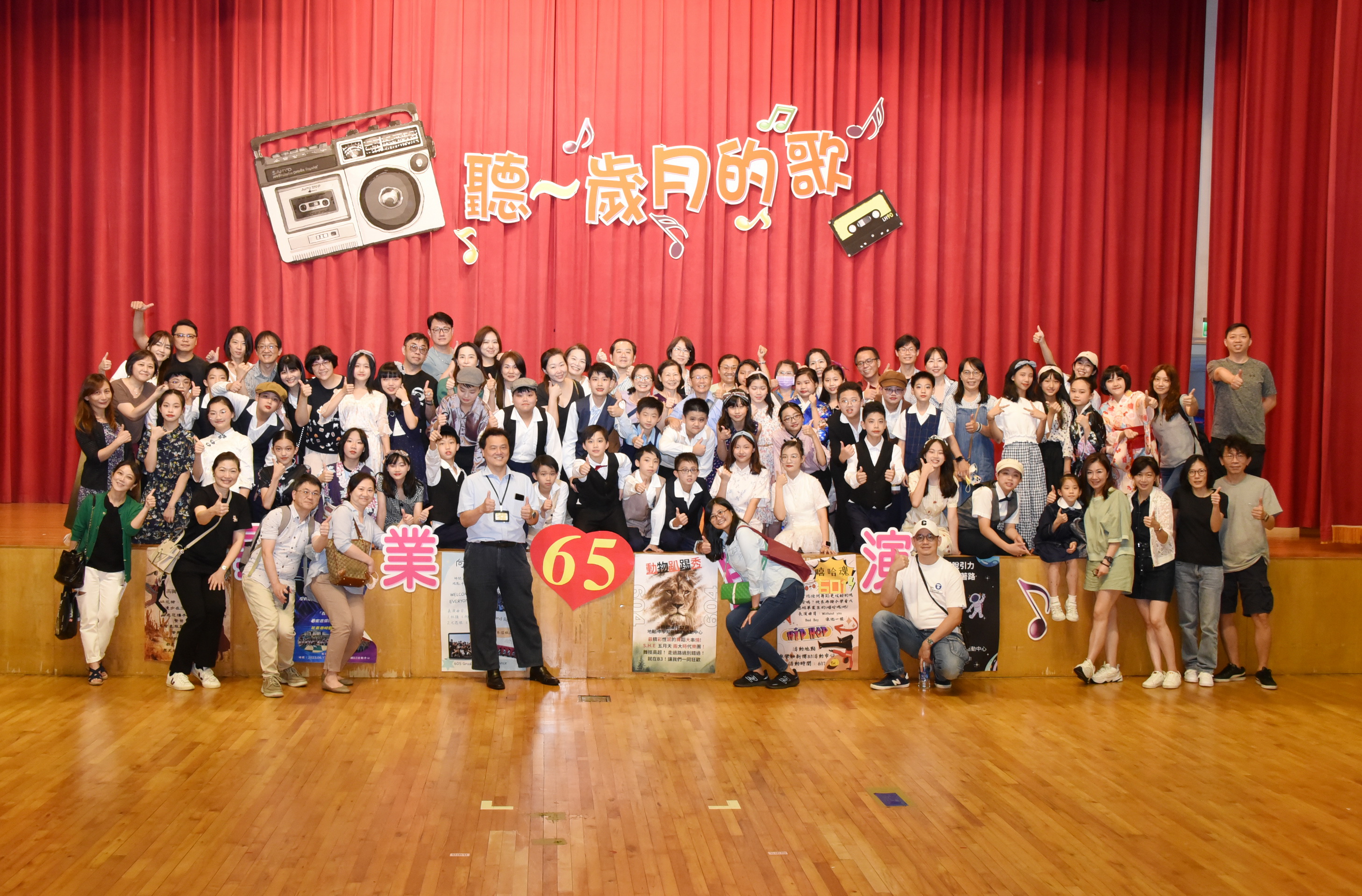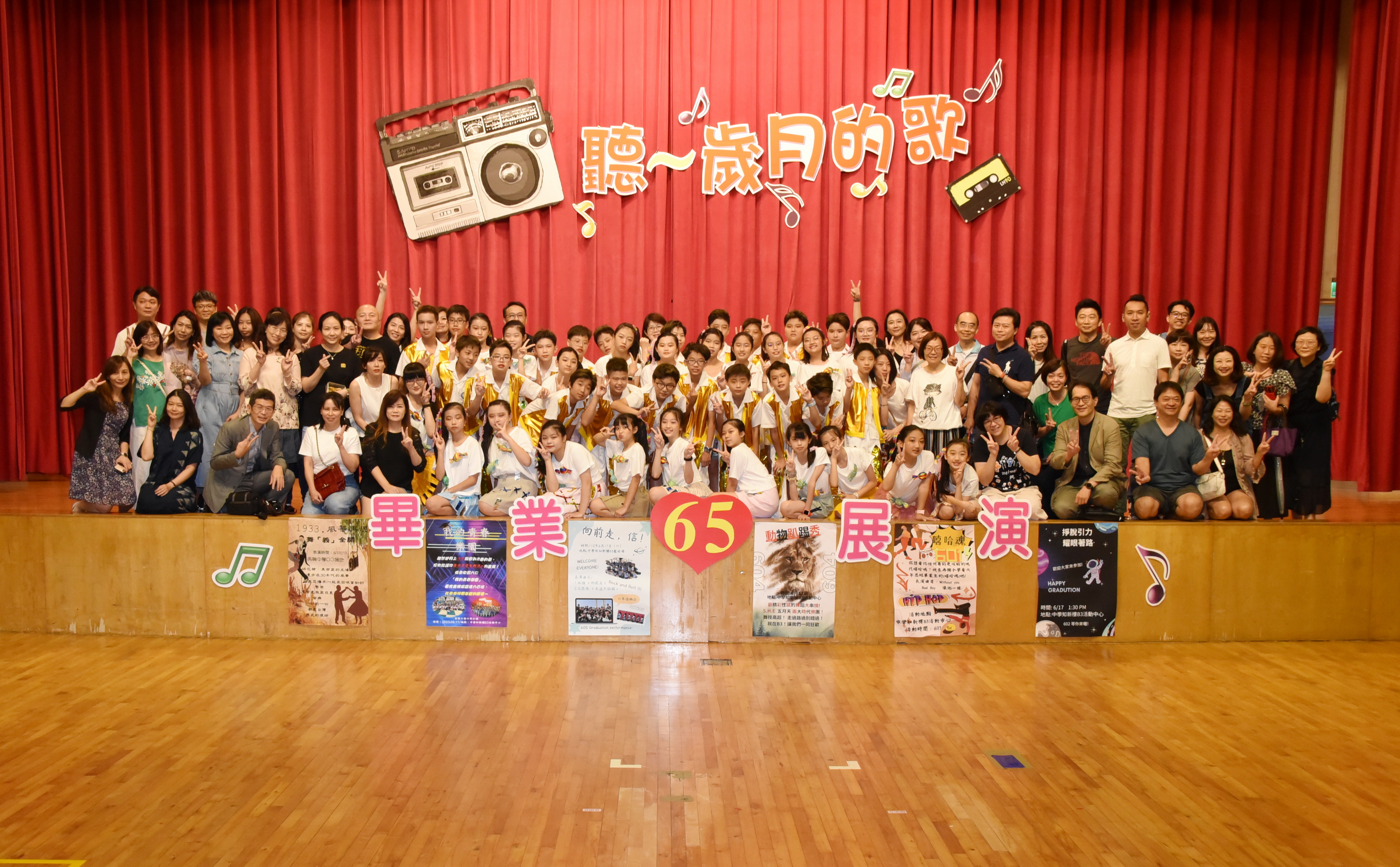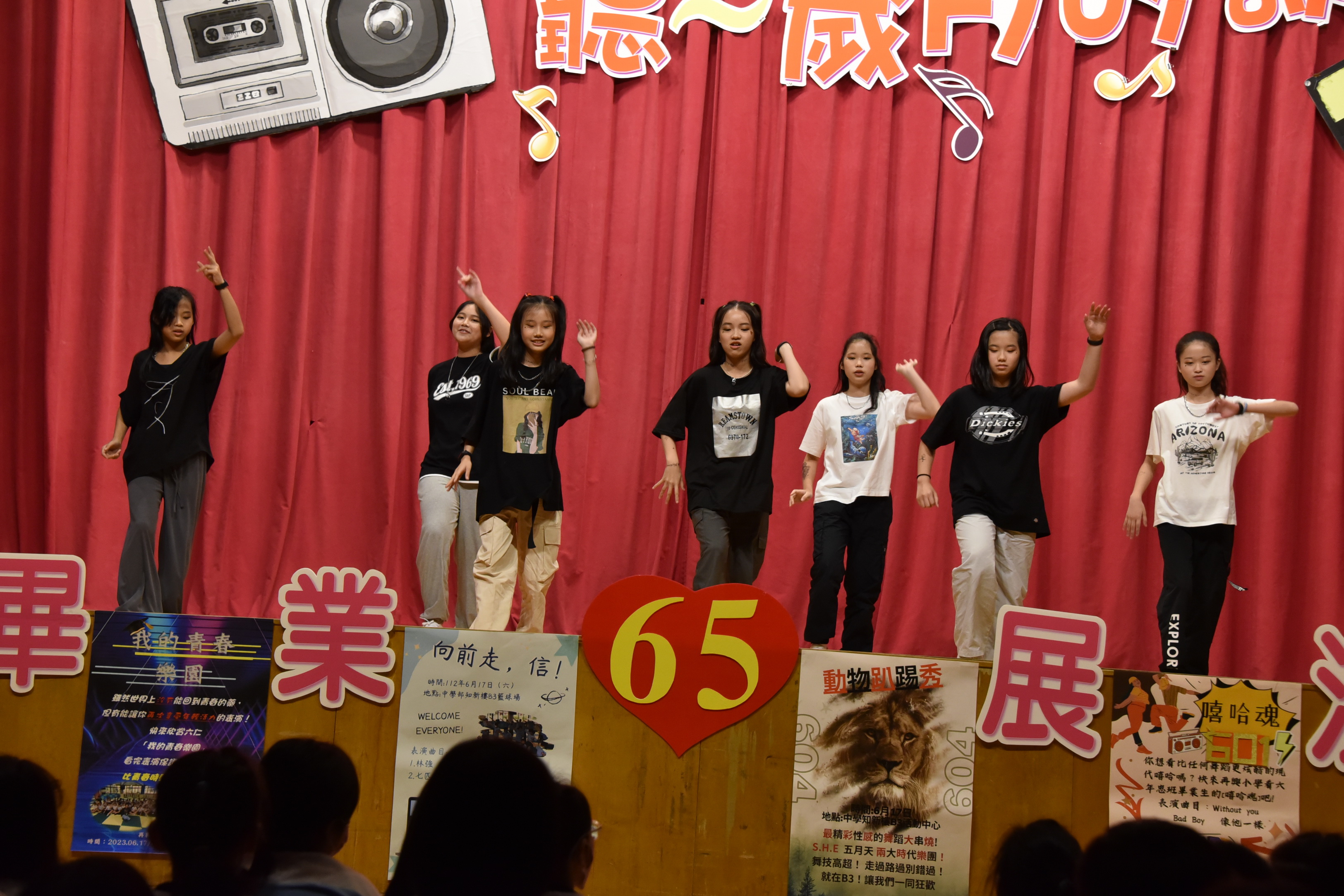 聽,歲月的歌—2023畢業展演活動 學校於112年6月17日下午於中學知新樓B3活動中心進行六年級畢業生學習成果動態展活動。今年的主題為「聽,歲月的歌」,此次的展演內容展現出65屆畢業生在美術創作、音樂、舞蹈、戲劇、說唱藝術等藝文領域的多元學習成果。 六年義班「1933風華再現」:介紹台灣歌謠之父雨賢的作品,並把歌曲融入創作舞蹈最後以舞蹈時代劇方式呈現;六年仁班的「我的青春樂園」:介紹青春偶像及團體—小虎隊、城市少女、張雨生等,透過改編歌曲配合舞蹈呈現出當年青春活力四射的團體及偶像;六年信班「台式搖滾」:介紹台灣搖滾的代表人物及團體—伍佰、林強、七匹狼,透過歌區及服裝呈現出台式搖滾的精華;六年愛班「動物趴踢秀」:介紹紅遍亞洲的男女天團—S.H.E、五月天,透過歌曲、舞蹈呈現出天團的特色;六年忠班「嘻哈魂」:現代的嘻哈帶給學生不同的活力,介紹嘻哈代表人物—高爾宣、張惠妹、黃明志,透過曲風及服裝、舞蹈表現嘻哈世界的精髓;六年孝班「掙脫引力 耀眼著陸」:介紹現代青春團體偶像—告五人 五堅情、原子少年,學生透過歌曲、舞蹈展現出時下年輕人Z 世代的活力。