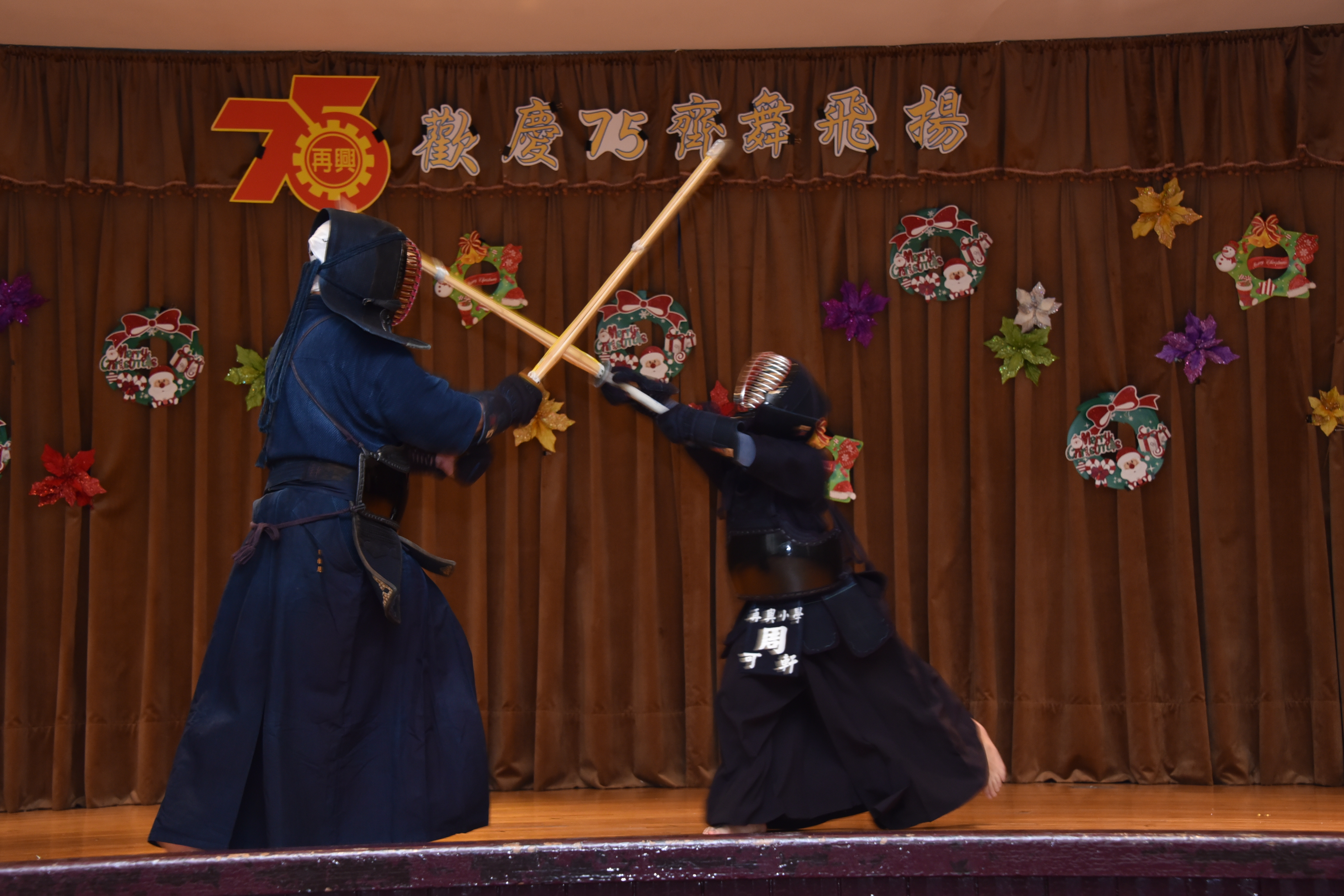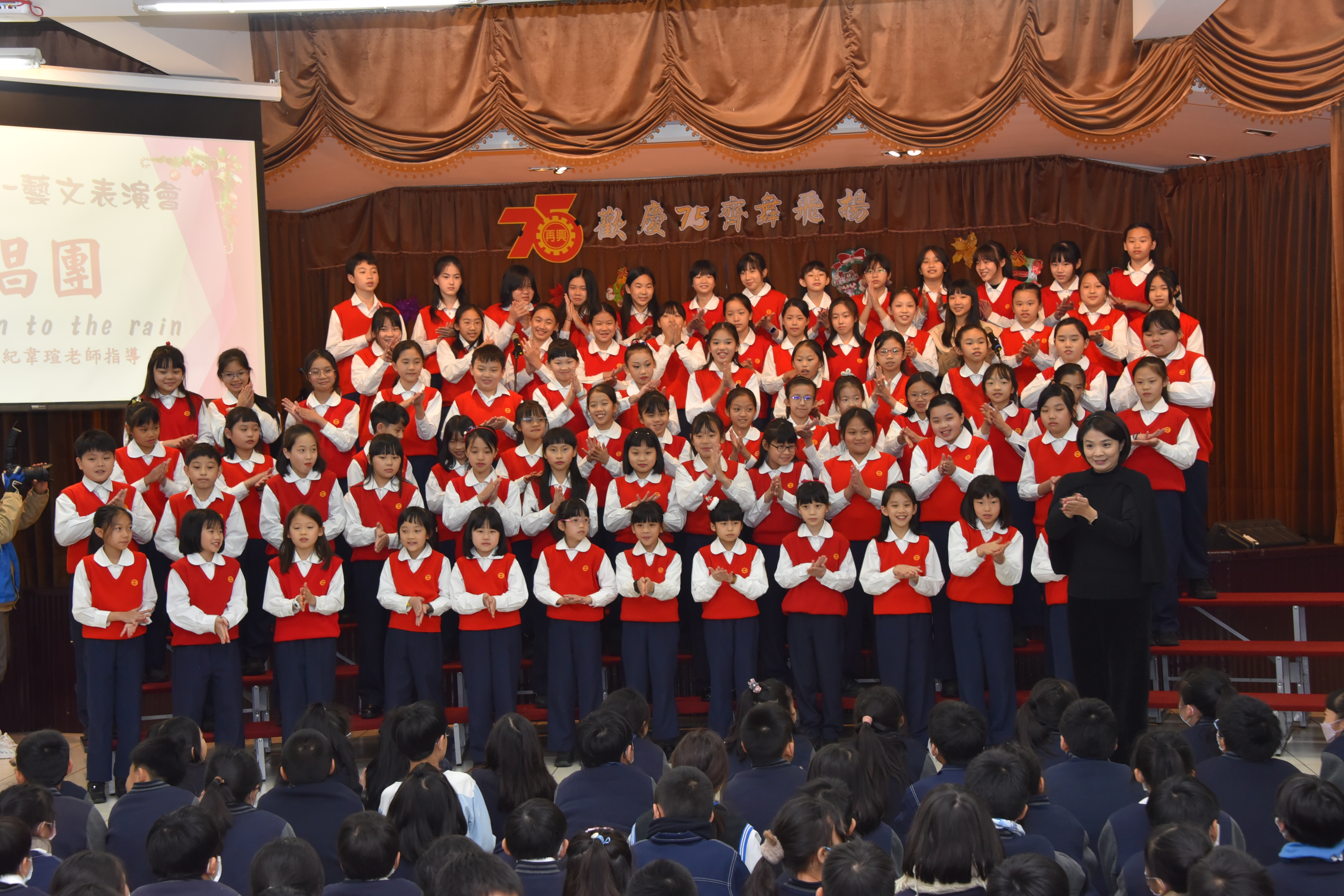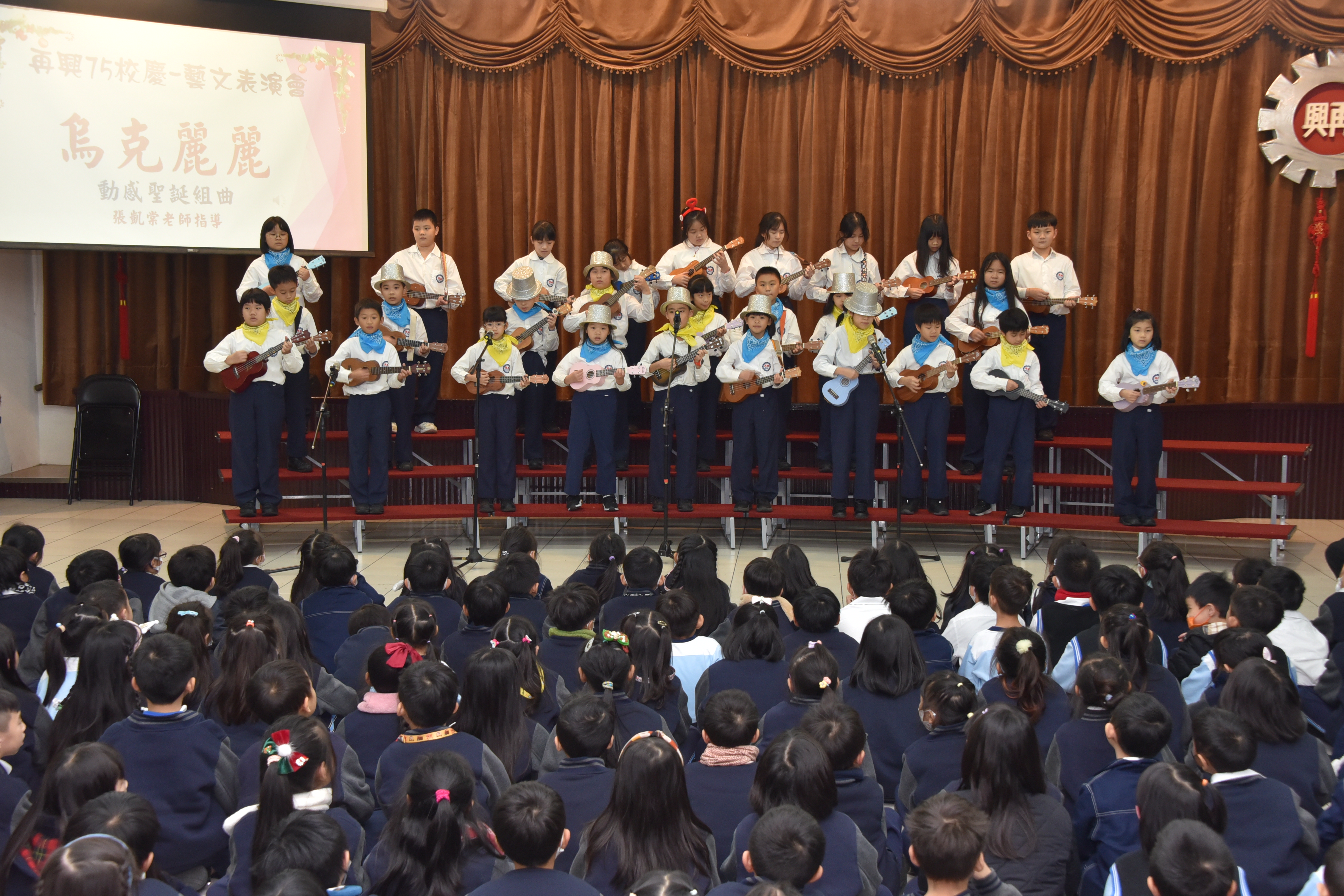 | 藝文表演會~「歡慶75 齊舞飛揚」,由林以婕和賴則均搭檔主持,二人以詼諧逗趣的對話串起一系列精采的表演節目。首先五孝吳采芯以充滿自信的魅力演出精彩的爵士鼓;五信王語銓踩著優雅的舞步舞出一段富有韻律的芭蕾;四義周可軒和爸爸在四愛林澄徹旁白的介紹下,帶來一系列劍道展演及對打示範,精采的演出讓觀眾們爆以熱烈的掌聲;兒童舞蹈在黃于庭老師的帶領下,帶來動感K-POP,展現出舞蹈的力與美;王鶯玲老師指導的直笛團吹奏著電影「神鬼奇航」主題曲帶領聽眾一同前進大海;張凱棠老師帶領烏克麗麗社以溫暖又清新的組曲唱出民歌年華;榮獲今年臺北市音樂比賽優等第二名的合唱團,在蔡文瑜老師、紀韋瑄老師指導下,以有趣的歌曲「listen to the rain」與聽眾們互動,利用身體各部位製造出一場別出心裁的雨;文表演會的壓軸,則由簡伯修老師、紀韋瑄老師帶領歷史悠久的弦樂團演出「倫敦鐵橋」、「Raiders march」、「Joy to the world」及「Jingle bells」,以充滿歡慶氣氛的樂曲為校慶帶來滿滿的祝福。最後,在全校師生一起祝賀再興生日快樂、校運昌隆聲中圓滿的結束。藝文表演會是學生在興光樂學課程、課外才藝學習成果的展演舞台,孩子的潛能與多元智慧更在活動中表露無遺,親師生以出色的演出和響亮的掌聲同樂,一起祝福再興75週年生日快樂。 | ||