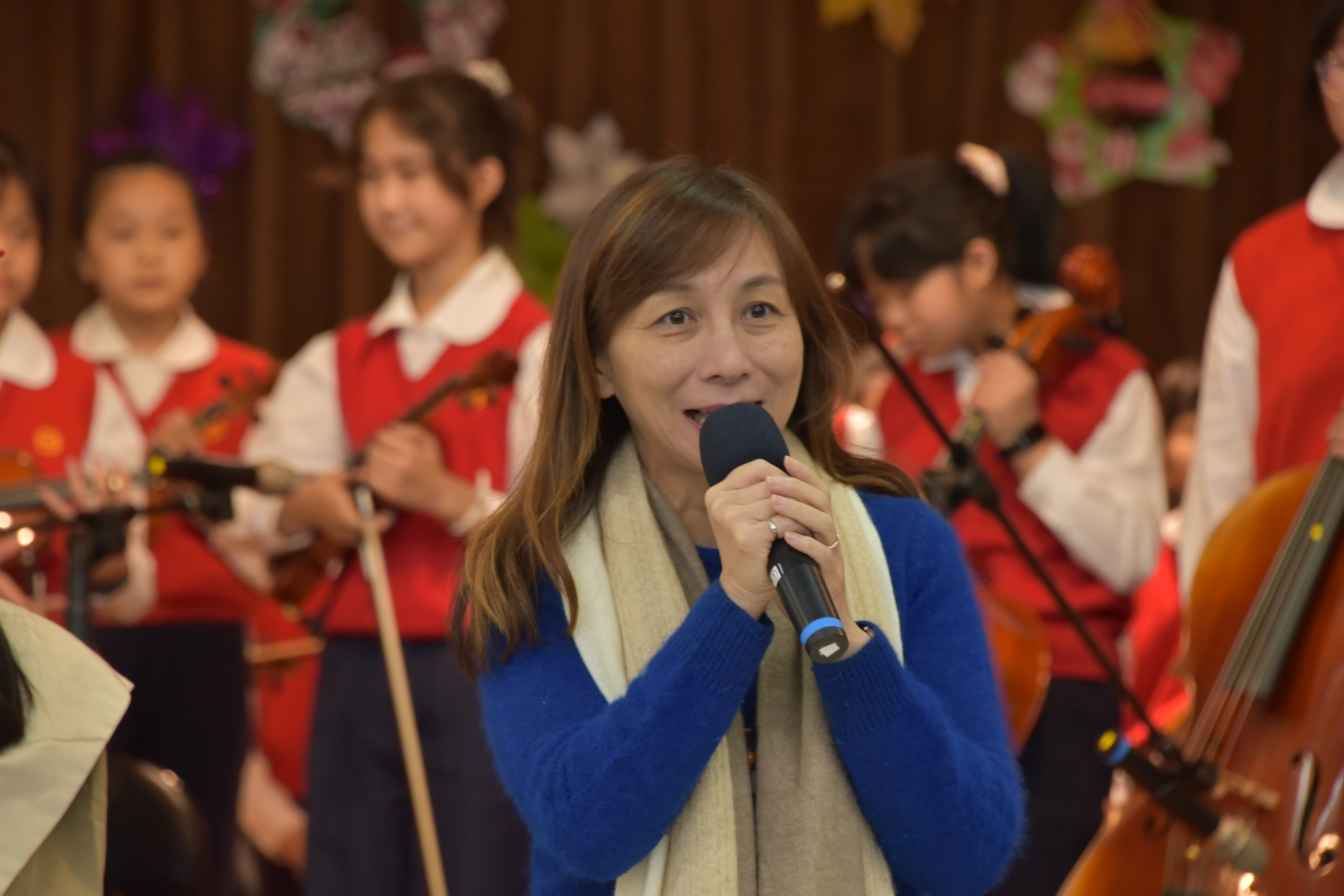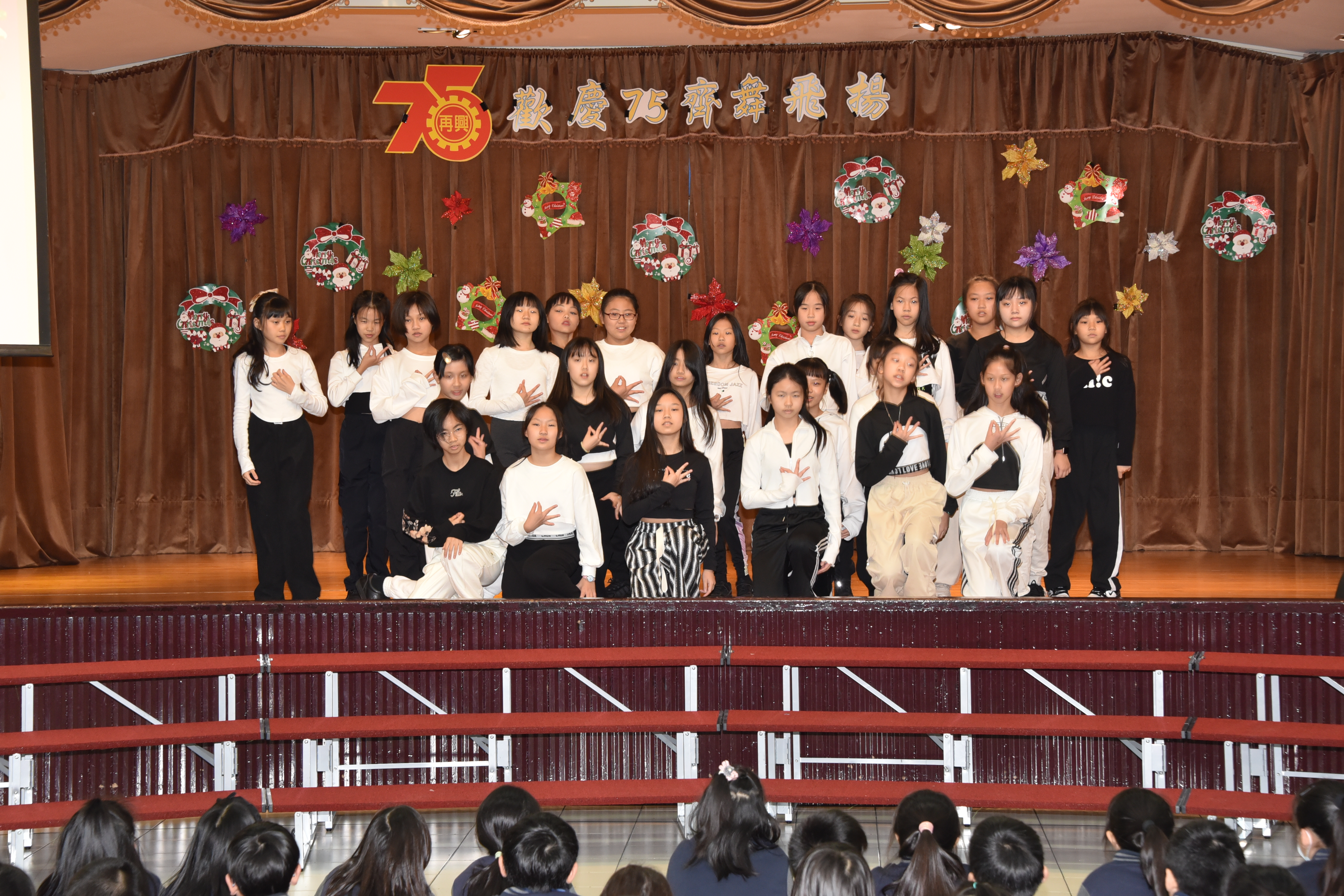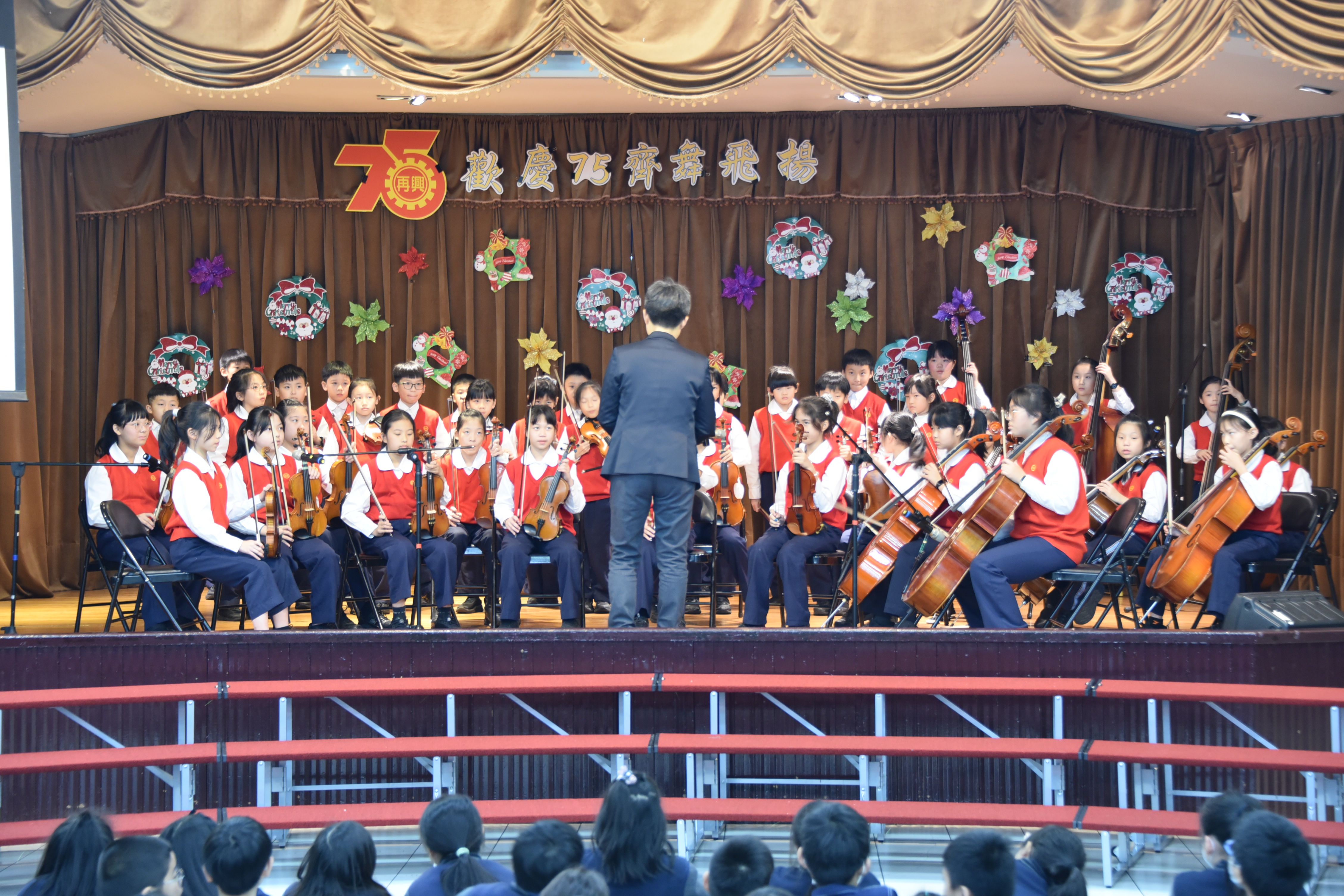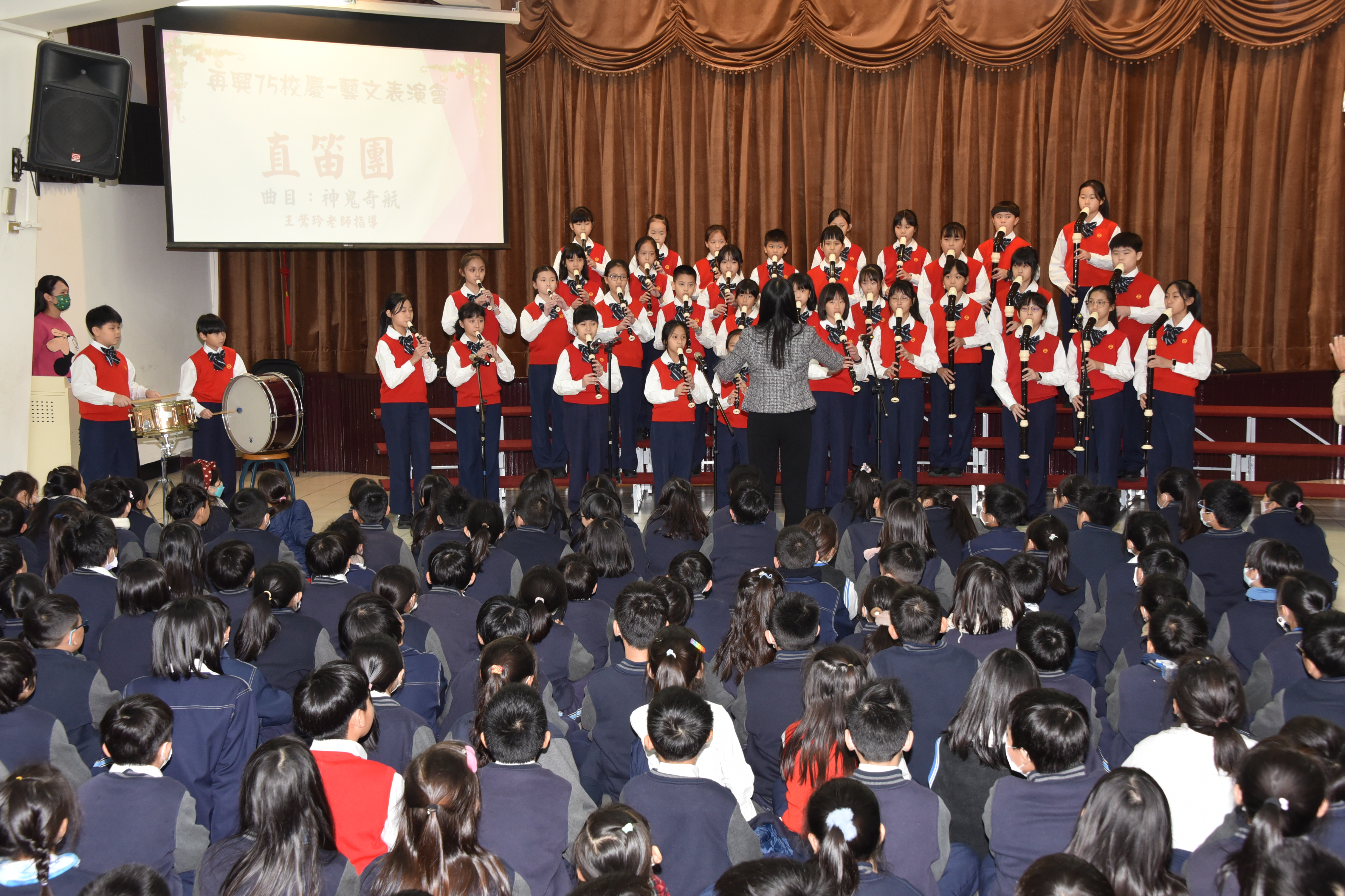 | 藝文表演會~「歡慶75 齊舞飛揚」,由林以婕和賴則均搭檔主持,二人以詼諧逗趣的對話串起一系列精采的表演節目。首先五孝吳采芯以充滿自信的魅力演出精彩的爵士鼓;五信王語銓踩著優雅的舞步舞出一段富有韻律的芭蕾;四義周可軒和爸爸在四愛林澄徹旁白的介紹下,帶來一系列劍道展演及對打示範,精采的演出讓觀眾們爆以熱烈的掌聲;兒童舞蹈在黃于庭老師的帶領下,帶來動感K-POP,展現出舞蹈的力與美;王鶯玲老師指導的直笛團吹奏著電影「神鬼奇航」主題曲帶領聽眾一同前進大海;張凱棠老師帶領烏克麗麗社以溫暖又清新的組曲唱出民歌年華;榮獲今年臺北市音樂比賽優等第二名的合唱團,在蔡文瑜老師、紀韋瑄老師指導下,以有趣的歌曲「listen to the rain」與聽眾們互動,利用身體各部位製造出一場別出心裁的雨;文表演會的壓軸,則由簡伯修老師、紀韋瑄老師帶領歷史悠久的弦樂團演出「倫敦鐵橋」、「Raiders march」、「Joy to the world」及「Jingle bells」,以充滿歡慶氣氛的樂曲為校慶帶來滿滿的祝福。最後,在全校師生一起祝賀再興生日快樂、校運昌隆聲中圓滿的結束。藝文表演會是學生在興光樂學課程、課外才藝學習成果的展演舞台,孩子的潛能與多元智慧更在活動中表露無遺,親師生以出色的演出和響亮的掌聲同樂,一起祝福再興75週年生日快樂。 | ||