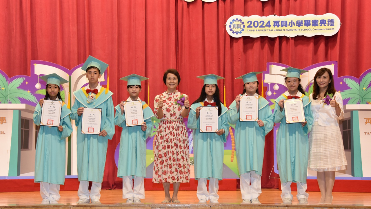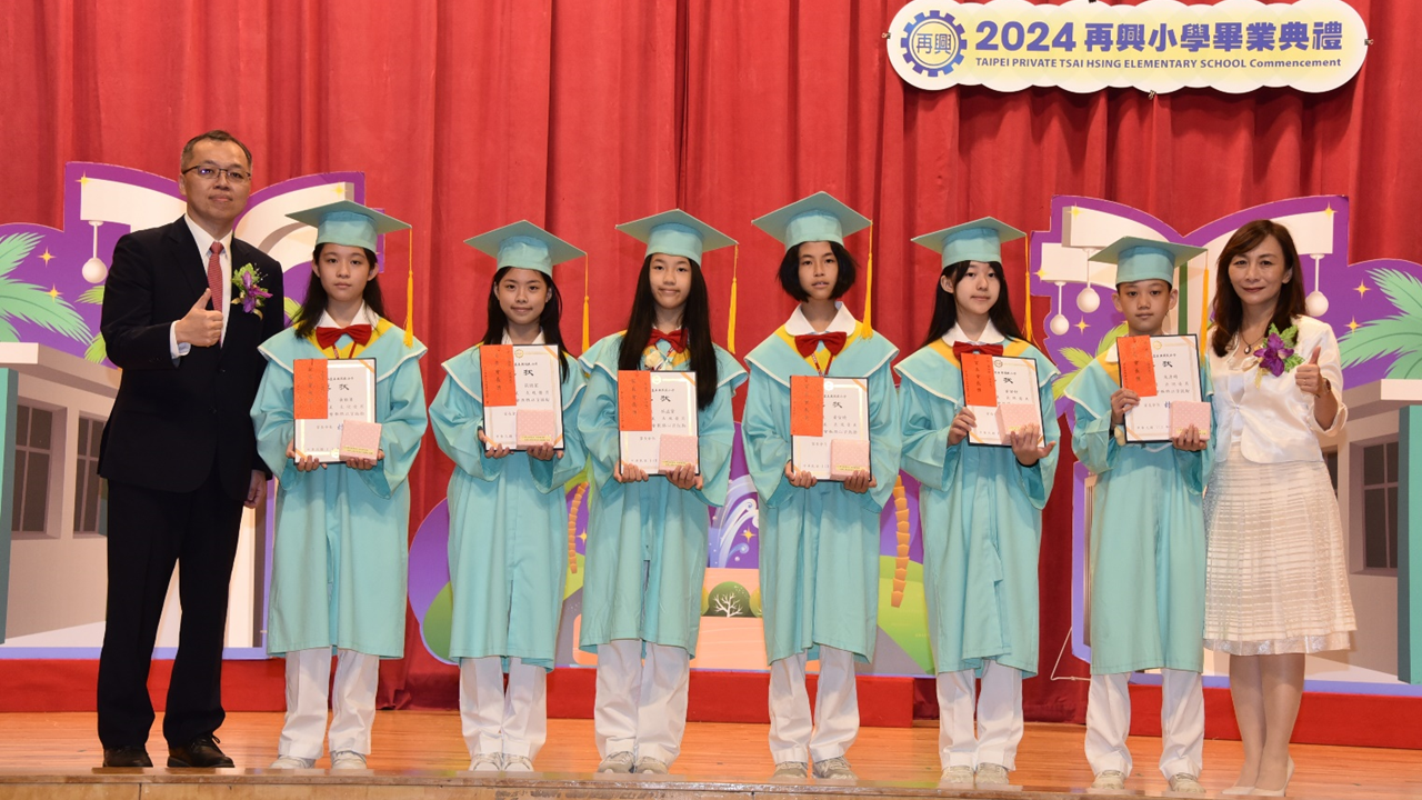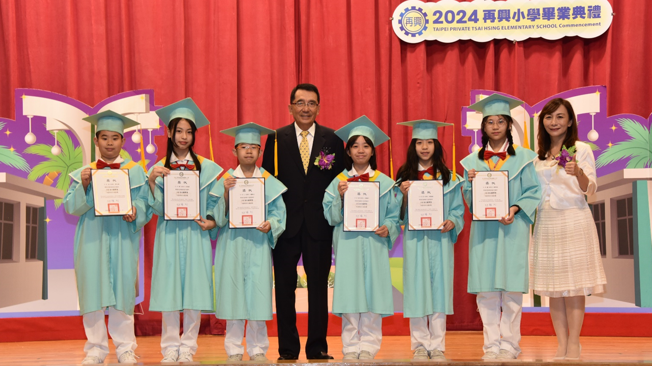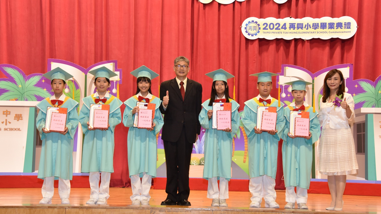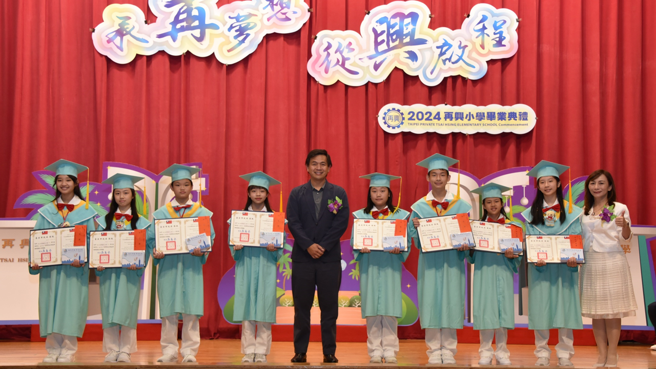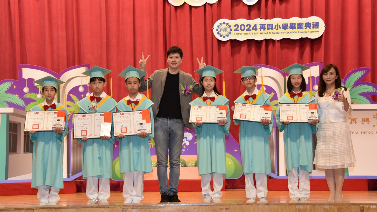 楊珩校長致詞時首先提到:記得6年前手握肥肥軟軟的小手一下子就要變成中學的青少年,在烈日當頭的田徑場、風雨無阻的高爾夫球場、還有各類語文競賽、科學競賽、合唱比賽、藝術展演……都拿到了臺北市、全國賽、甚至世界舞台上優異表現,再興的孩子,是全人、全方位的發展! 校長今天要送給全體畢業生3個勉勵與期許:第一個期許所有的畢業生:對學習要永遠保持熱情!透過認真的學習、探索、閱讀,能快樂生活、品味人生,能讓自己變得更好!花若盛開,蝴蝶自來,人若精采,天自安排,請記得我們的約定: 「做一個更好的自己!」第二個期許是,能感謝失敗、敬畏成功!挫折是讓自己看到不足,感謝每一次的挫折失敗,讓自己能更彈性、更有韌性來迎接挑戰!認真看待每一次成功,不要因為成功而停滯不前!而是更積極向前邁進!未來當你在做判斷、做選擇的時候,請記得再興的校訓,創辦人朱秀榮校長給所有學子的訓勉:誠愛勤勇做為核心價值。第三個期許是常懷感恩的心,感謝家人感謝老師送給你最有價值的禮物~在再興小學人格教育、優質教育的養成;珍惜並堅持你們在再興所建立的友誼,這些將成為未來人生重要的資產。未來在做選擇時心裡才會有核心價值 像是我們的校訓誠愛勤勇 同時你也要感謝同學 珍惜得來不易的友誼。 Class 2024,Today’s Commencement marks the end of your elementary journey at Tsai Hsing, and the beginning of the new one. 如同畢業主題:承再夢想,從興起程!祝福各位同學:前程似錦,成為再興永遠的驕傲! 家長會長林盟翔先生致詞:今天很榮幸以家長會長的身份以及各位的學長來跟各位聊聊3個我們未來可能要去做的事情方向,第一請保持感恩的心,遵循誠愛勤勇的校訓;第二不斷探索找到屬於你自己的路,互助合作,創造獨特的未來性;第三永遠不要放棄自己的價值,再興師長隨時都是各位的依靠! 畢業學長楊承勳致詞:首先,恭喜大家順利完成在再興小學的六年學業。七年前,我也曾穿著畢業服,像你們一樣站在這個大禮堂中央,懷抱著對未來的憧憬和不安,掙扎於畢業的喜悅與離別的感傷。我想與大家分享一個小故事。四年級的我在學校的書展買了我第一本關於物理的書,那是一本關於介紹強子對撞機以及粒子物理的書,從那時開始在老師的指導下我開始了我探索未知的旅程,學校見證了了我的夢想和追逐的道路。最後,我想以五年級時致詞祝福畢業學長姐的心情,來祝福你們。願你們未來的日子充滿勇氣與希望,珍重再見,鵬程萬里! 張明偉董事致詞:祝賀六年級畢業生們並勉勵他們迎接即將到來的中學生活。他強調在中學階段,學生們將承擔更多責任,同時也享有更多自由。鼓勵學生利用這段時間探索新事物,挑戰自我,找到自己的熱情。Travis Moyer也建議學生們既要動腦思考,也要聽從內心的聲音。最後祝福學生們度過一個愉快的暑假,並期待學生在新學年中取得優異的成績。 耿葳議員學姐致詞:學姐又回來母校了,今天只有一件事情很簡單,想要跟學弟妹講。你們的努力絕對不會背叛你們,你要永遠的愛自己,愛自己的家人,那這個世界真的非常的混亂,還有很多的資訊,我希望你們也有獨立思考的能力。然後還有always be kind,也要對自己的朋友還有自己的同學都要很善良。祝福大家畢業快樂,一切順心! 李柏毅議員致詞:各位優秀的畢業生們,祝福大家希望越大,你就能飛得越高。今天是一個結束,也是一個全新的開始,享受未來的人生,享受未來所有的一切,把握美好,相信今天你們以再興為榮,未來再興會更以你為榮! 許裕陞督學致詞:今天我要代表市政府及教育局,帶給再興小學最大的支持跟鼓勵。再興的小孩每個都優秀又非常認真,期許大家從創新出發,從愛心出發。祝福每位同學展翅高飛,大家畢業快樂。
