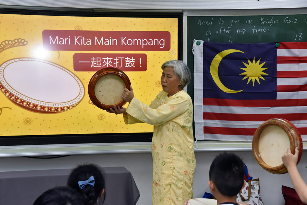隨著全球化的發展,教師帶領學生們,進行多元的互動的學習。四年級國際教育課程「新住民文化」單元,也同步在四月二十四日,再興小學邀請北新國小國際教育課程教學教師,分別是來自泰國的李拉雀薇老師及來自馬來西亞的黃寶雲老師,蒞校針對新移民相關生活環境及風土民情進行介紹,使學生了解多元文化意涵並互相尊重,拓展更豐富的國際視野。二位老師都特別換上了國服,帶來許多家鄉文物,李拉老師也用心的準備了泰國的傳統服飾-沙龍,學生們輪流上台體驗,傳統服飾走秀與互動小問答活動,讓大家在輕鬆有趣的氛圍中彼此學習、交流,充滿歡笑與驚喜。寶雲老師今天特別帶來數個手鼓,親自讓同學們一起體驗一下,並共同敲奏曲目《Mari Kita Main Kompang》,初次嘗試的孩子們,覺得新鮮又有趣,不同位置敲擊手鼓有不同的音色,孩子們手忙腳亂,卻也樂在其中。老師們在四年級各班進行精采的文化交流分享,這些分享不僅是對學生學習的啟發,也讓我們對國際教育有了更深的理解。